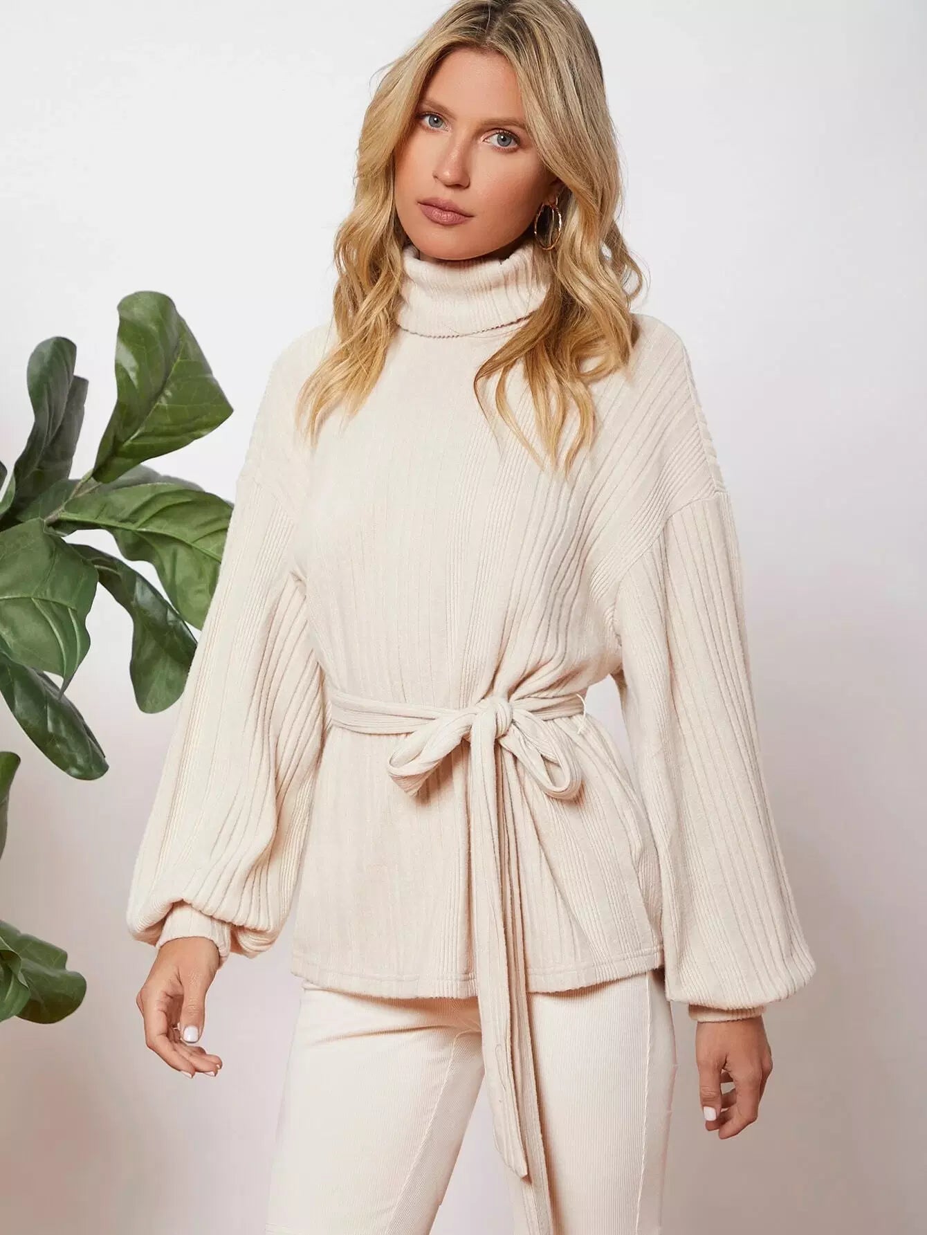 Funnel Neck Lantern Sleeve Rib-knit Sweater Without Belt