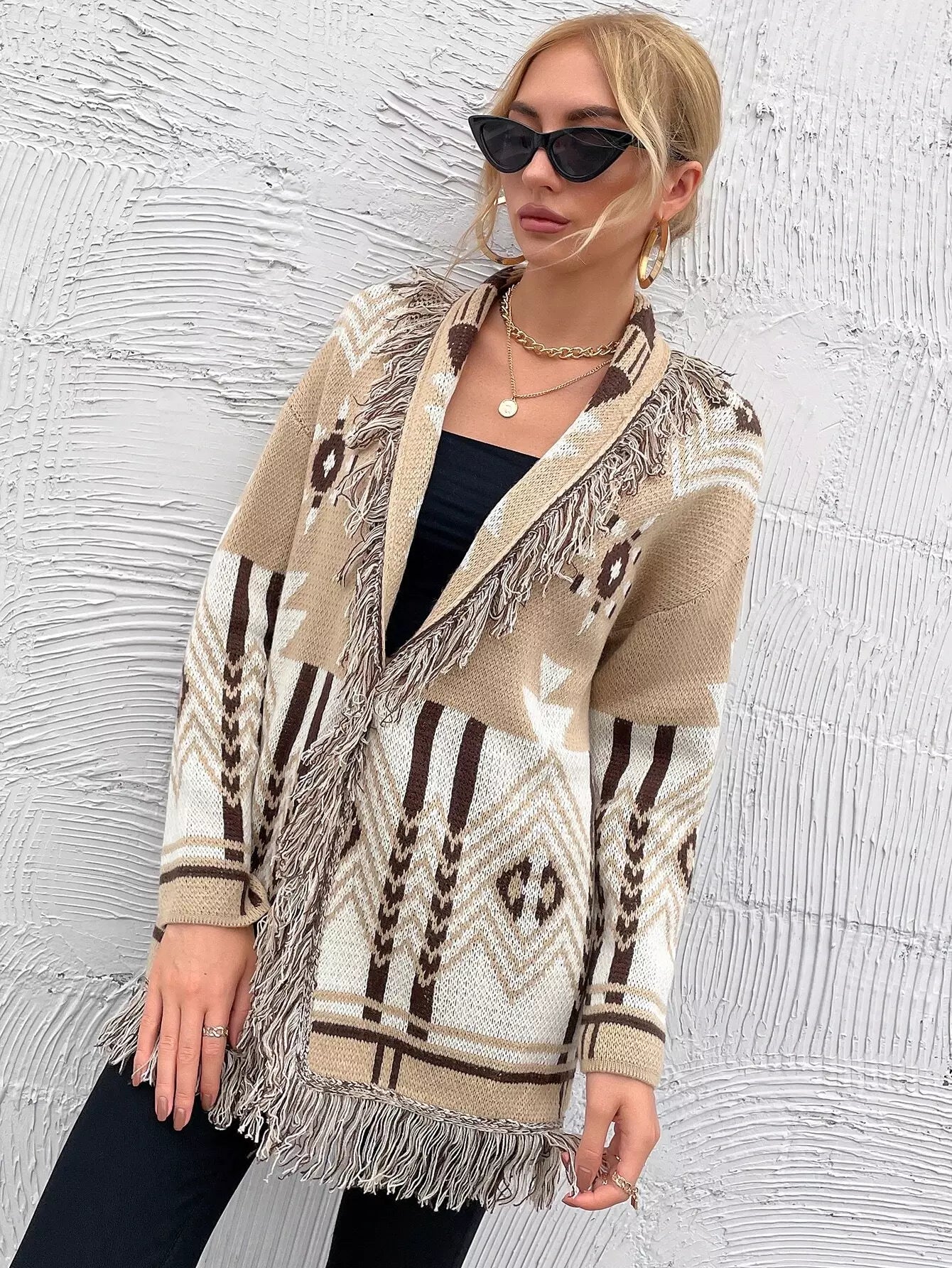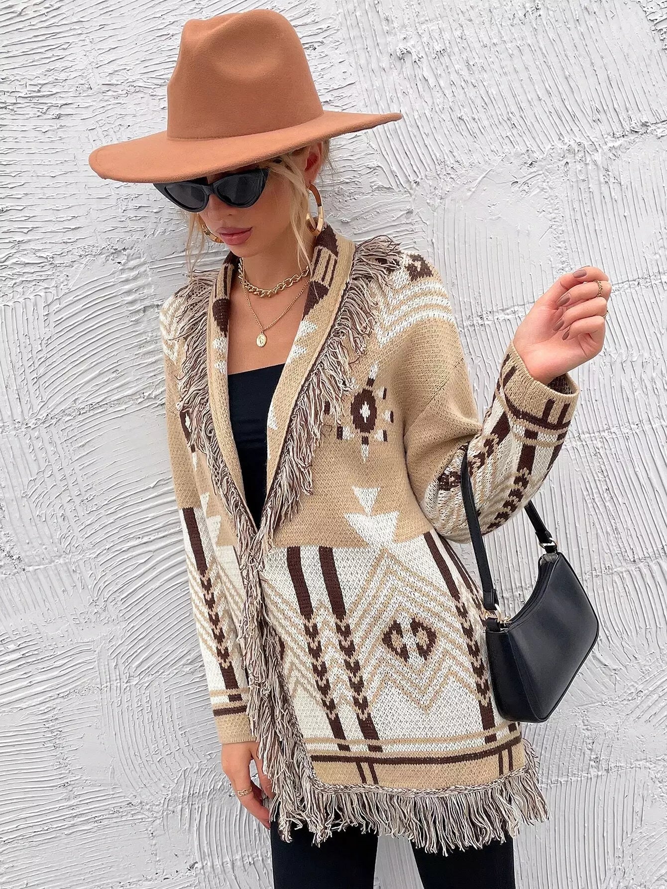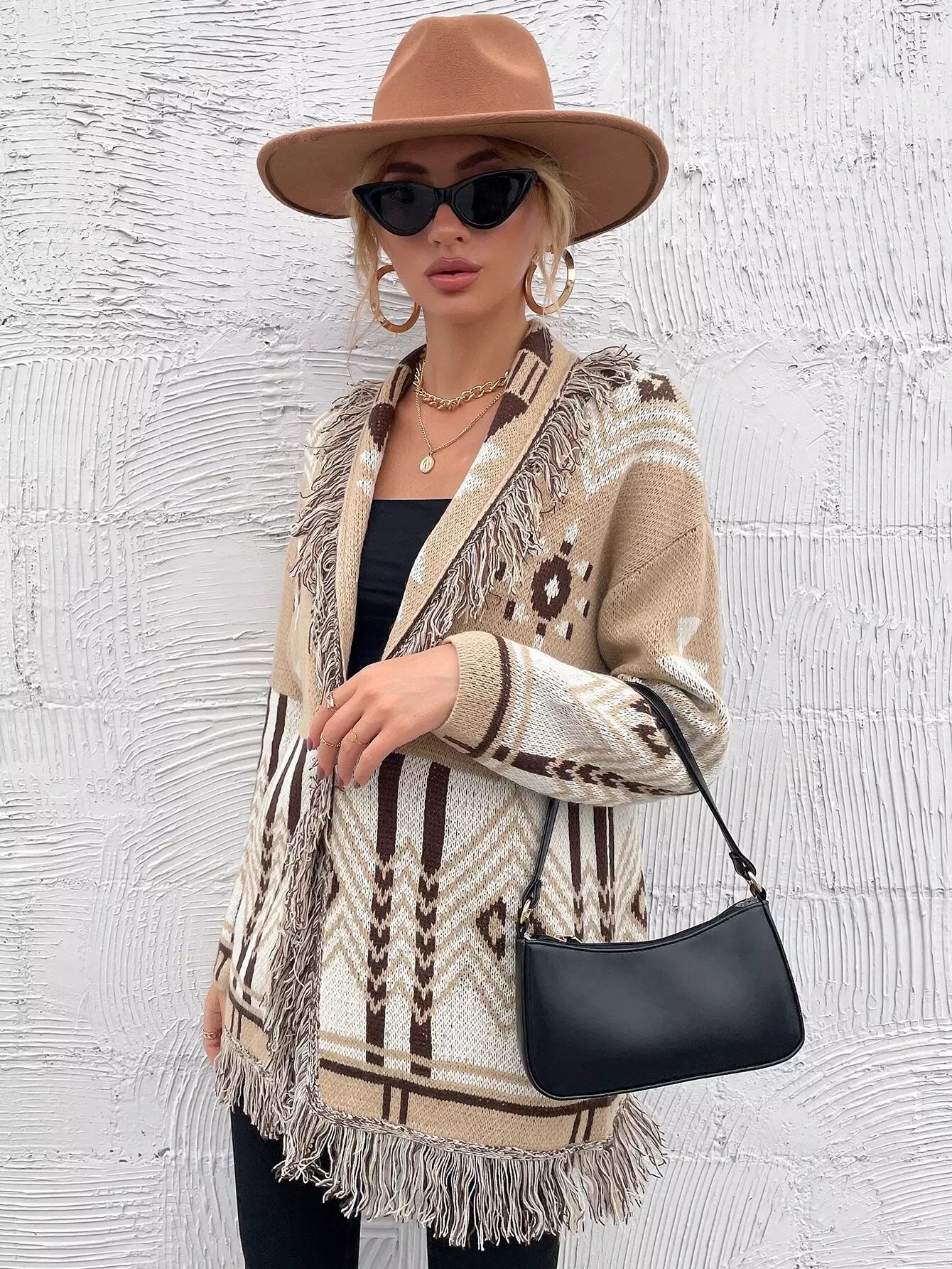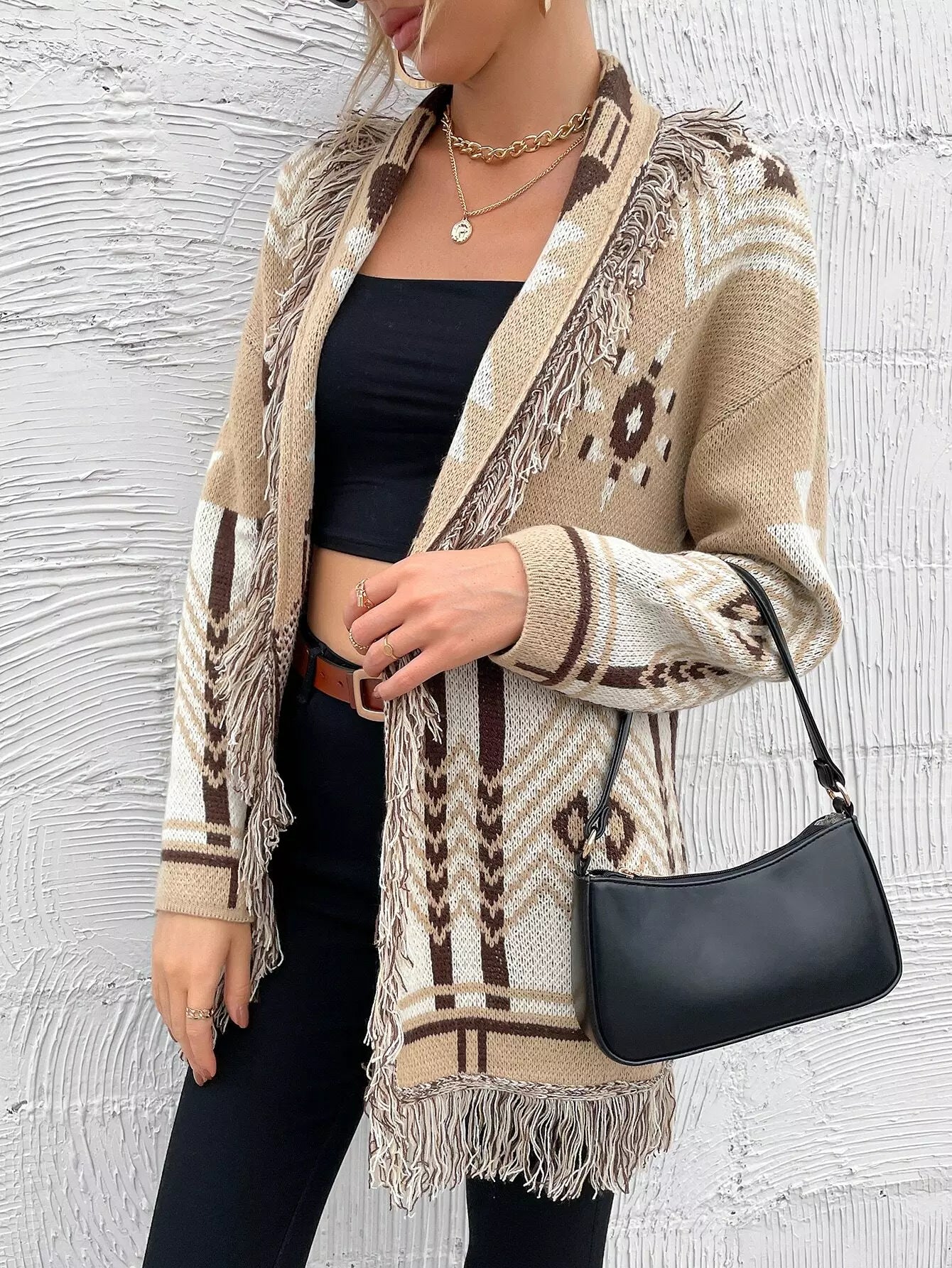 Geo Pattern Drop Shoulder Fringe Trim Cardigan