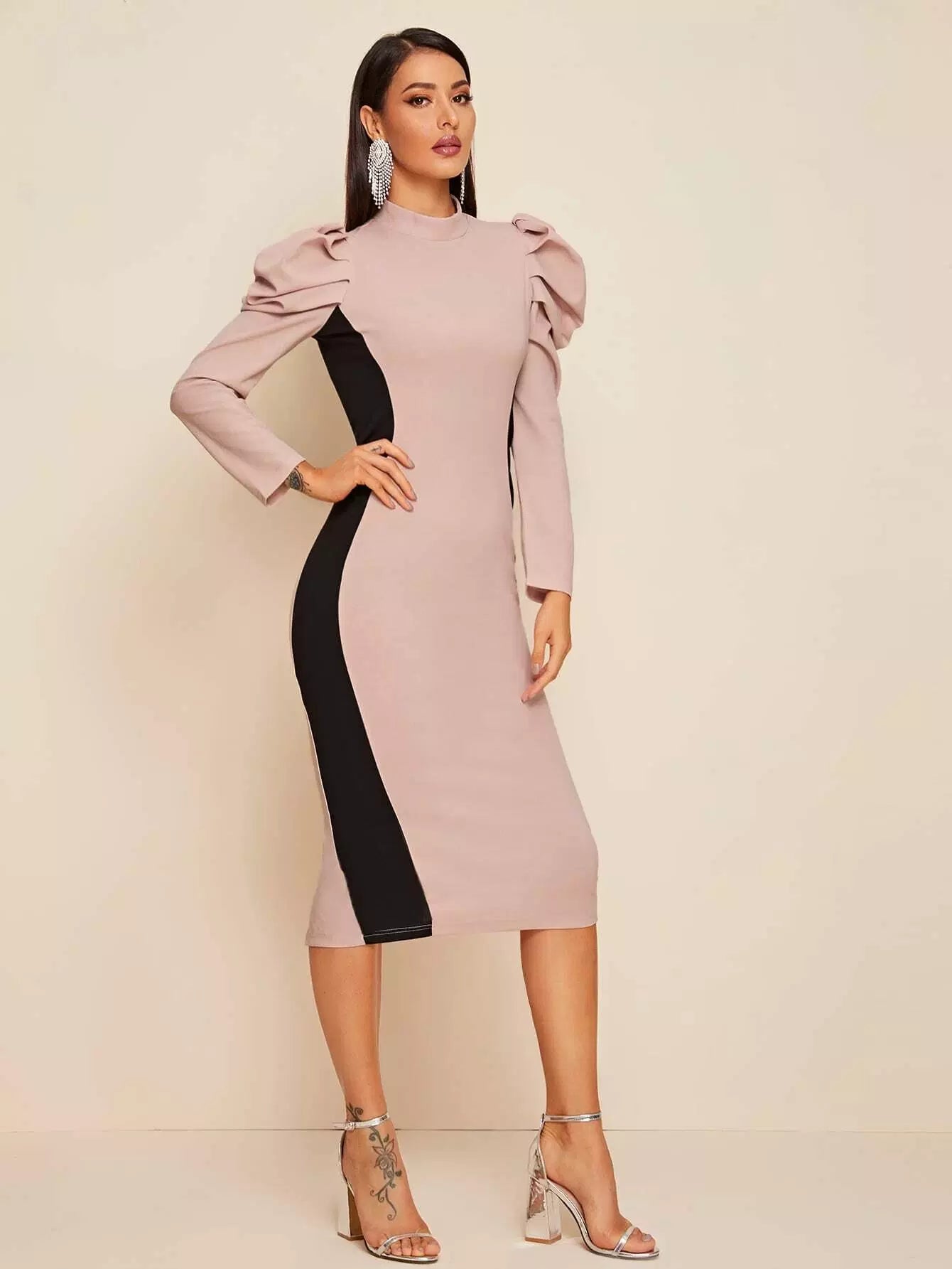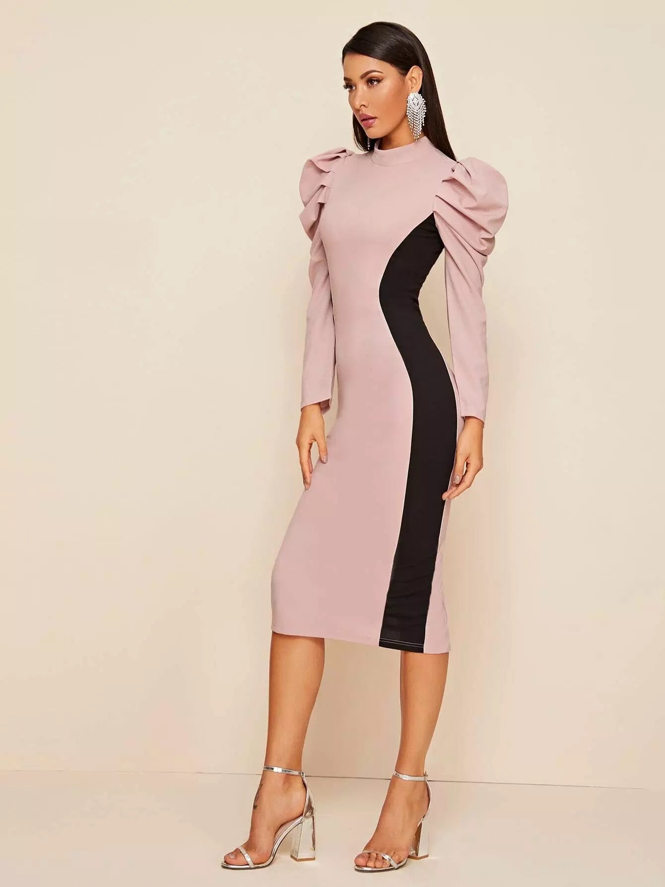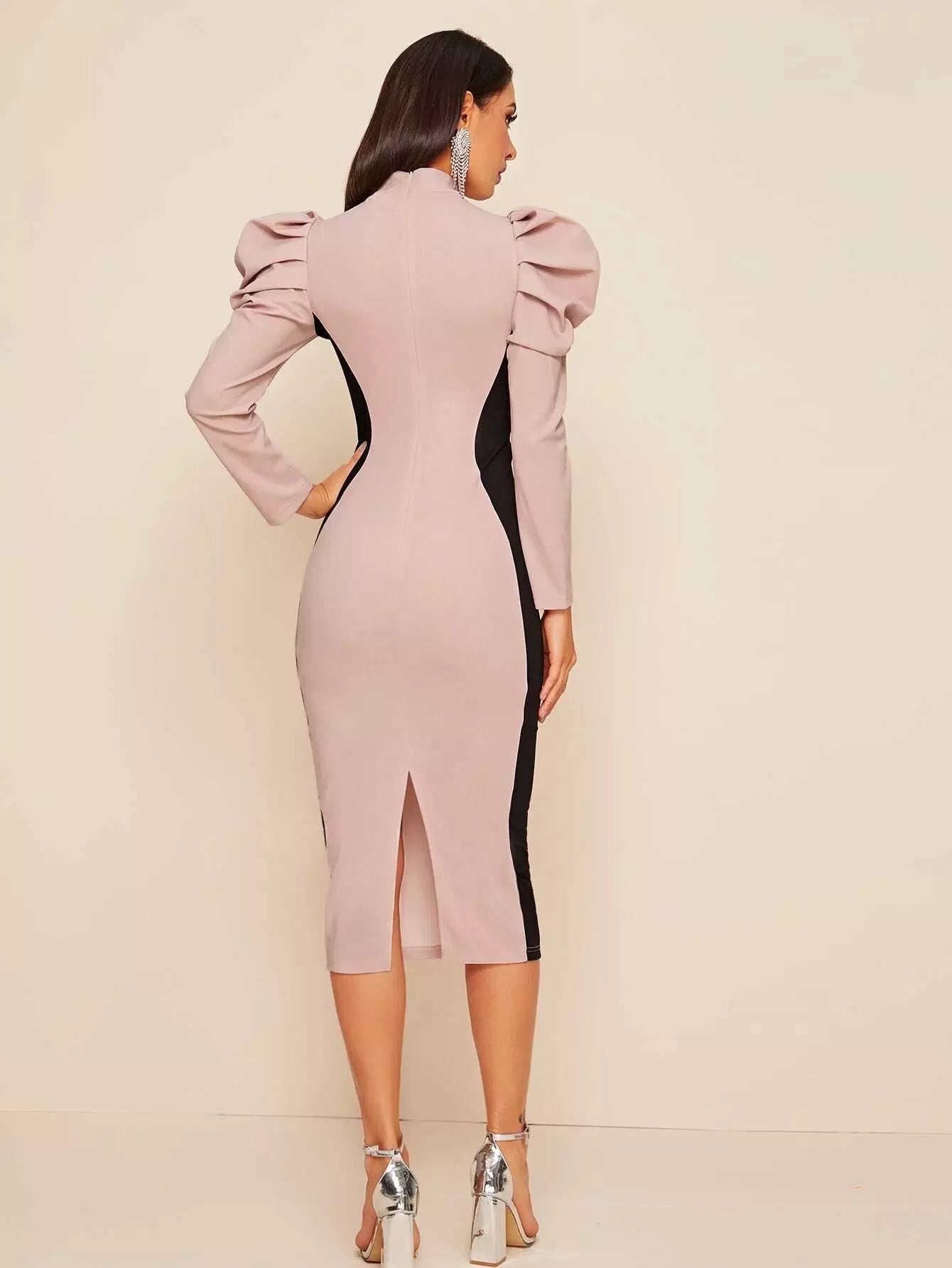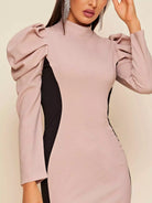 Gigot Sleeve Split Hem Colorblock Dress
