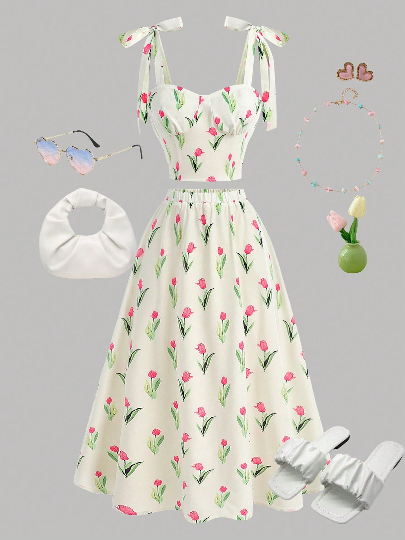 Girlism Teen Girls Allover Floral Print Cami Shoulder Bowknot Lace Up Summer Top & Skirt, Festival,Elegant