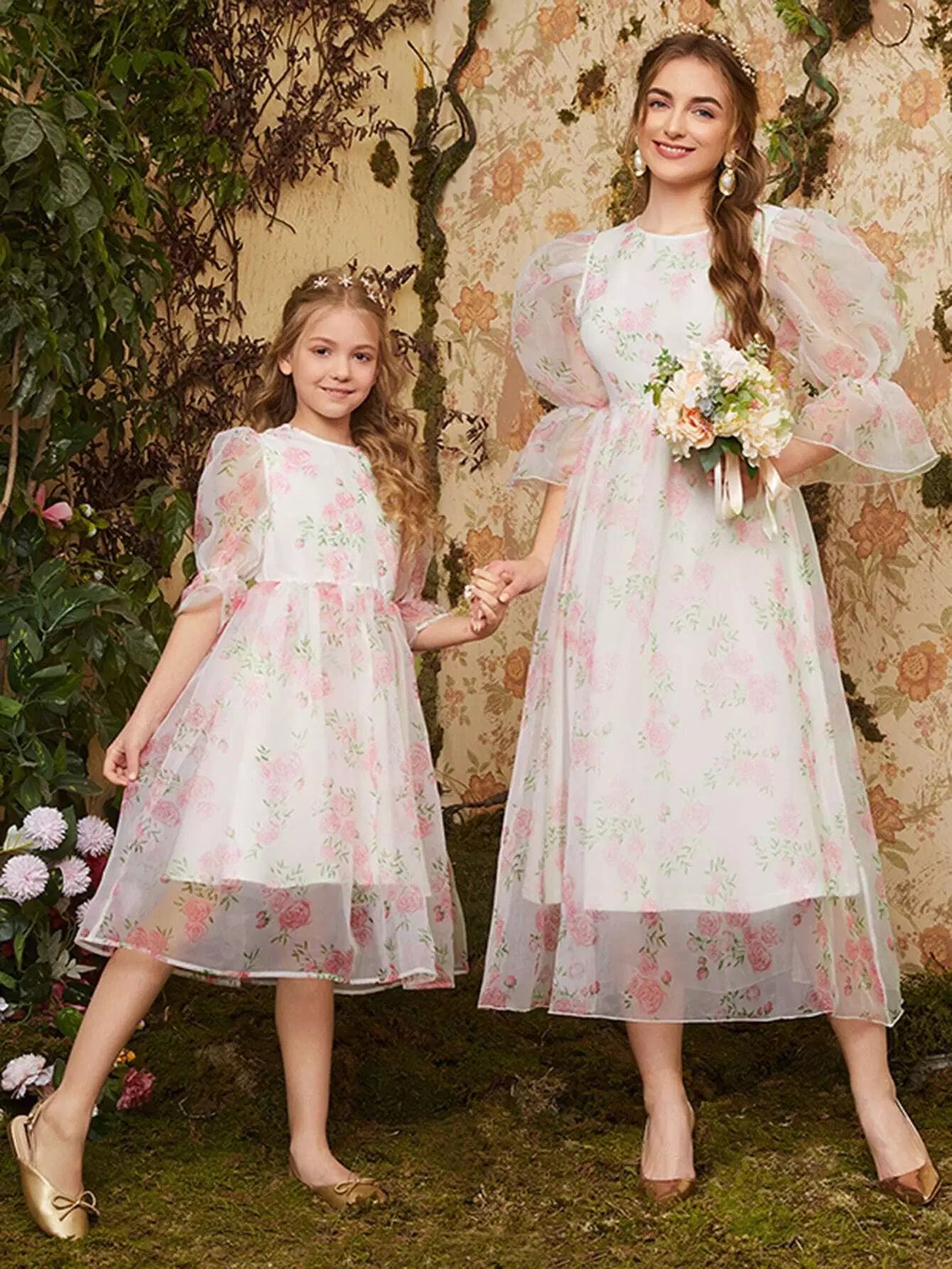 Girls 1PC Flounce Sleeve Floral Mesh Dress