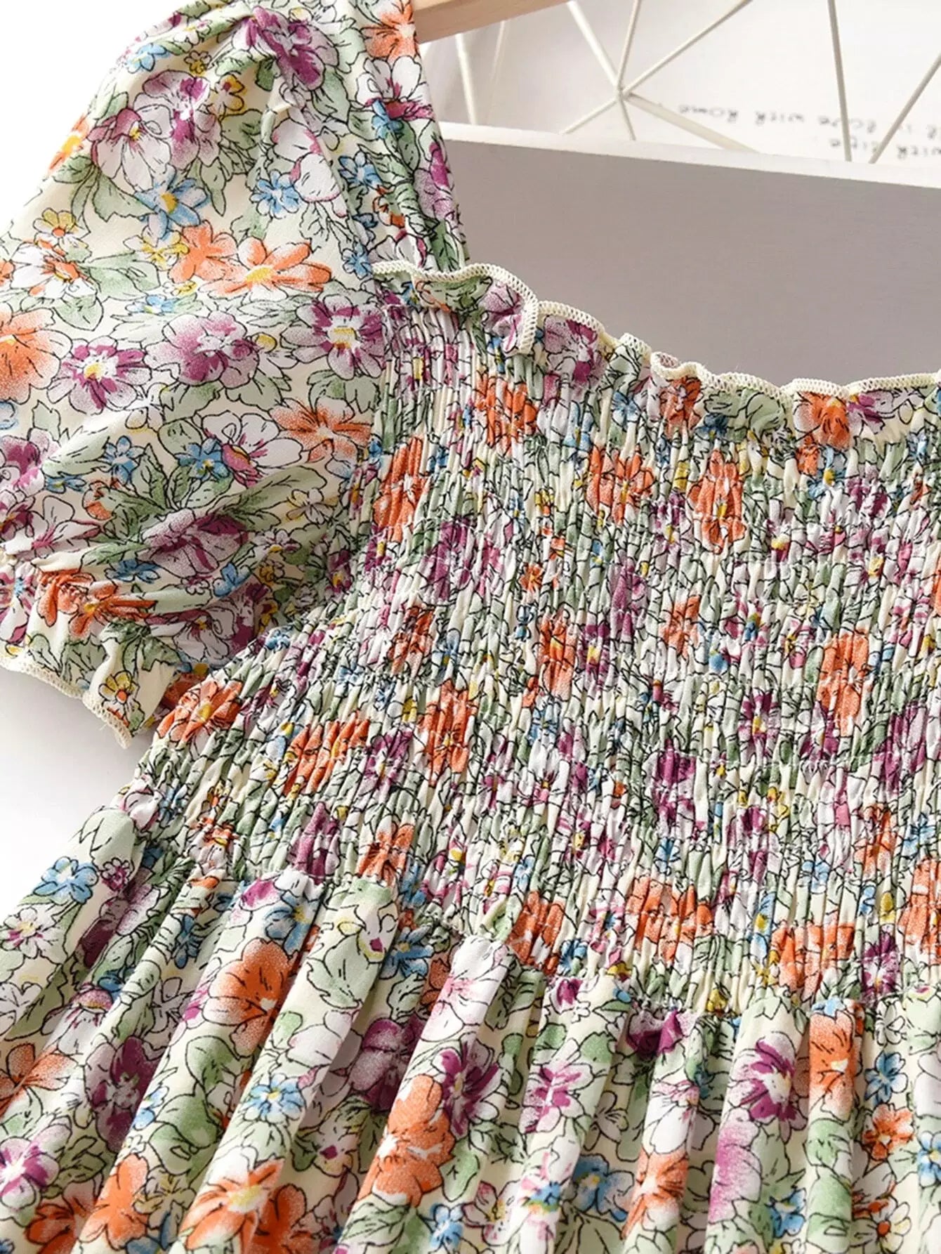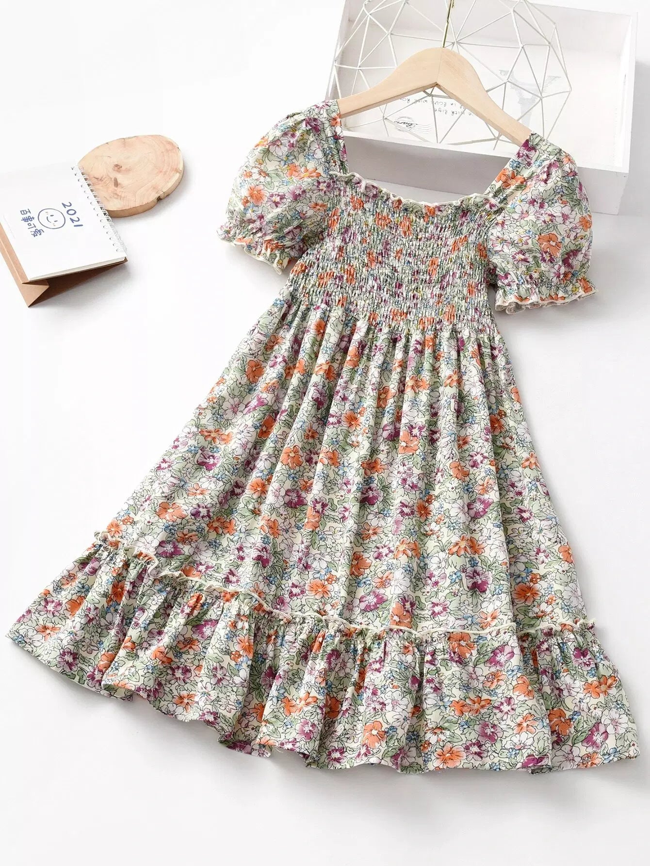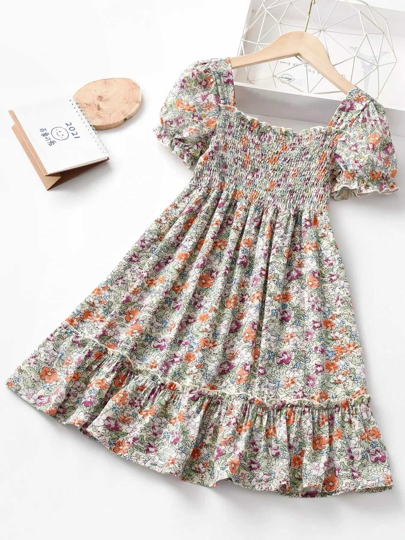 Girls Allover Floral Print Ruffle Hem Puff Sleeve Dress