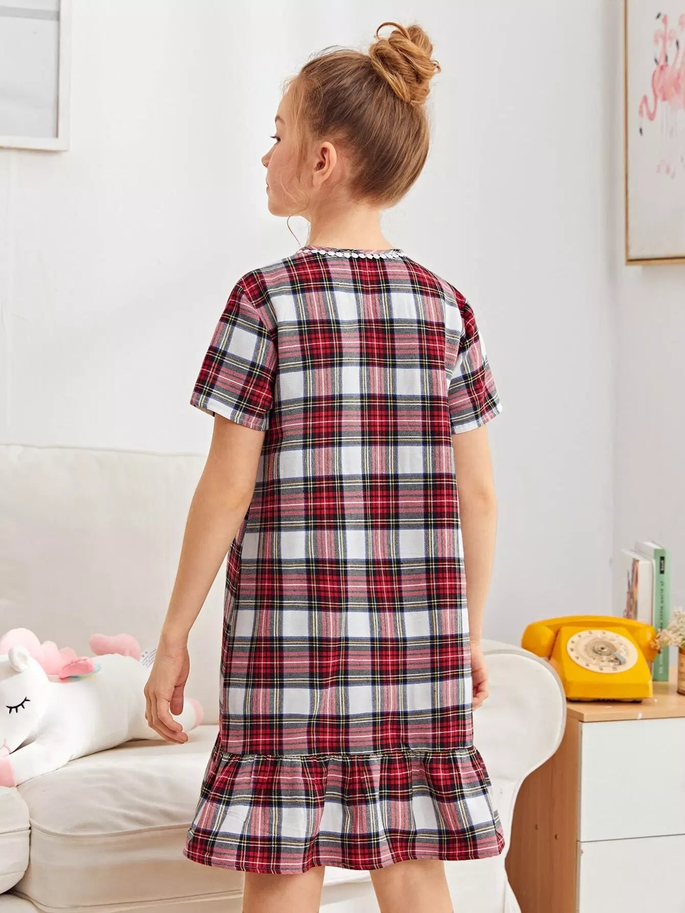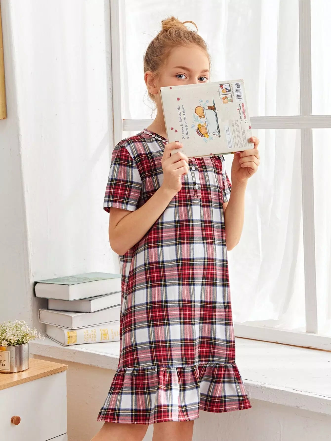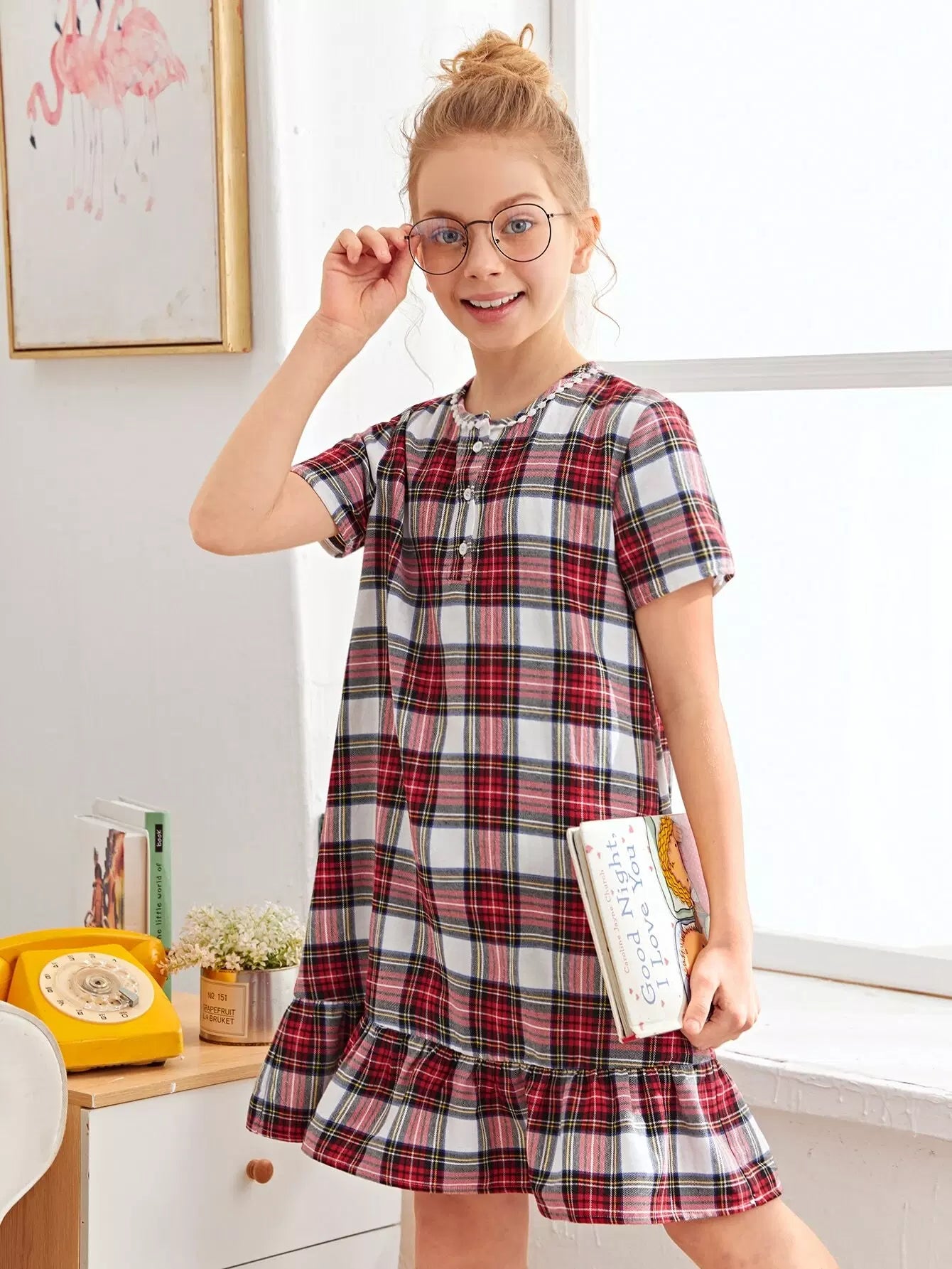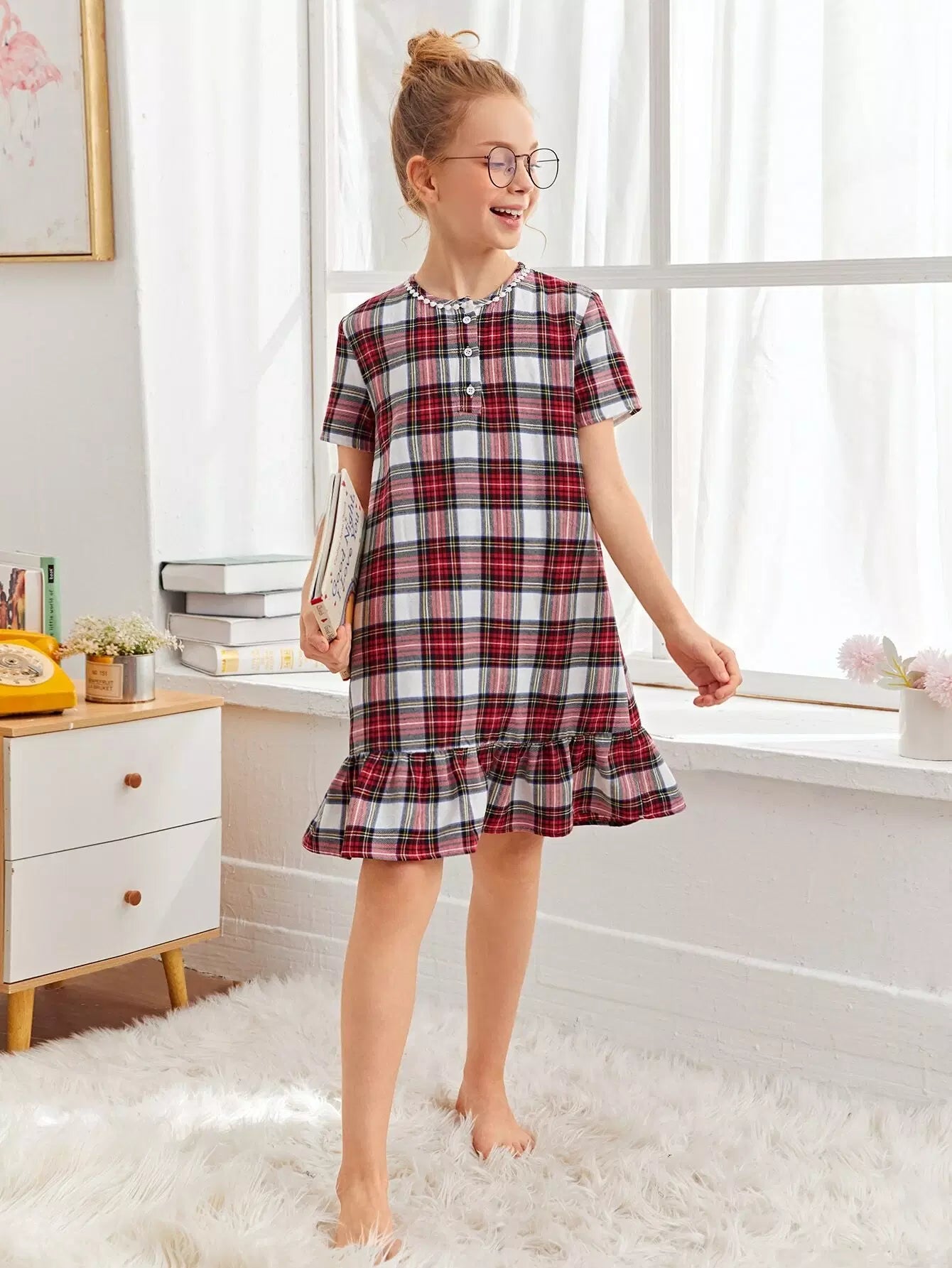 Girls Buttoned Front Ruffle Hem Tartan Nightdress