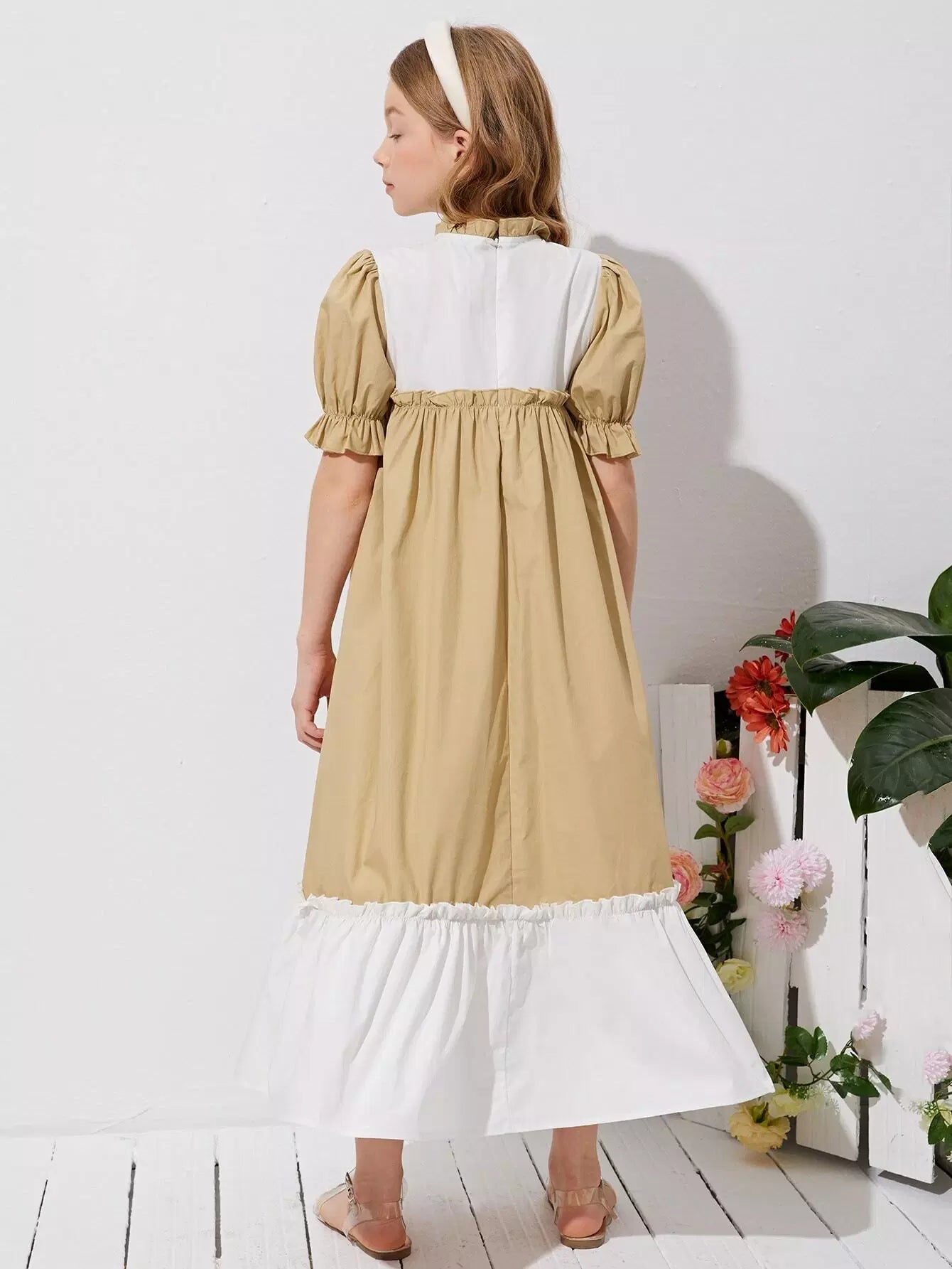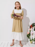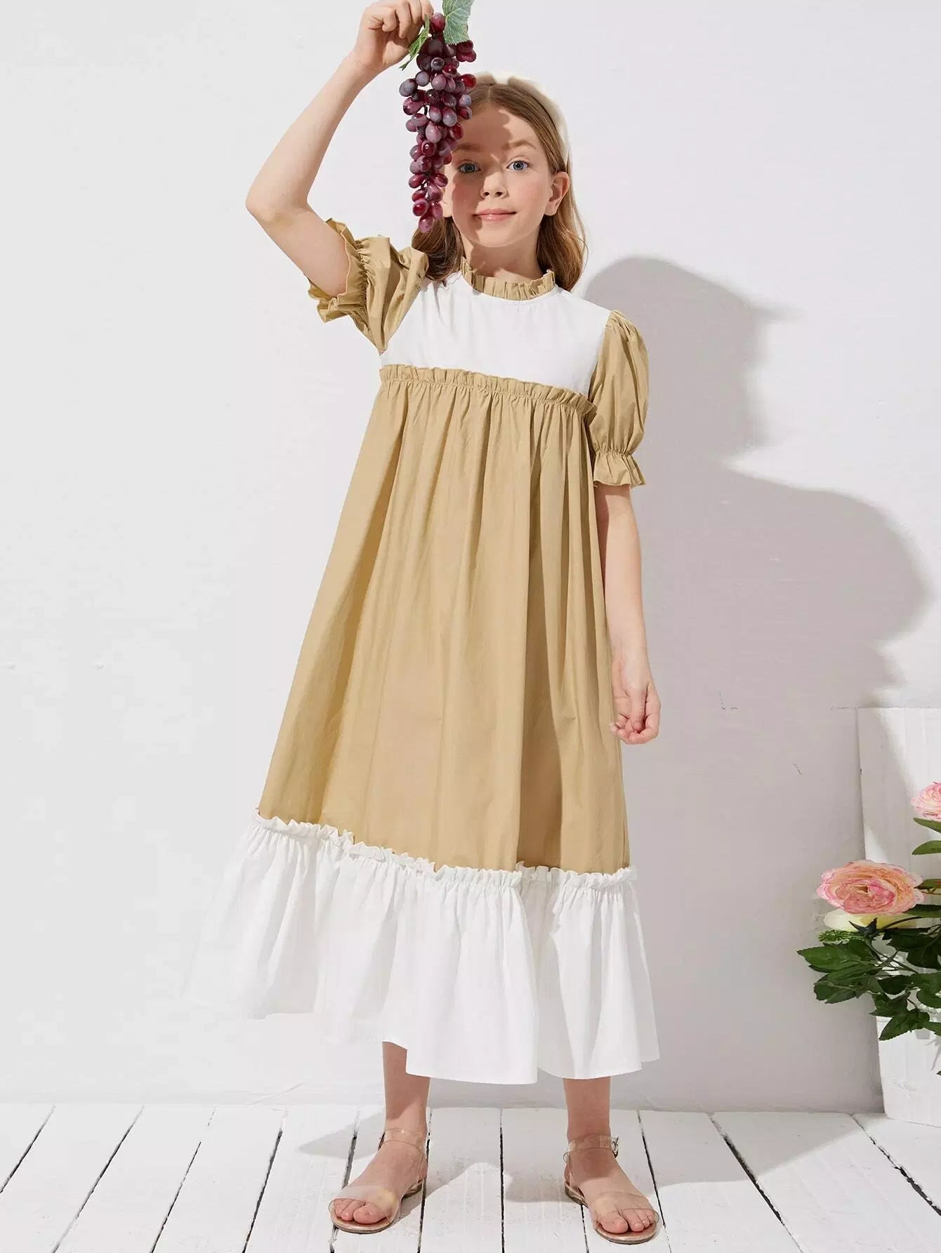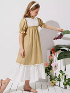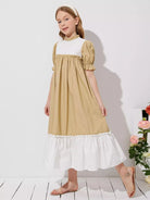 Girls Colorblock Frill Neck Puff Sleeve Dress