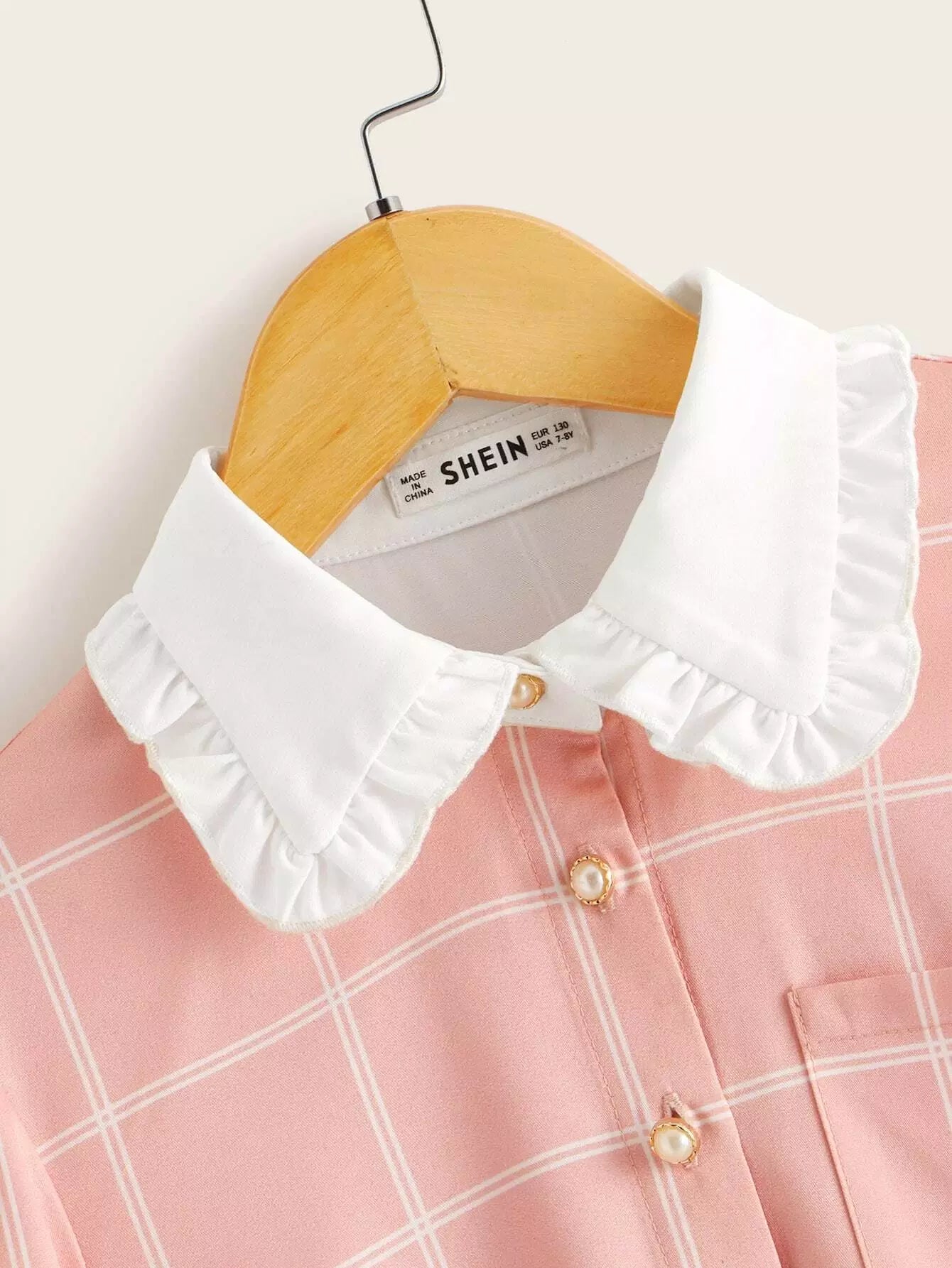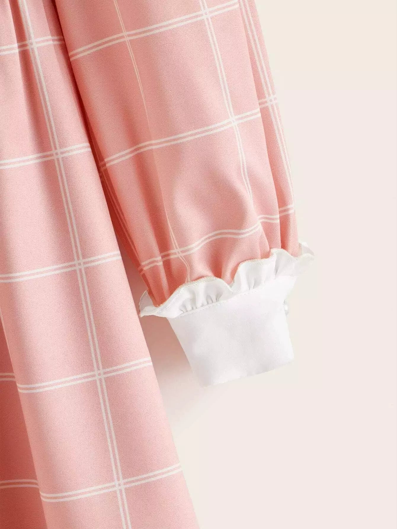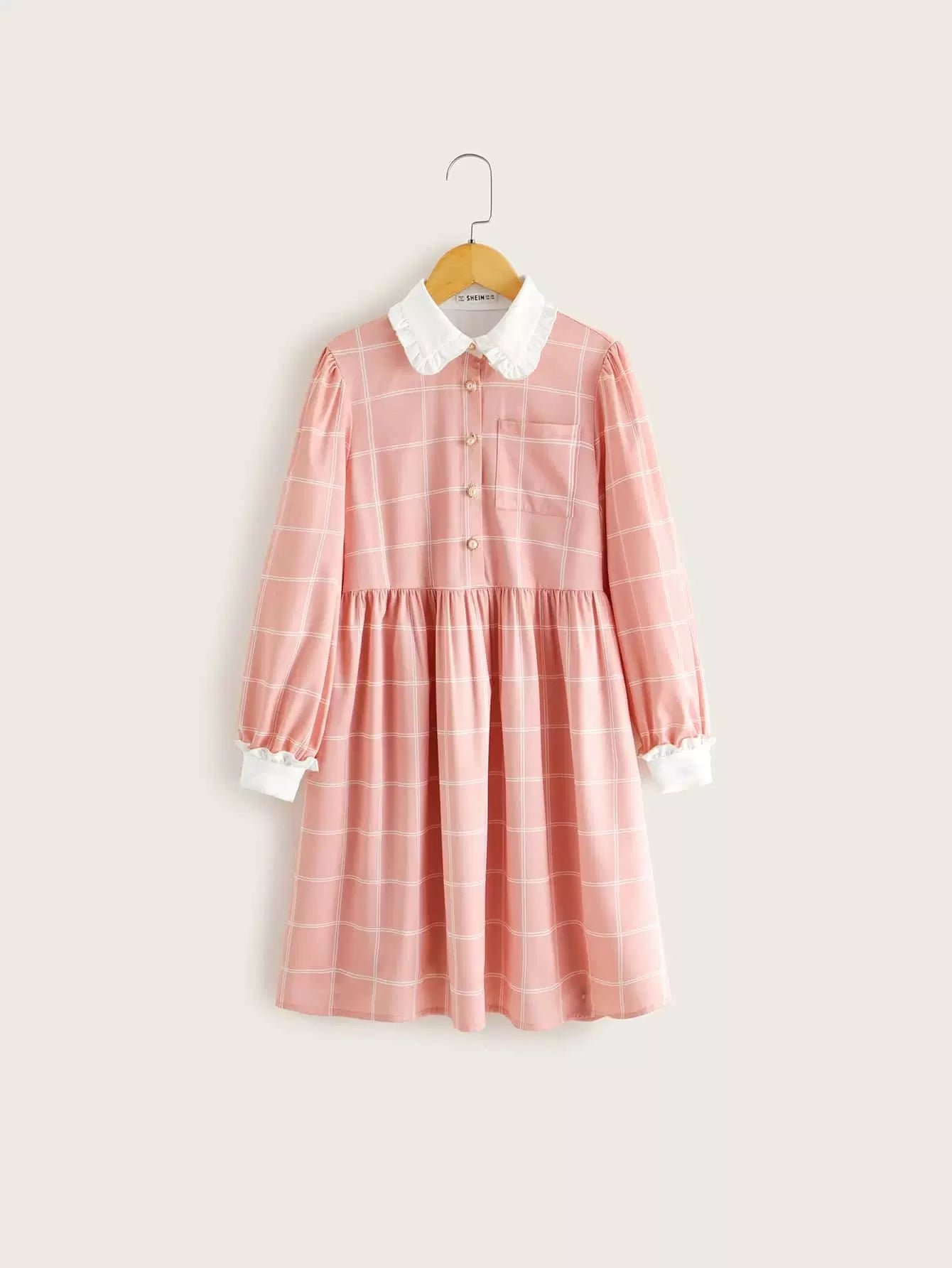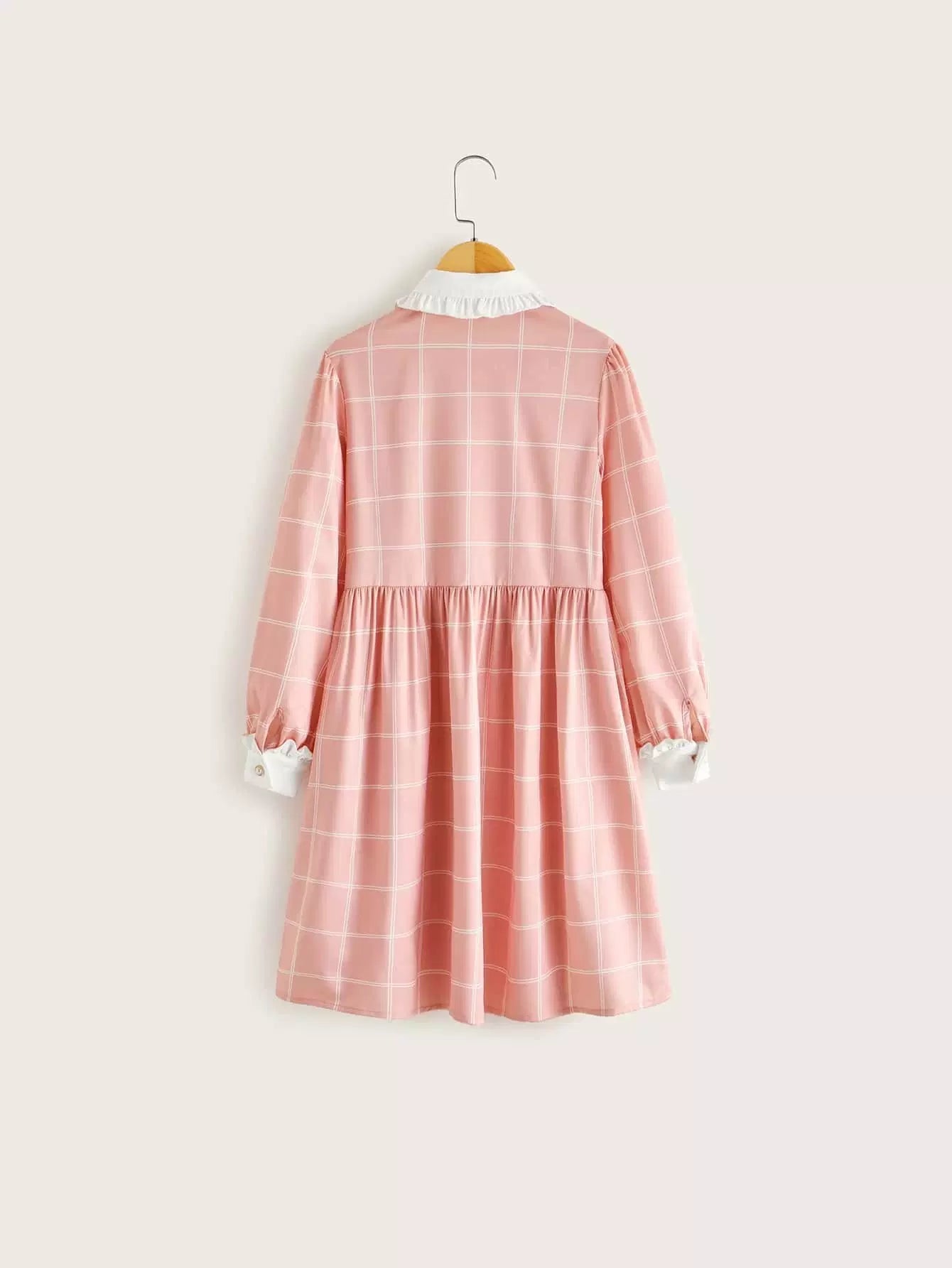 Girls Contrast Collar Buttoned Front Plaid Dress