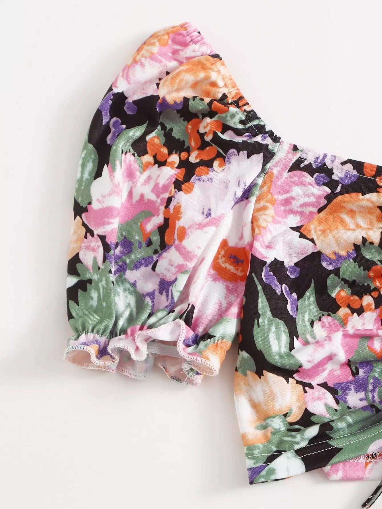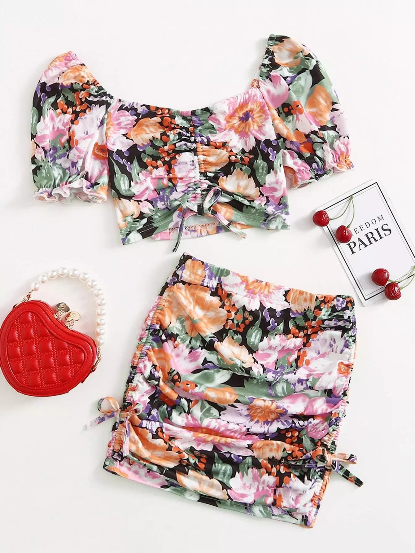 Girls Floral Print Puff Sleeve Drawstring Ruched Crop Top & Skirt Set