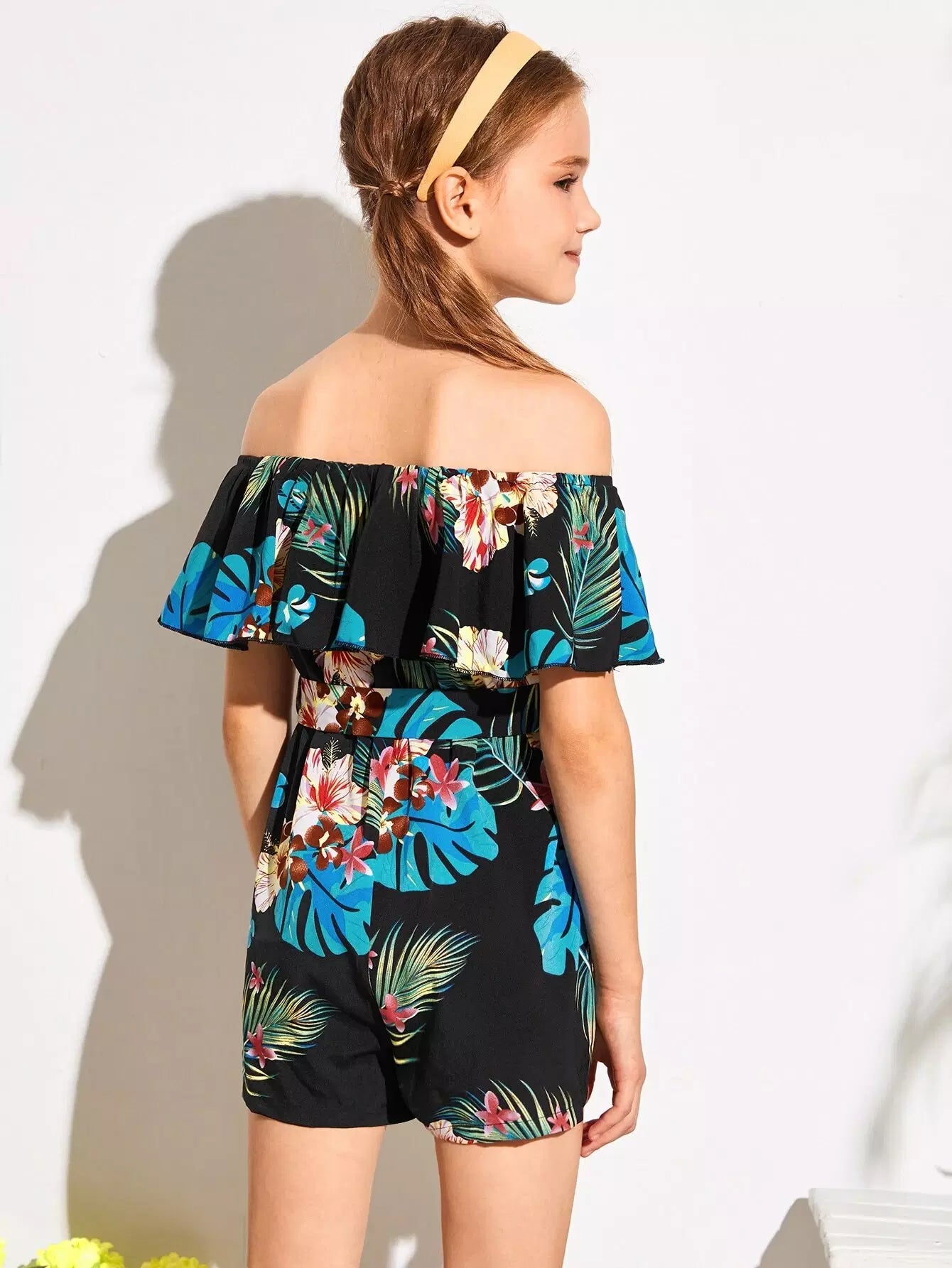 Girls Flounce Off Shoulder Self Tropical Romper Without Belt