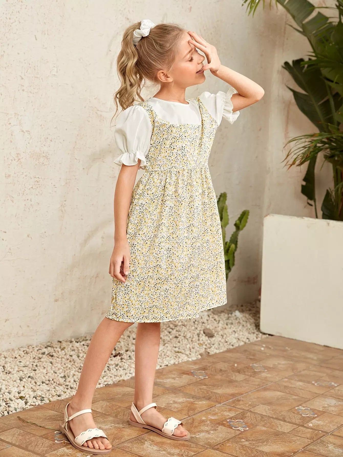 Girls Flounce Sleeve Ditsy Floral Colorblock 2 In 1 Dress