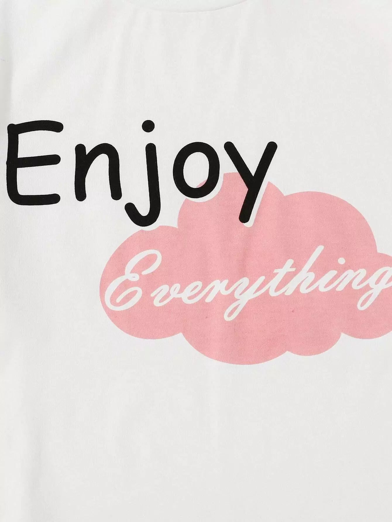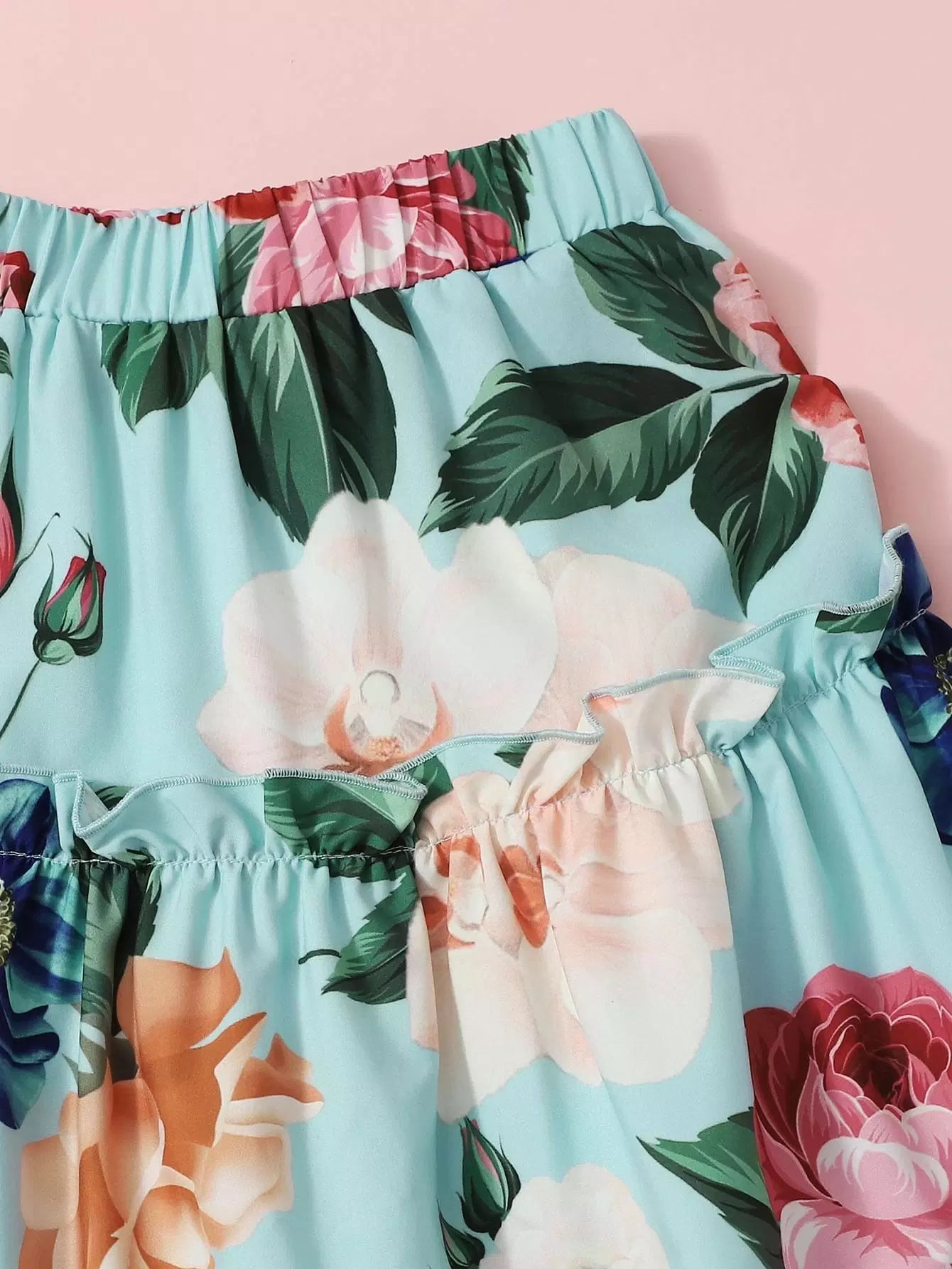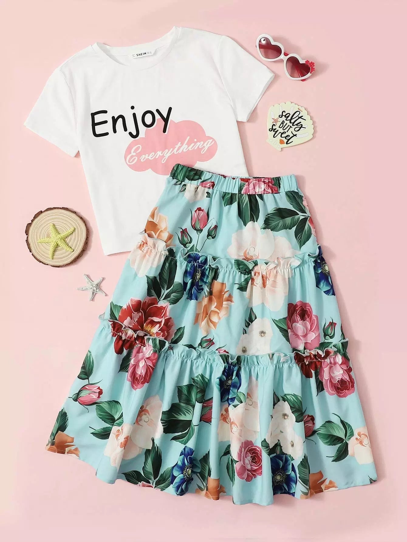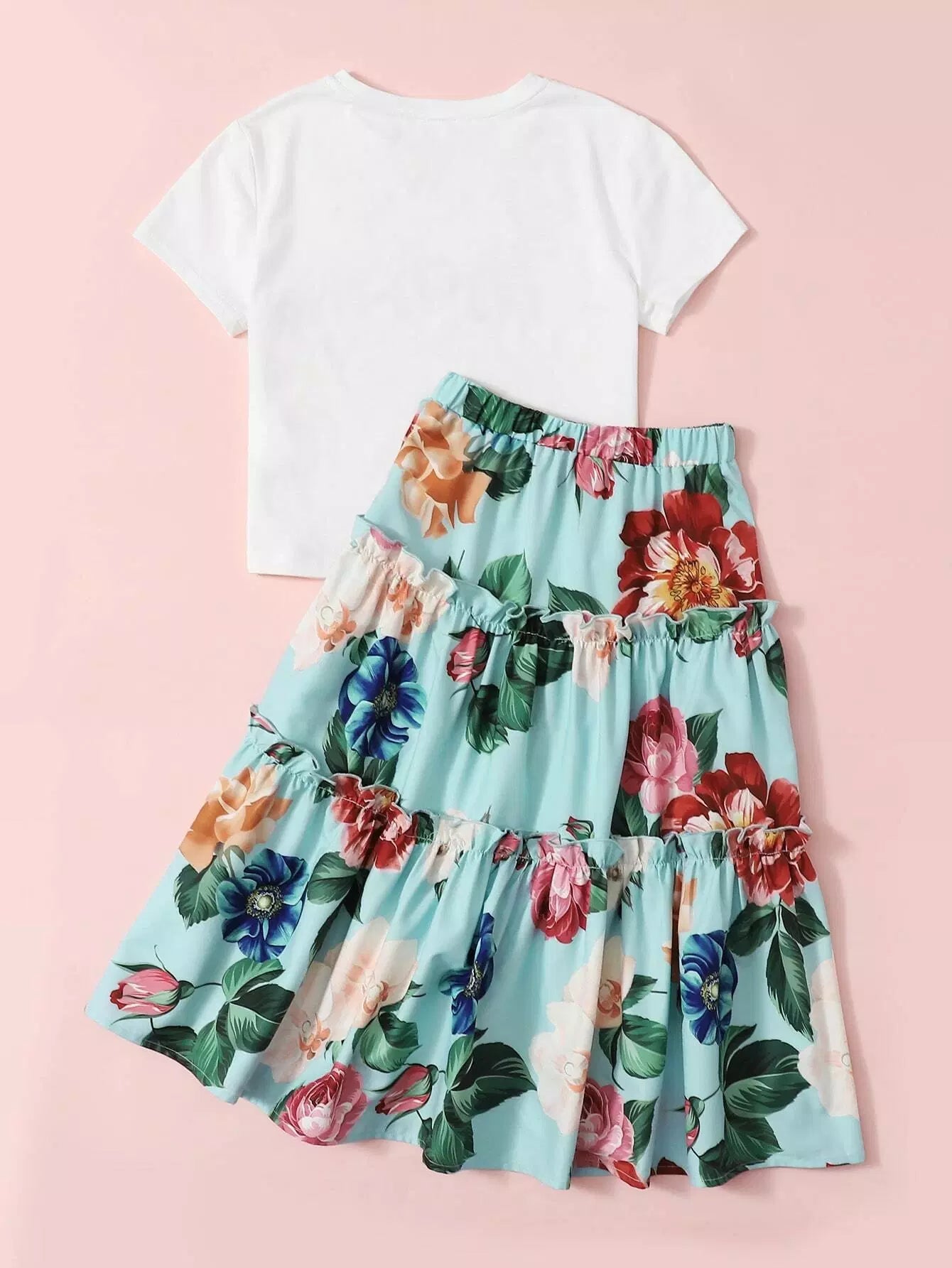 Girls Graphic Tee & Floral Print Ruffled Skirt Set