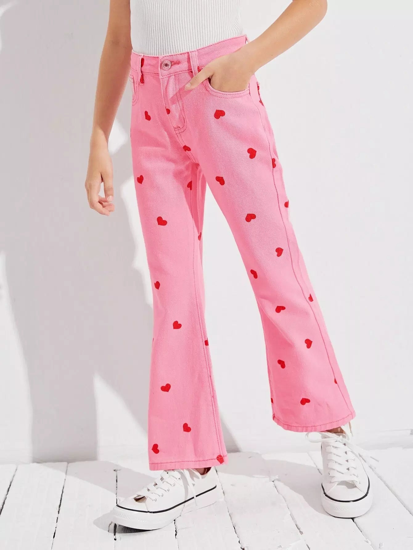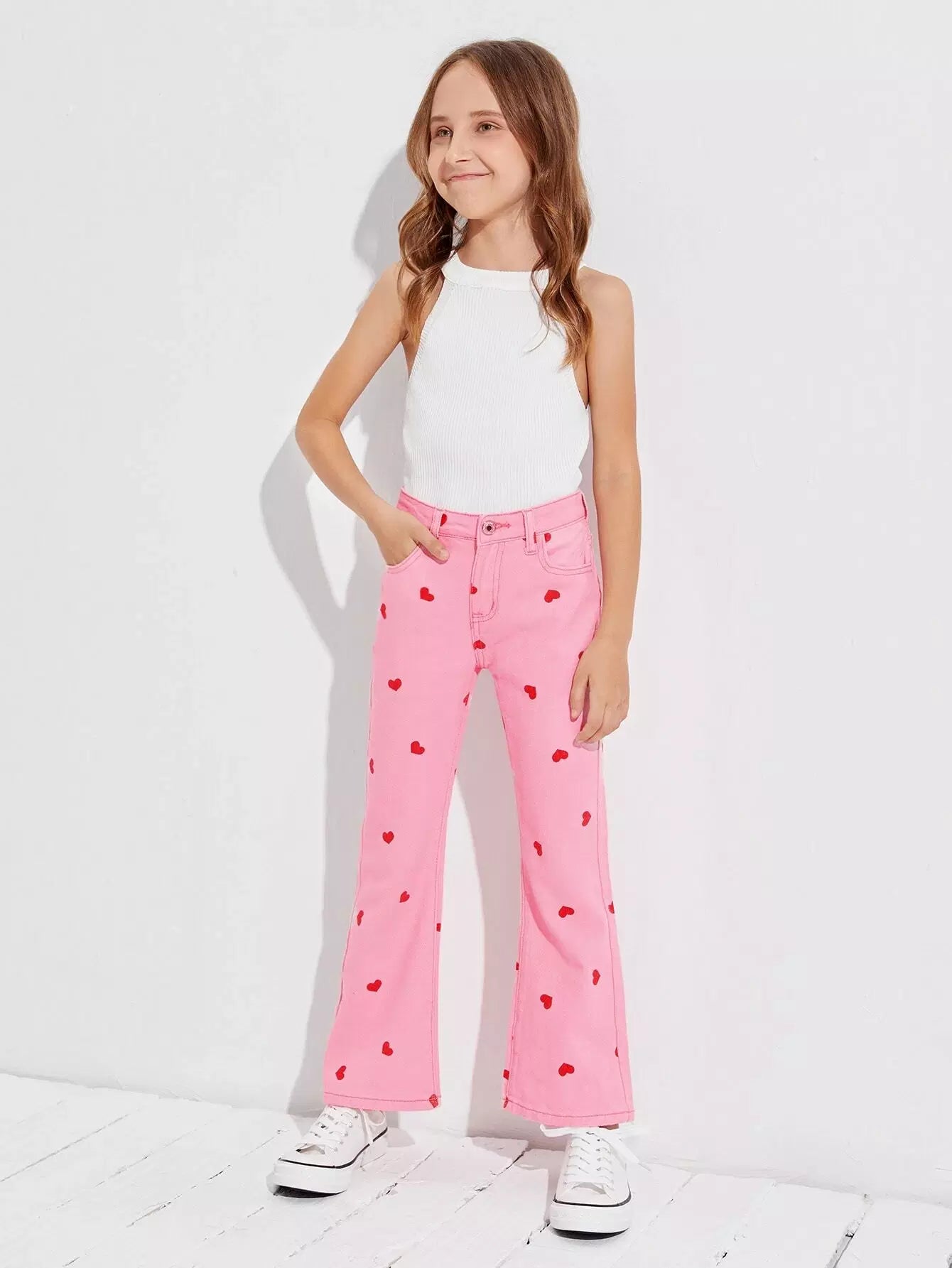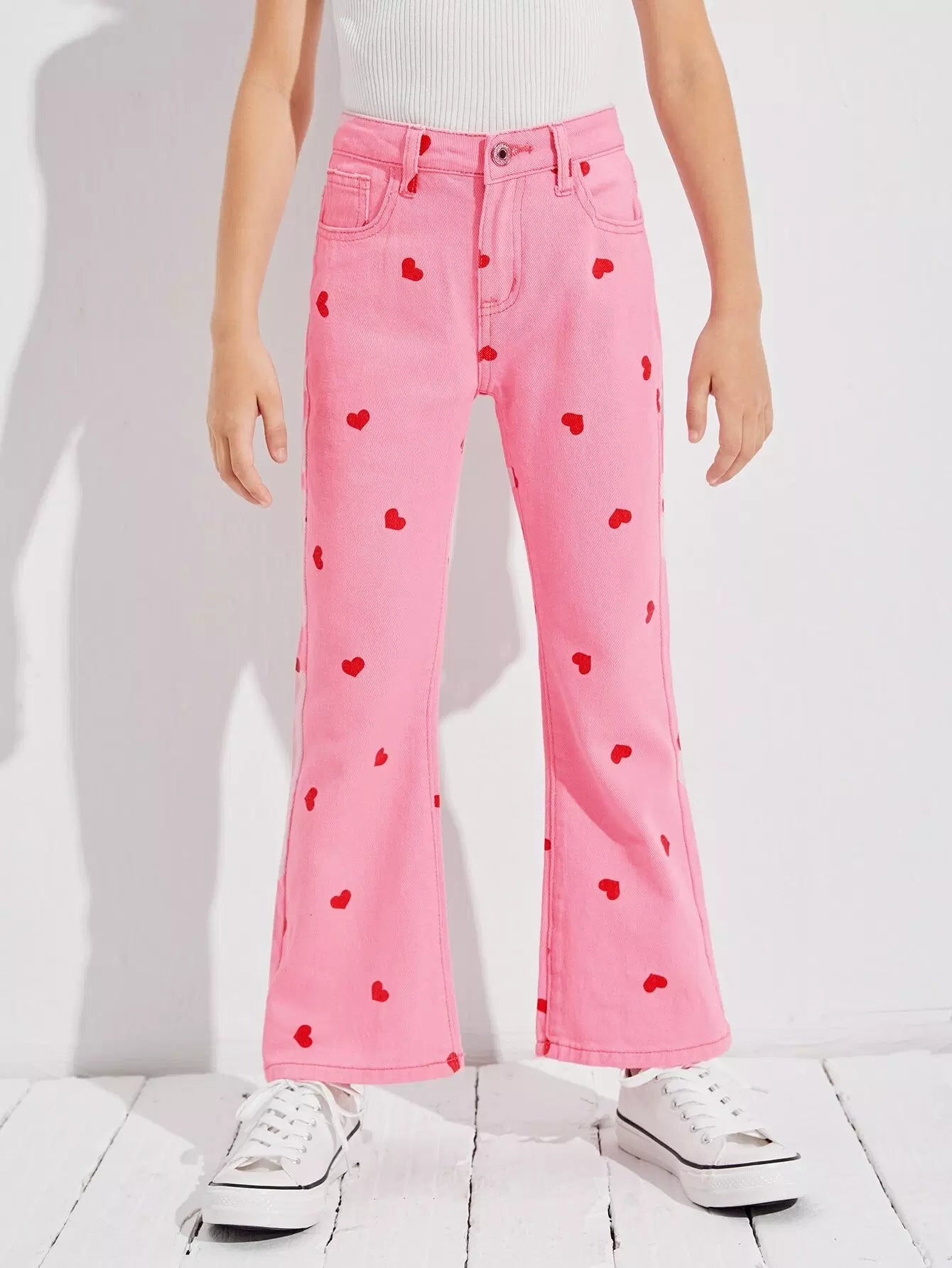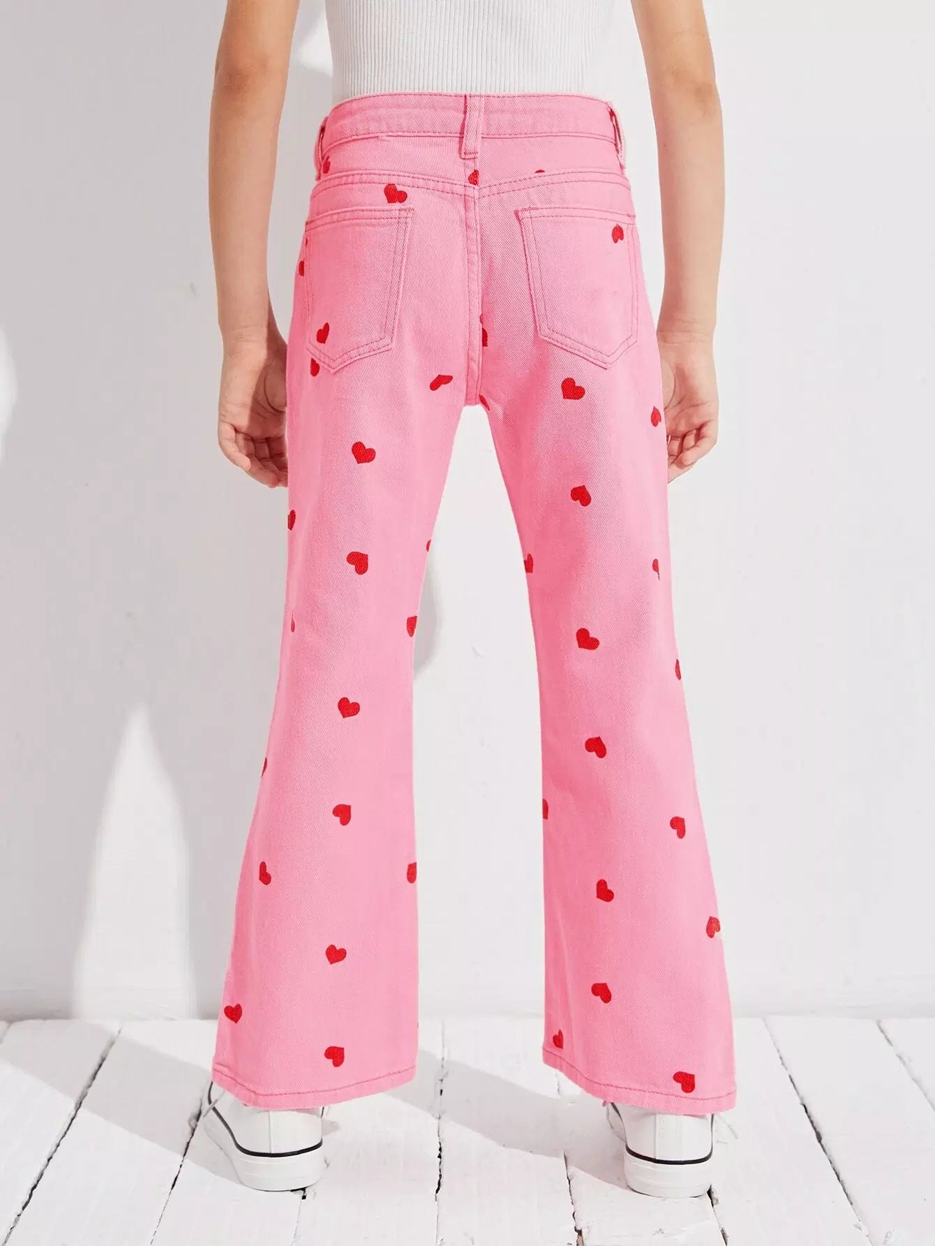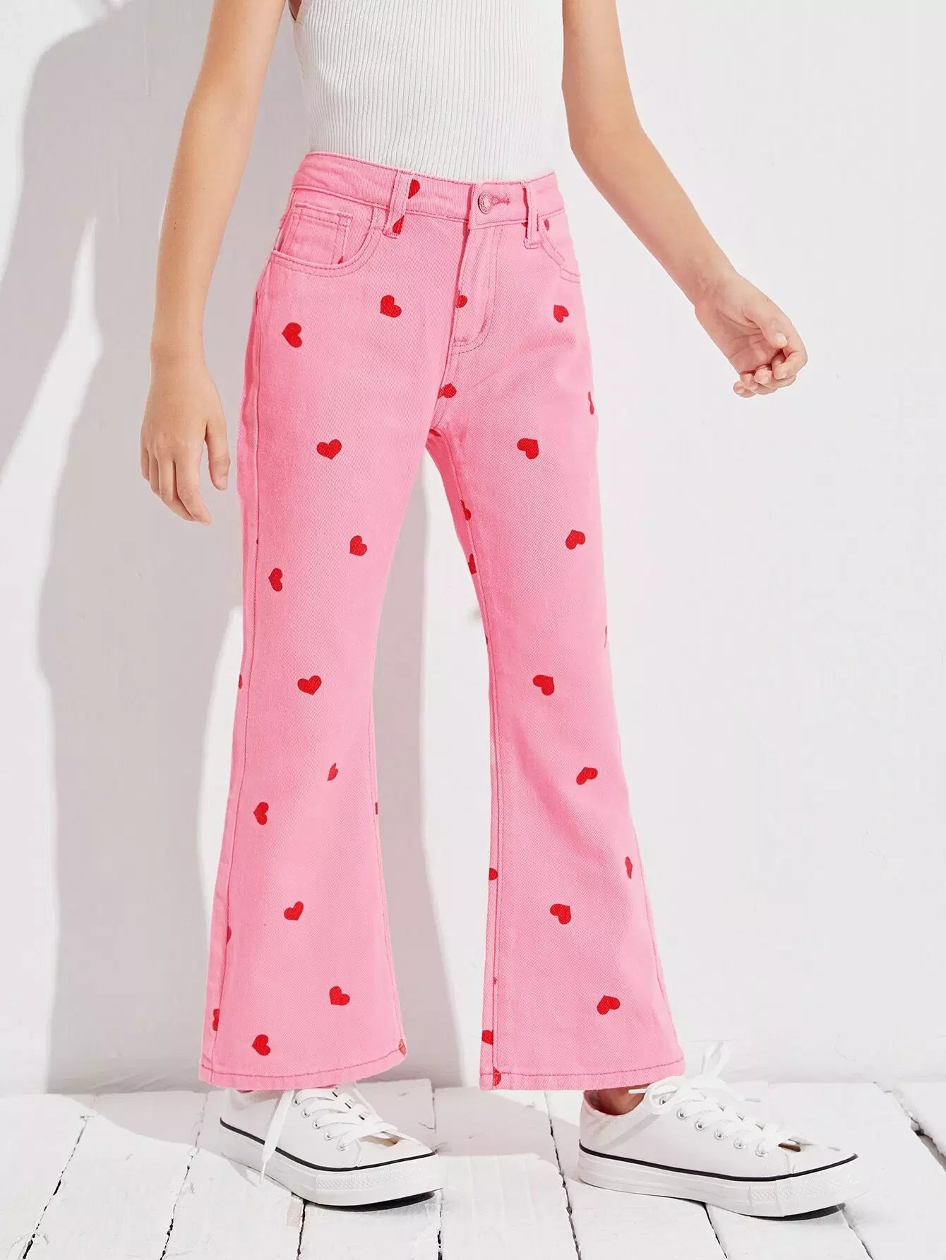 Girls Heart Print Zipper Fly Flare Leg Jeans