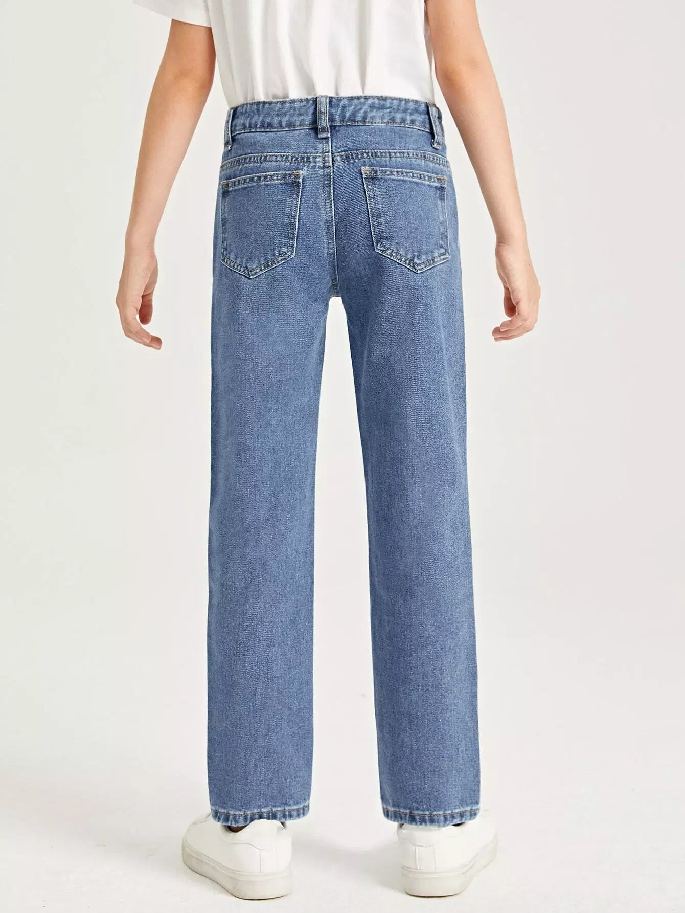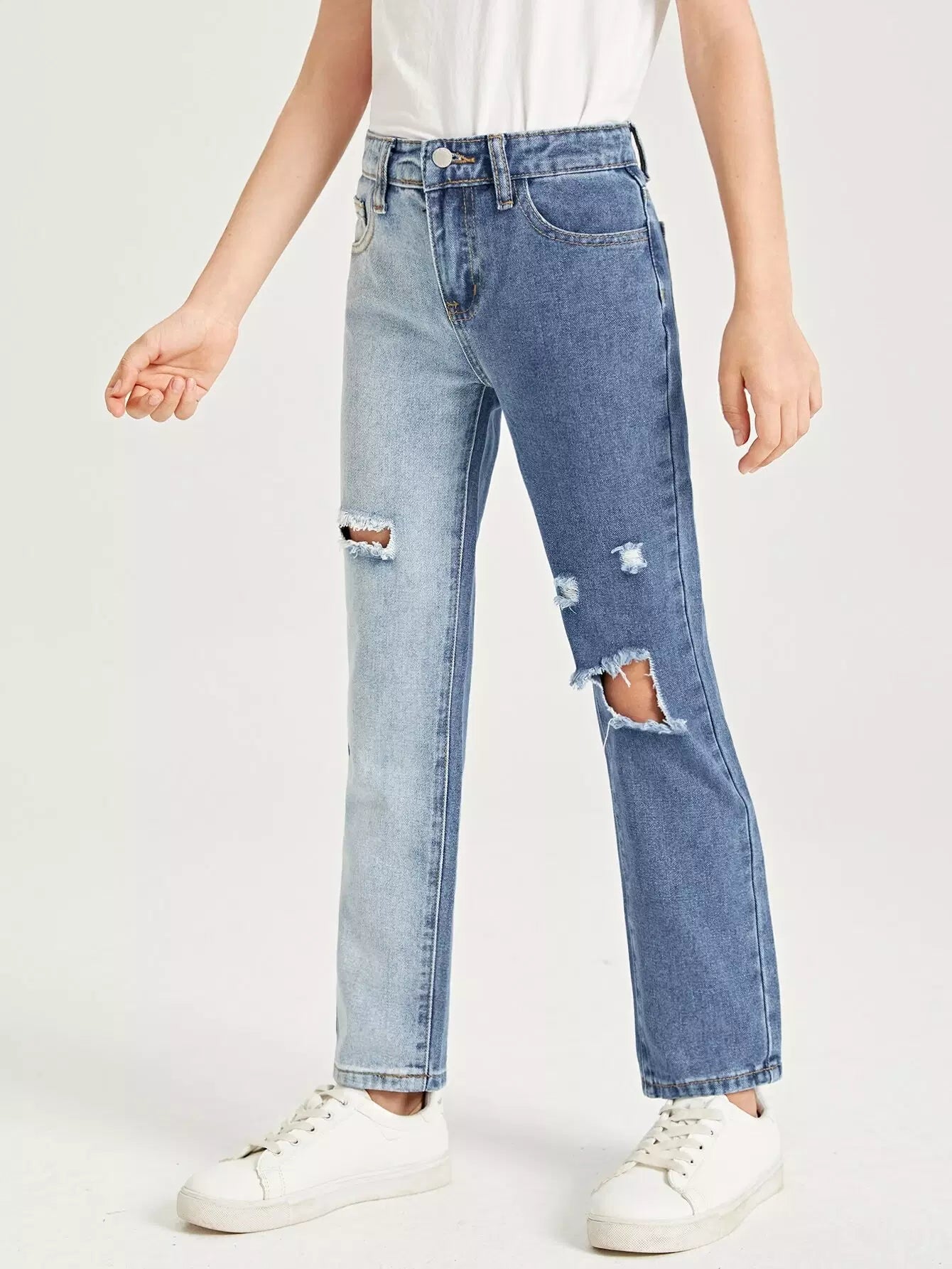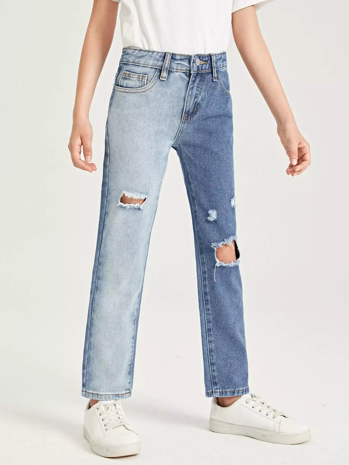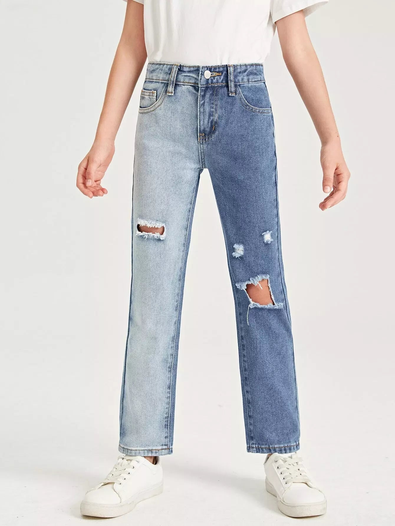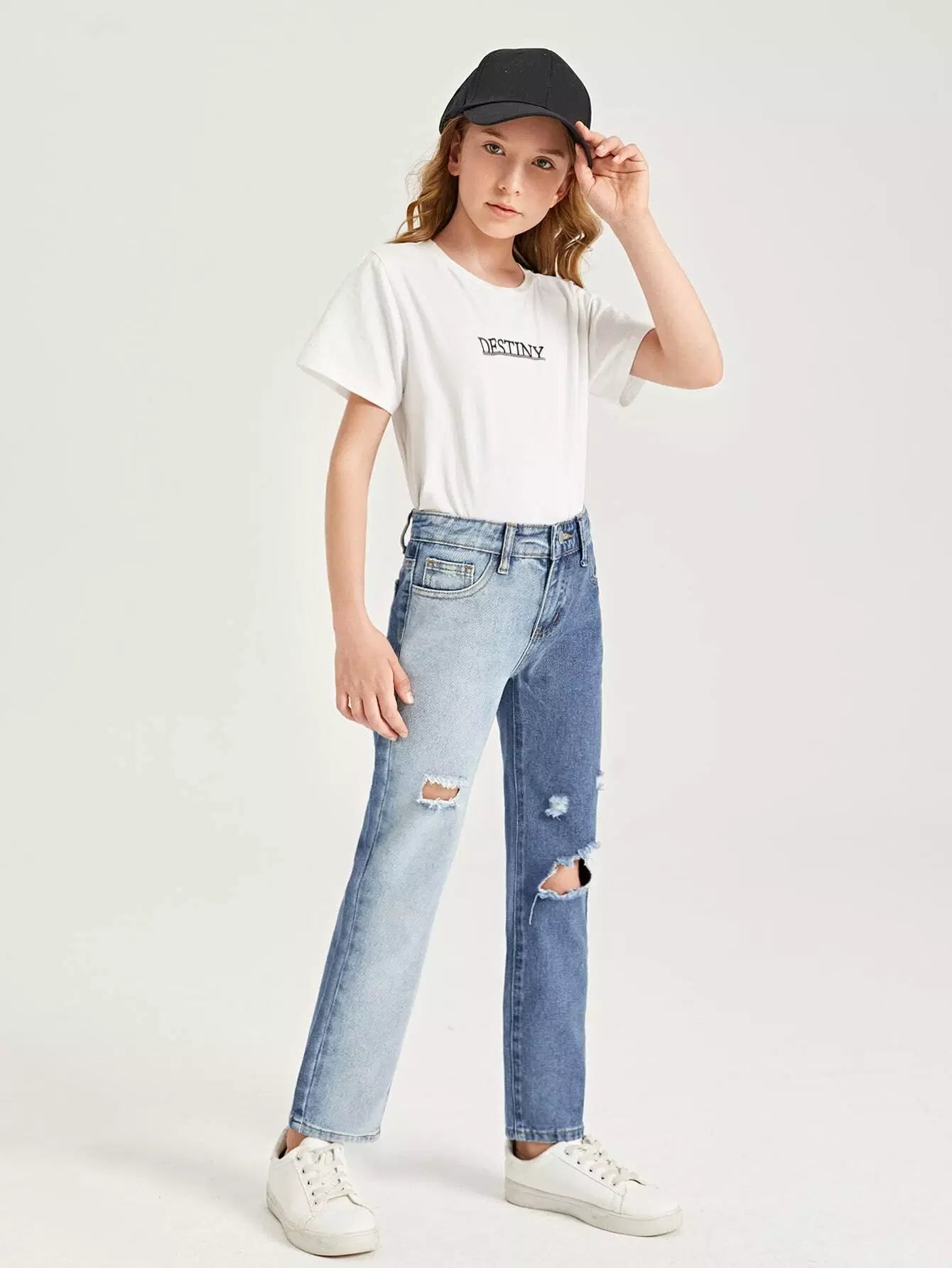 Girls High Waist Ripped Two Tone Straight Leg Jeans