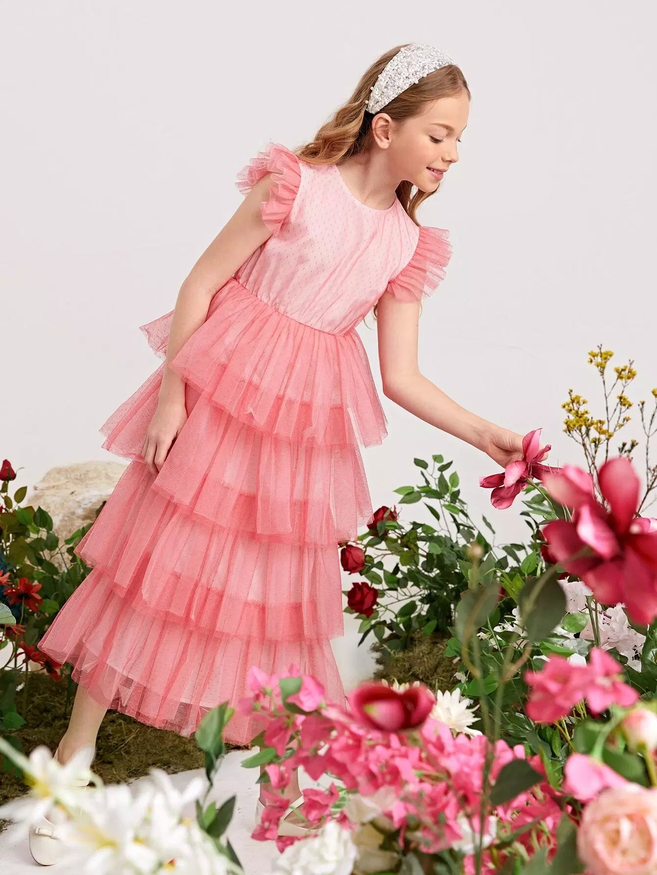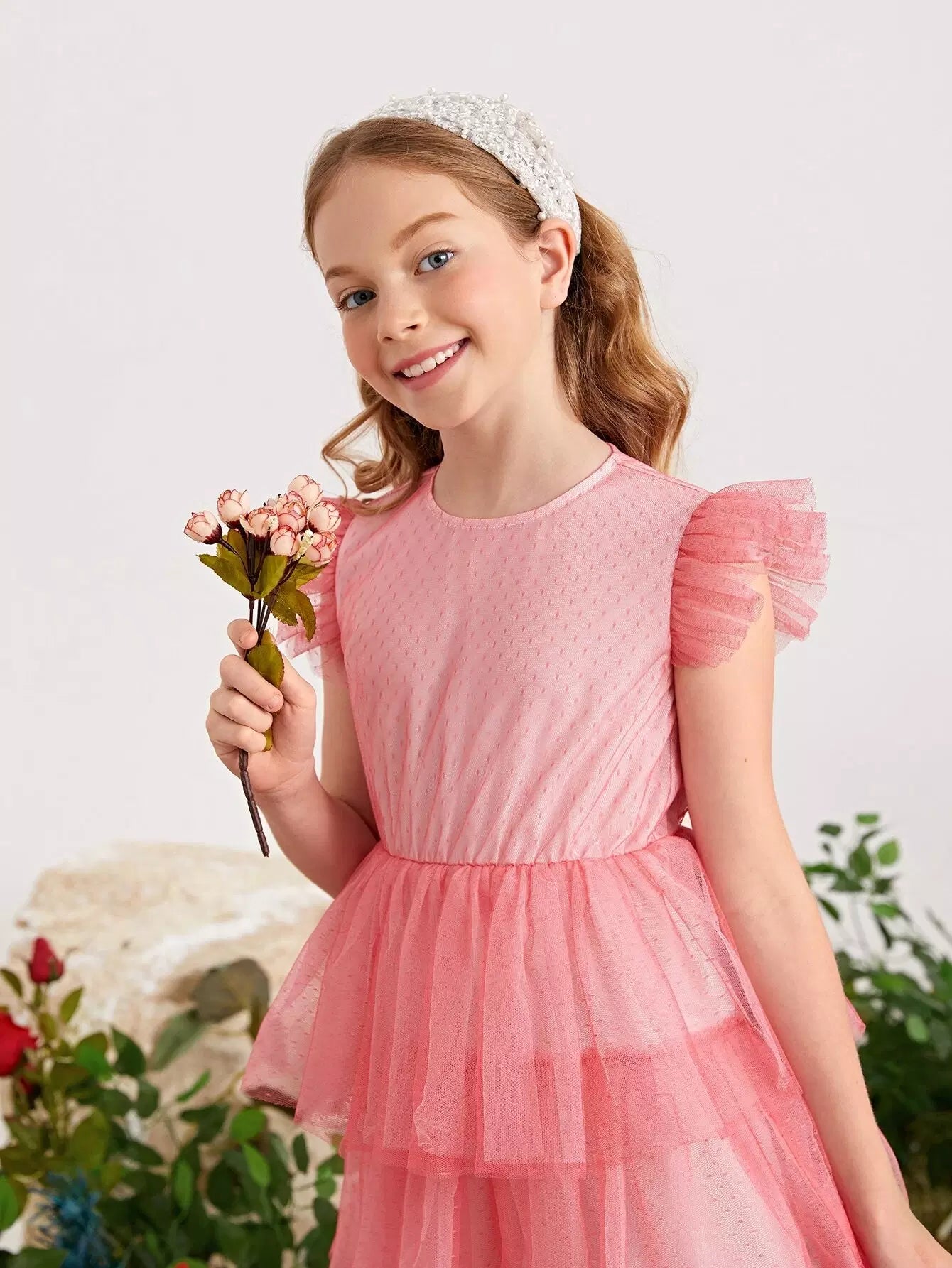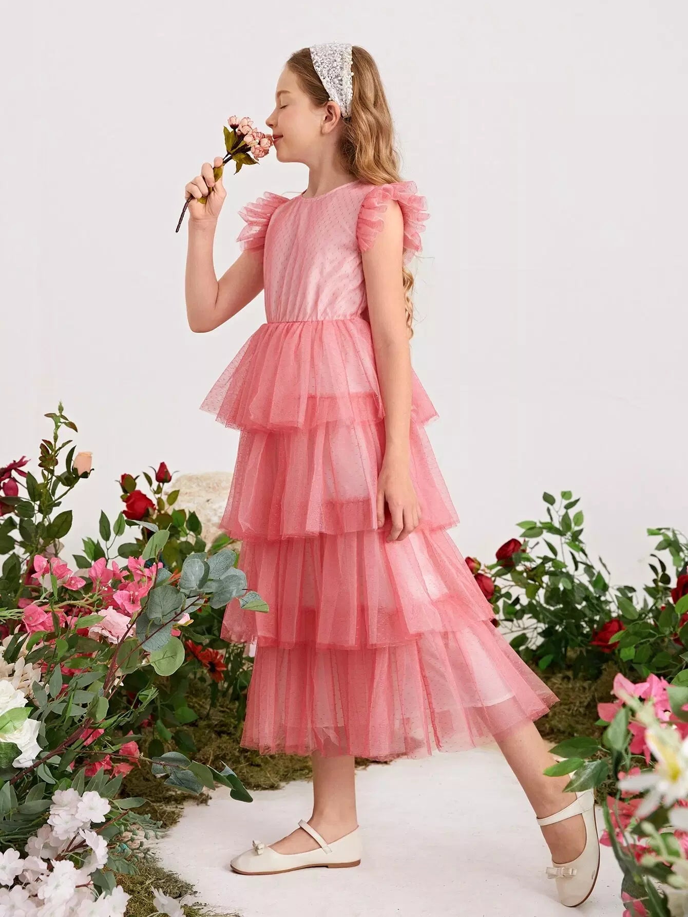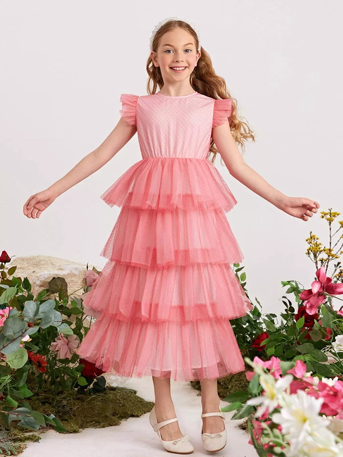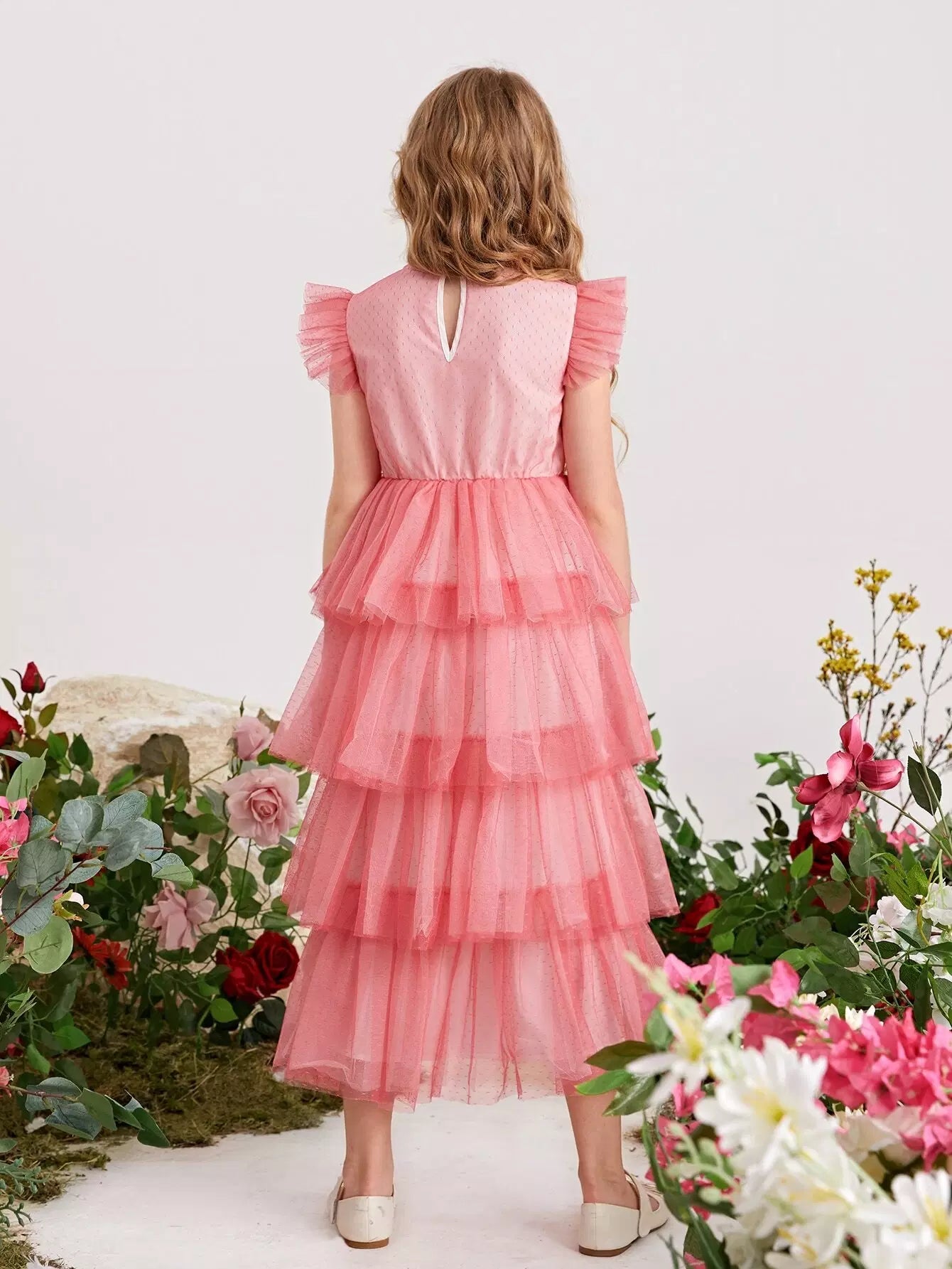 Girls Keyhole Back Swiss Dot Mesh Layered Hem Dress