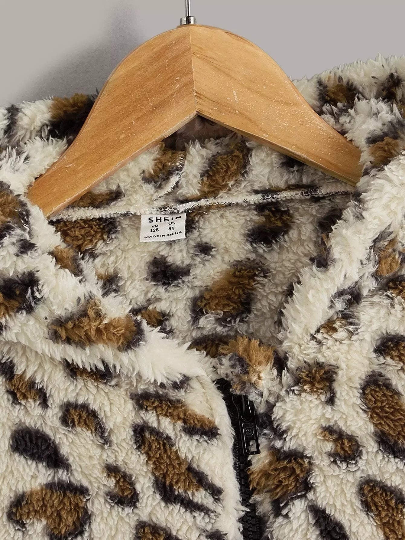 Girls Leopard Pattern Color Block Hooded Teddy Jacket