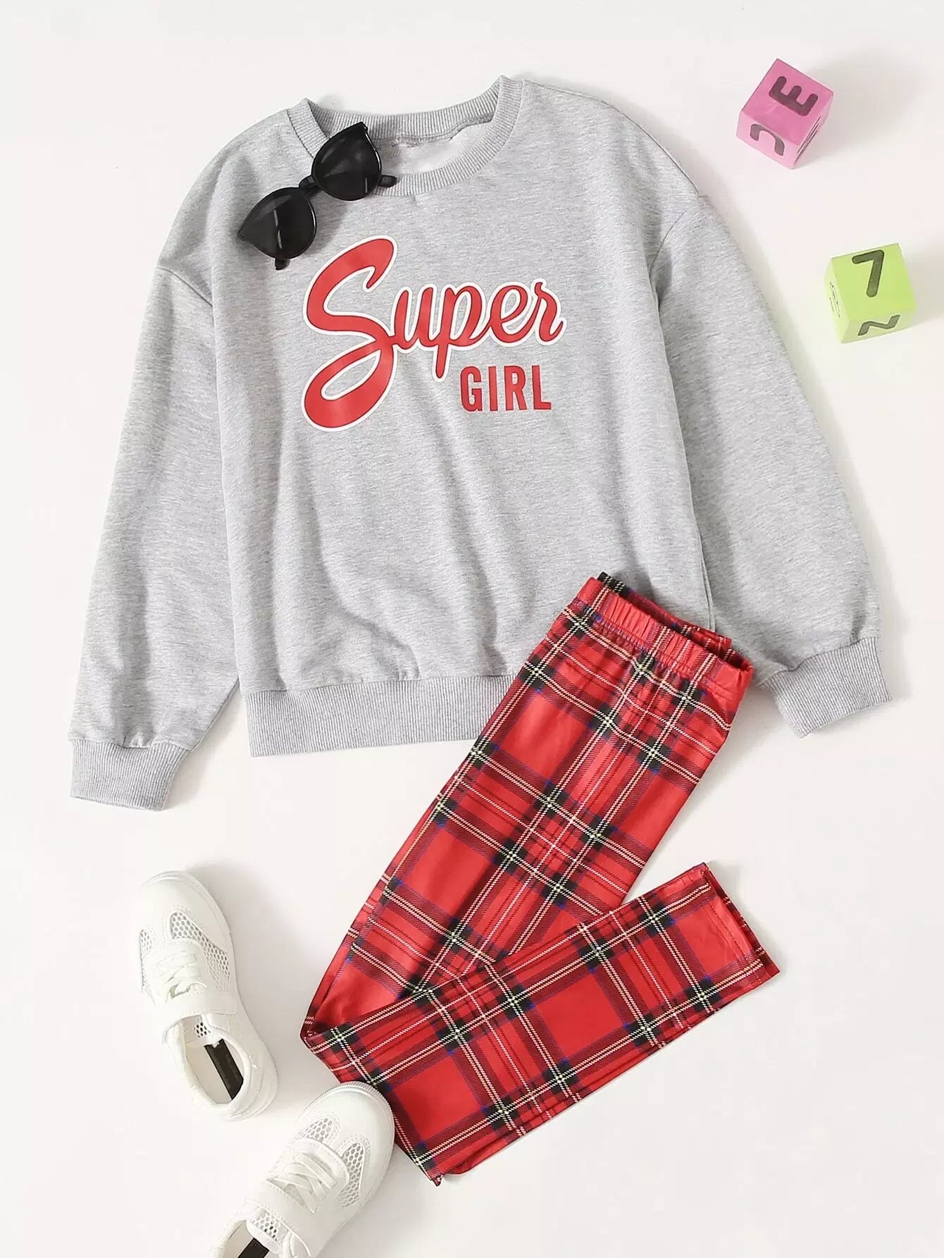 Girls Letter Graphic Pullover & Tartan Leggings Set