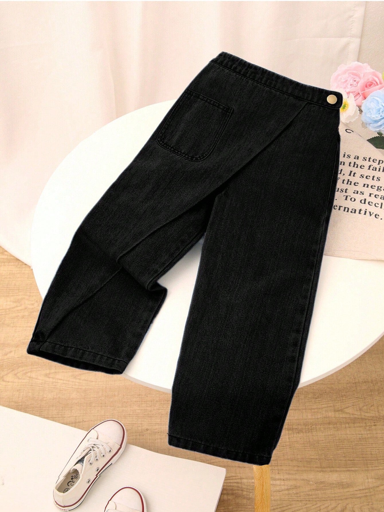 Girls' New Washed Blue Loose Straight Leg Jeans, Front Wrap Design With Double Button Closure, Casual