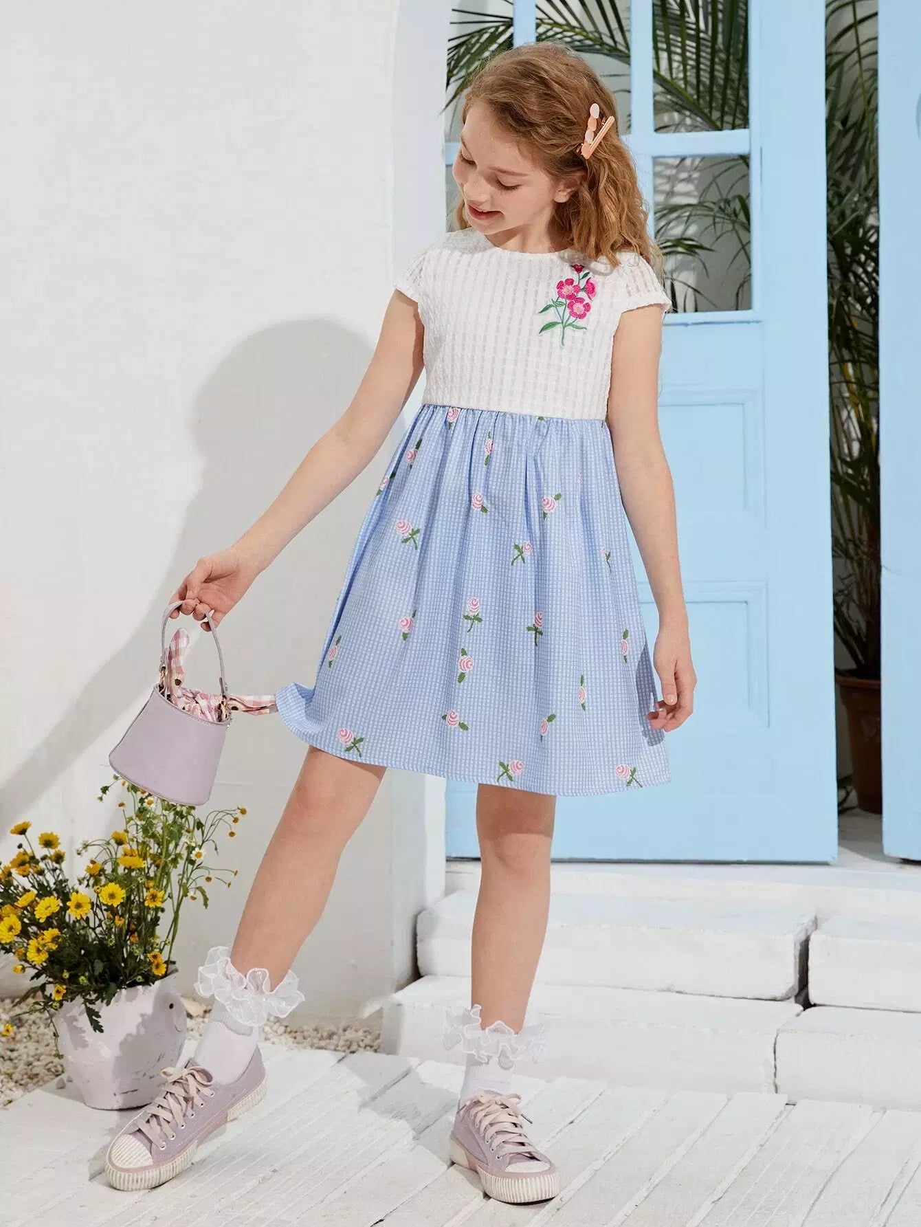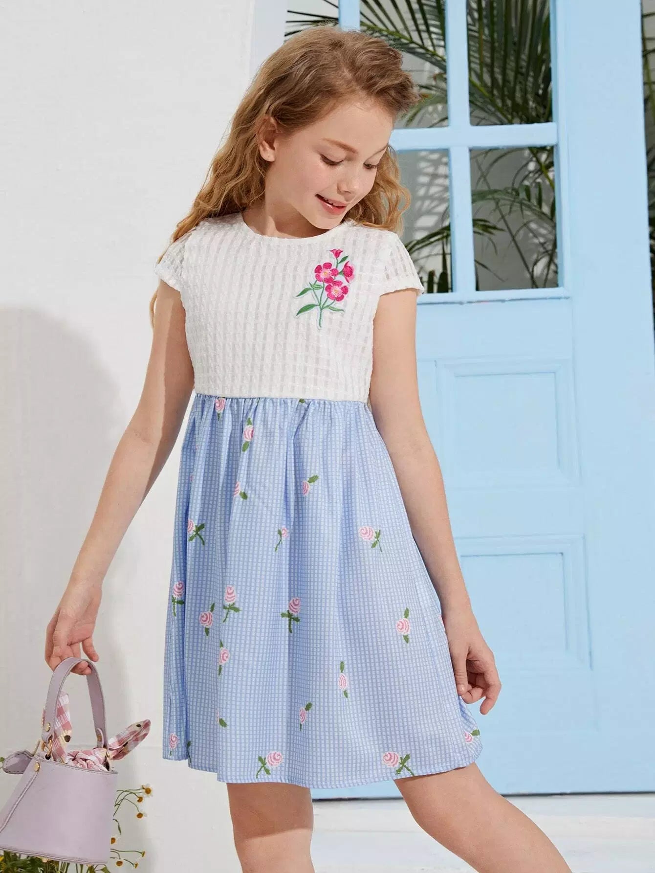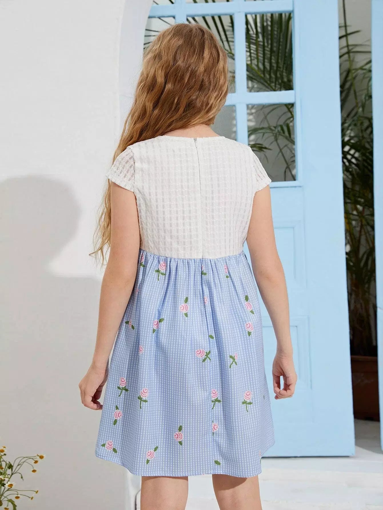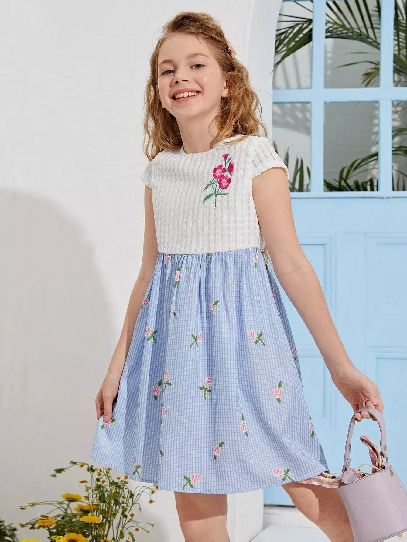 Girls Patched Detail Floral & Plaid Print Combo Dress