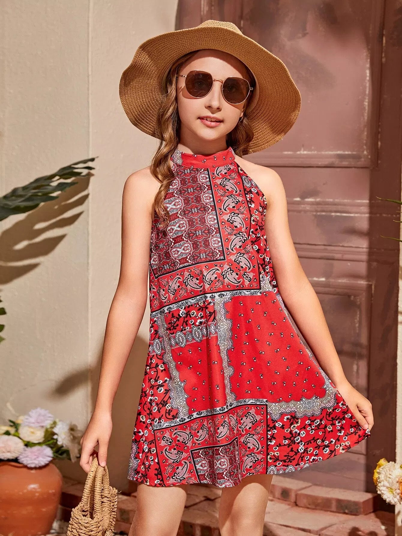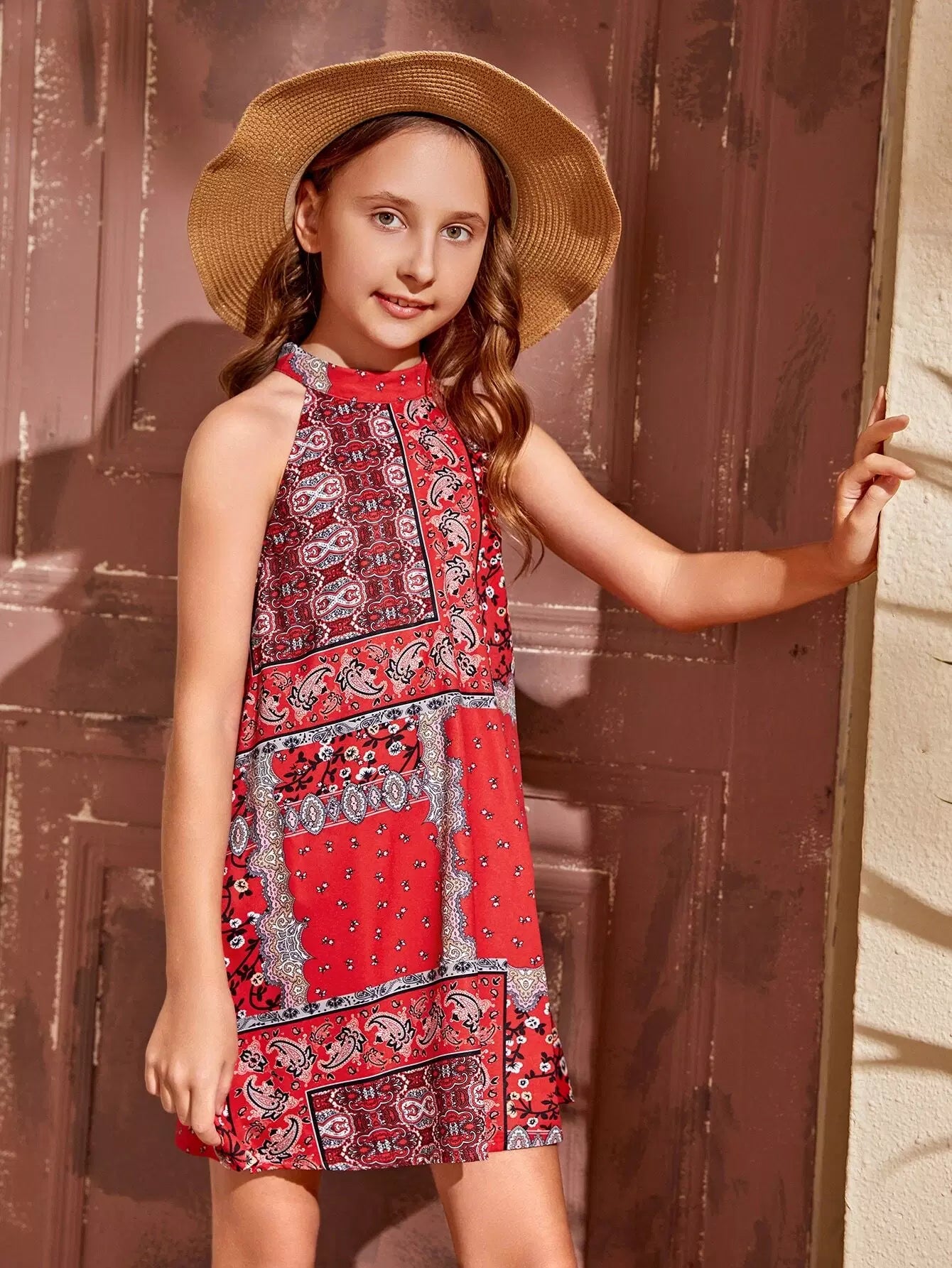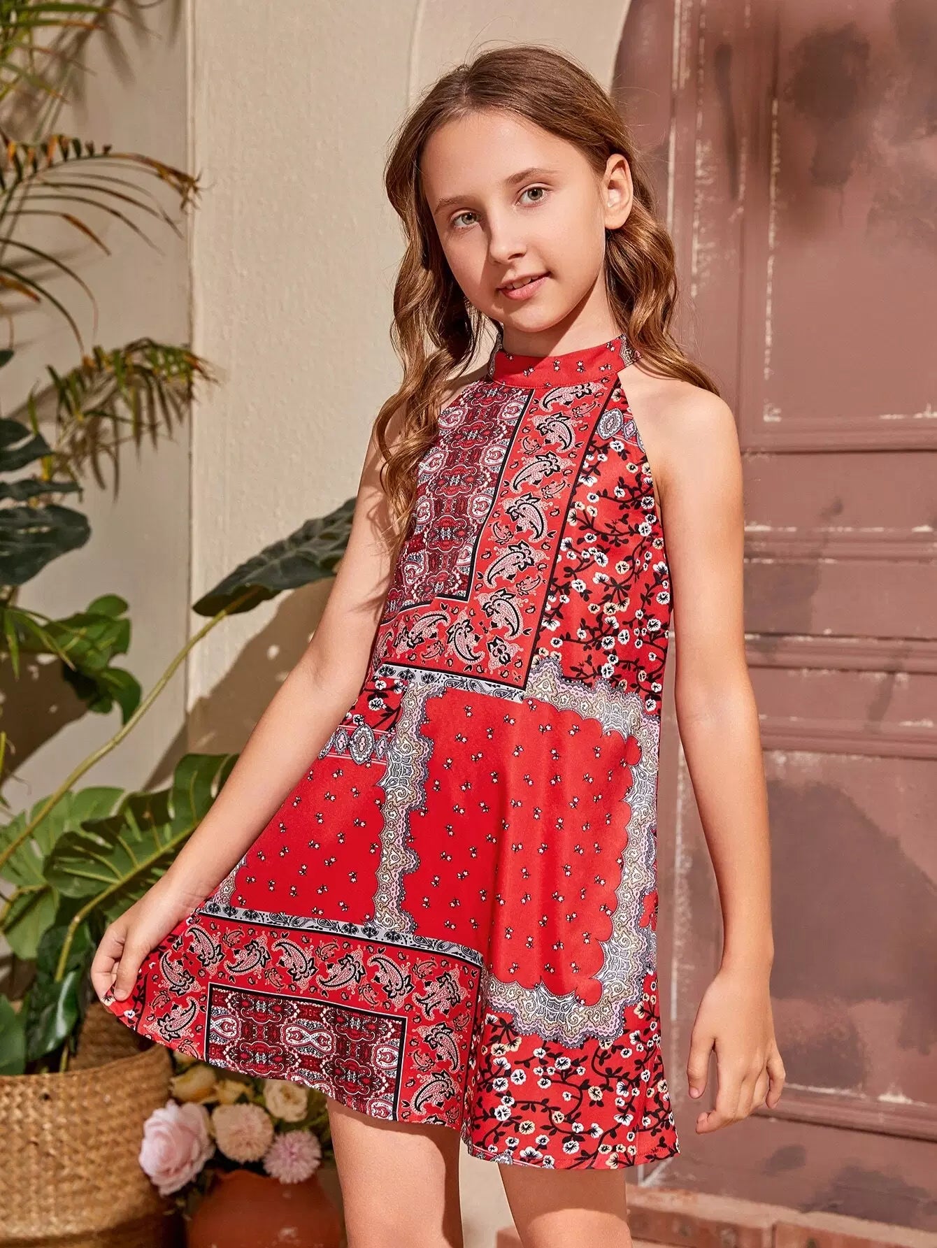 Girls Patchwork & Paisley Print Halterneck A-line Dress
