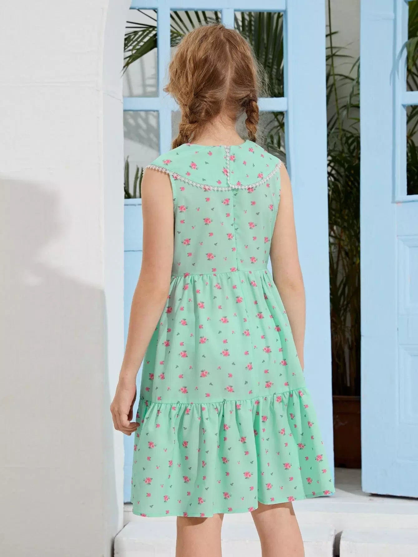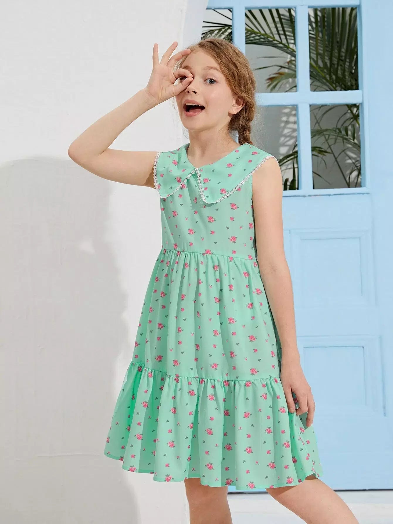 Girls Peter Pan Collar Ruffle Hem Ditsy Floral Dress