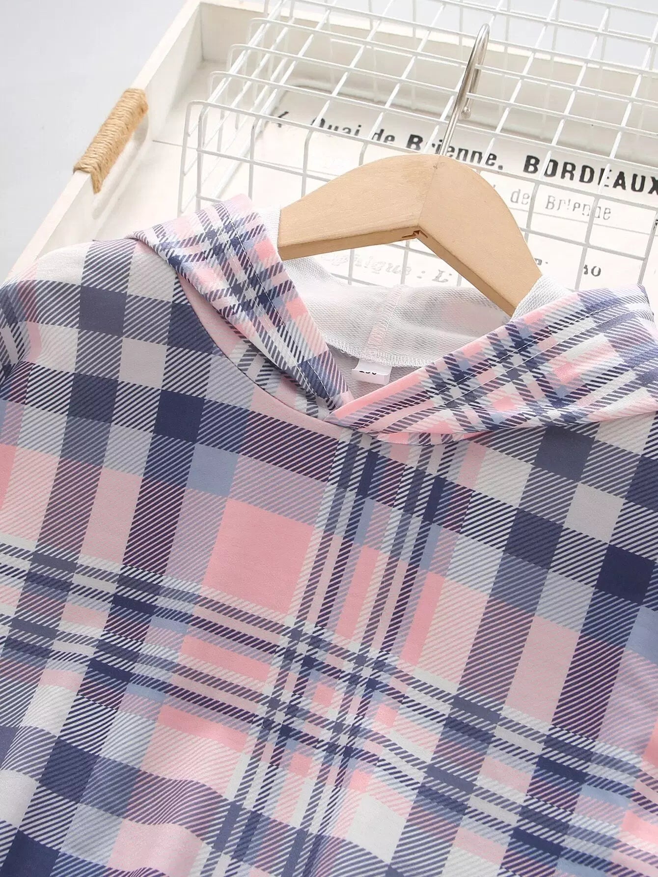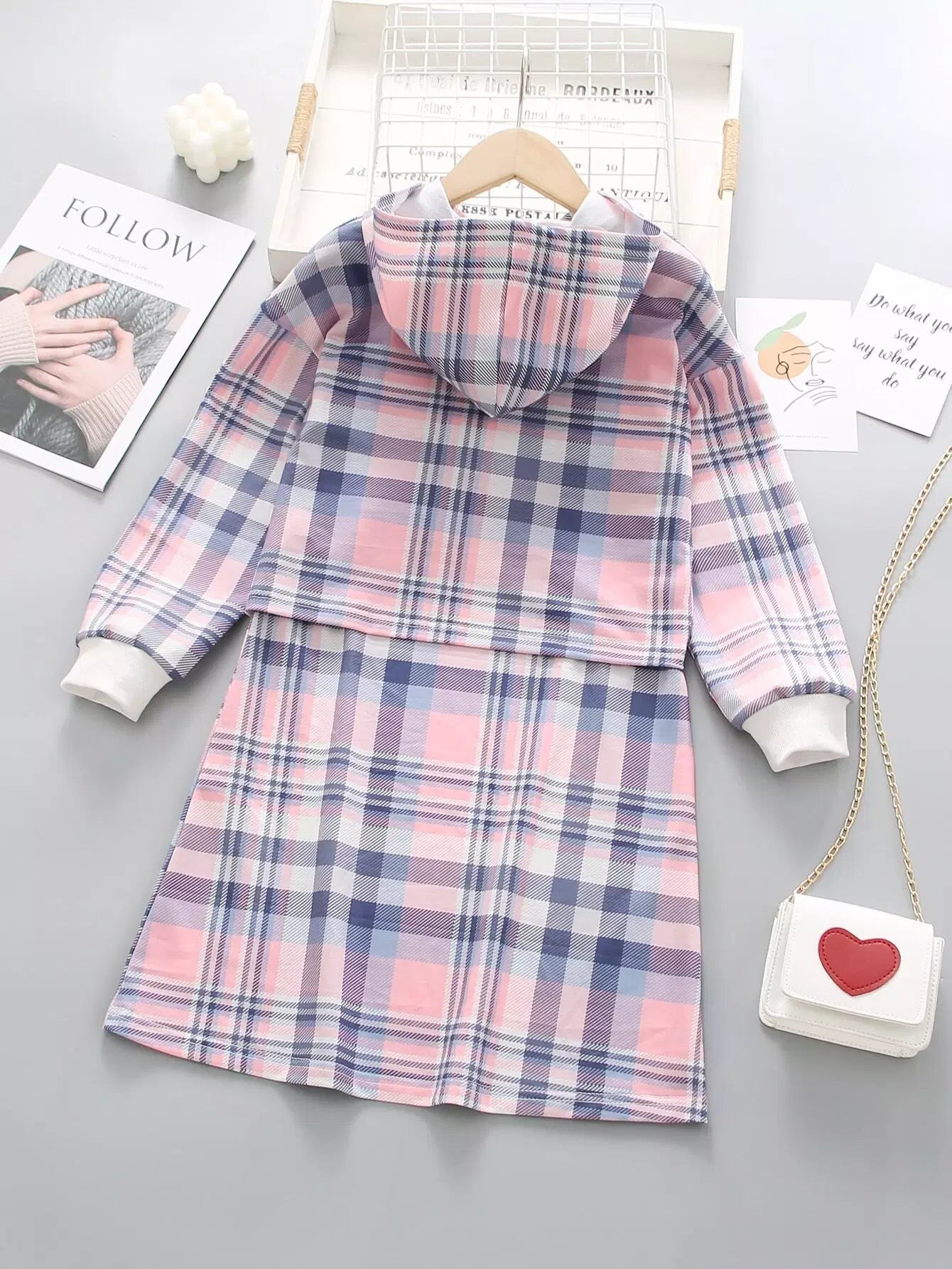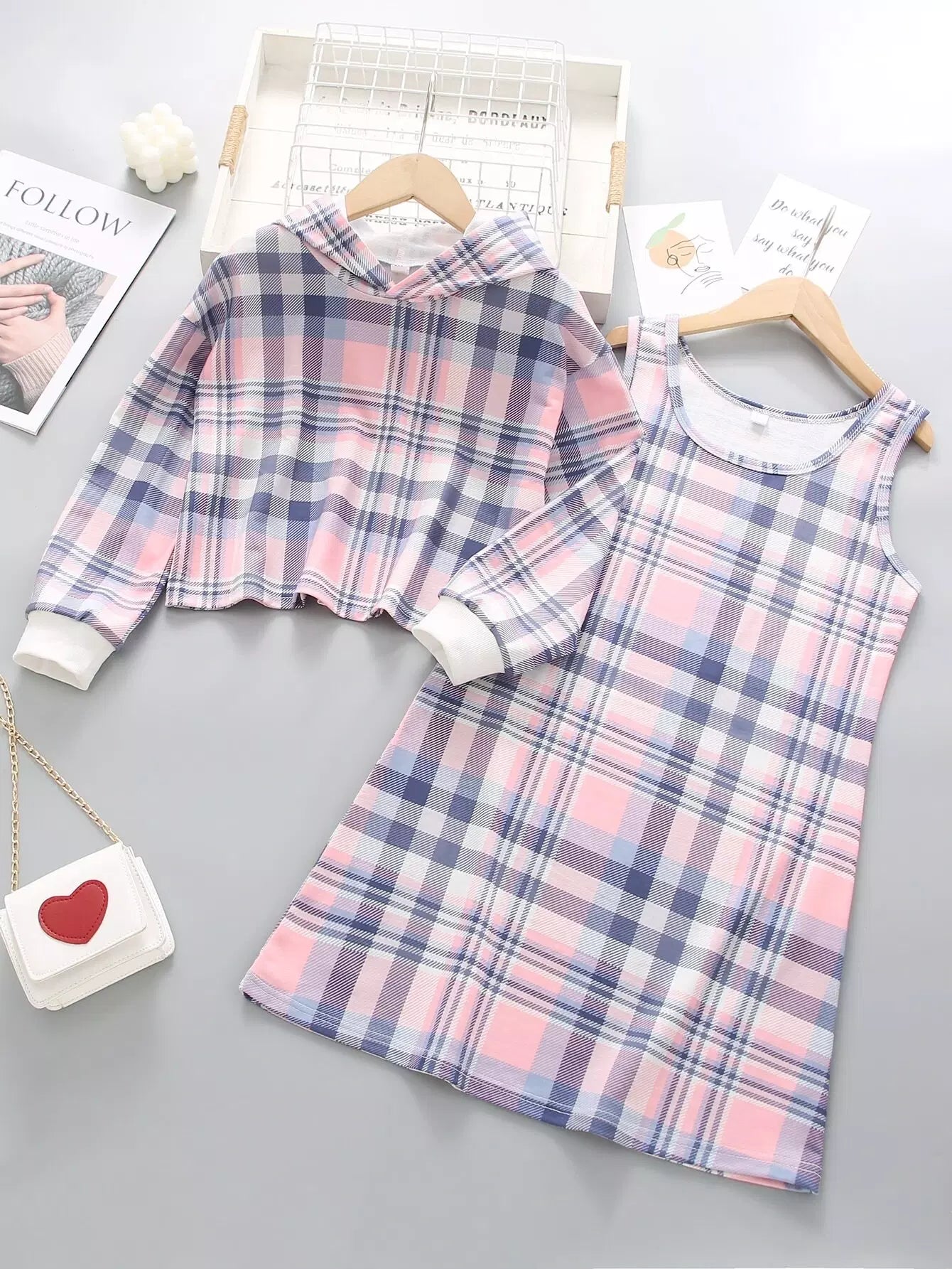 Girls Plaid Drop Shoulder Hoodie & Tank Dress