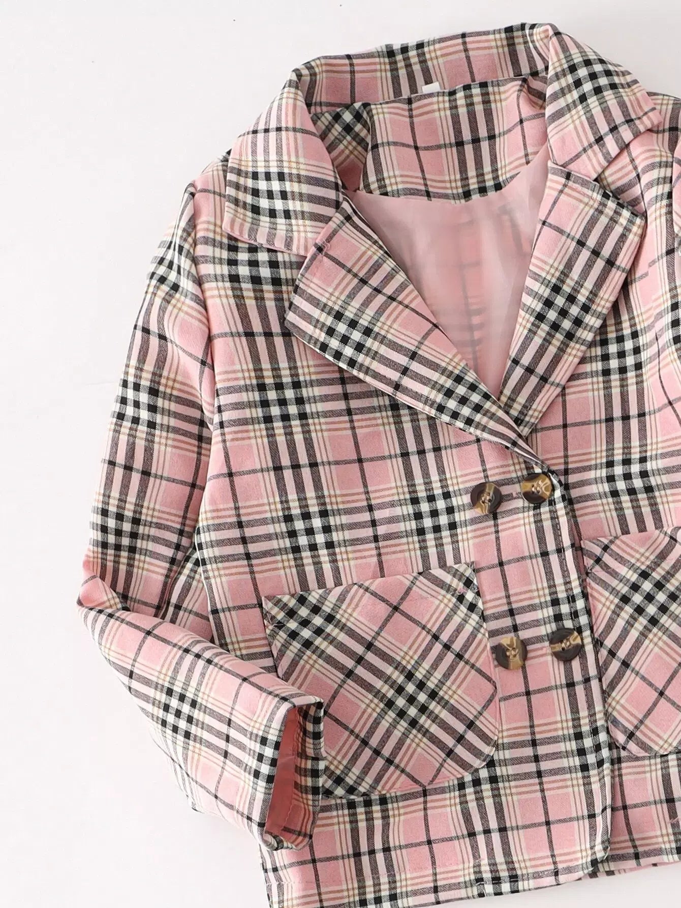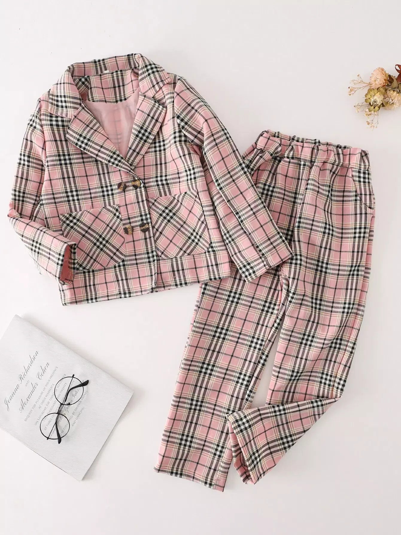 Girls Plaid Pocket Front Double Breasted Blazer & Pants