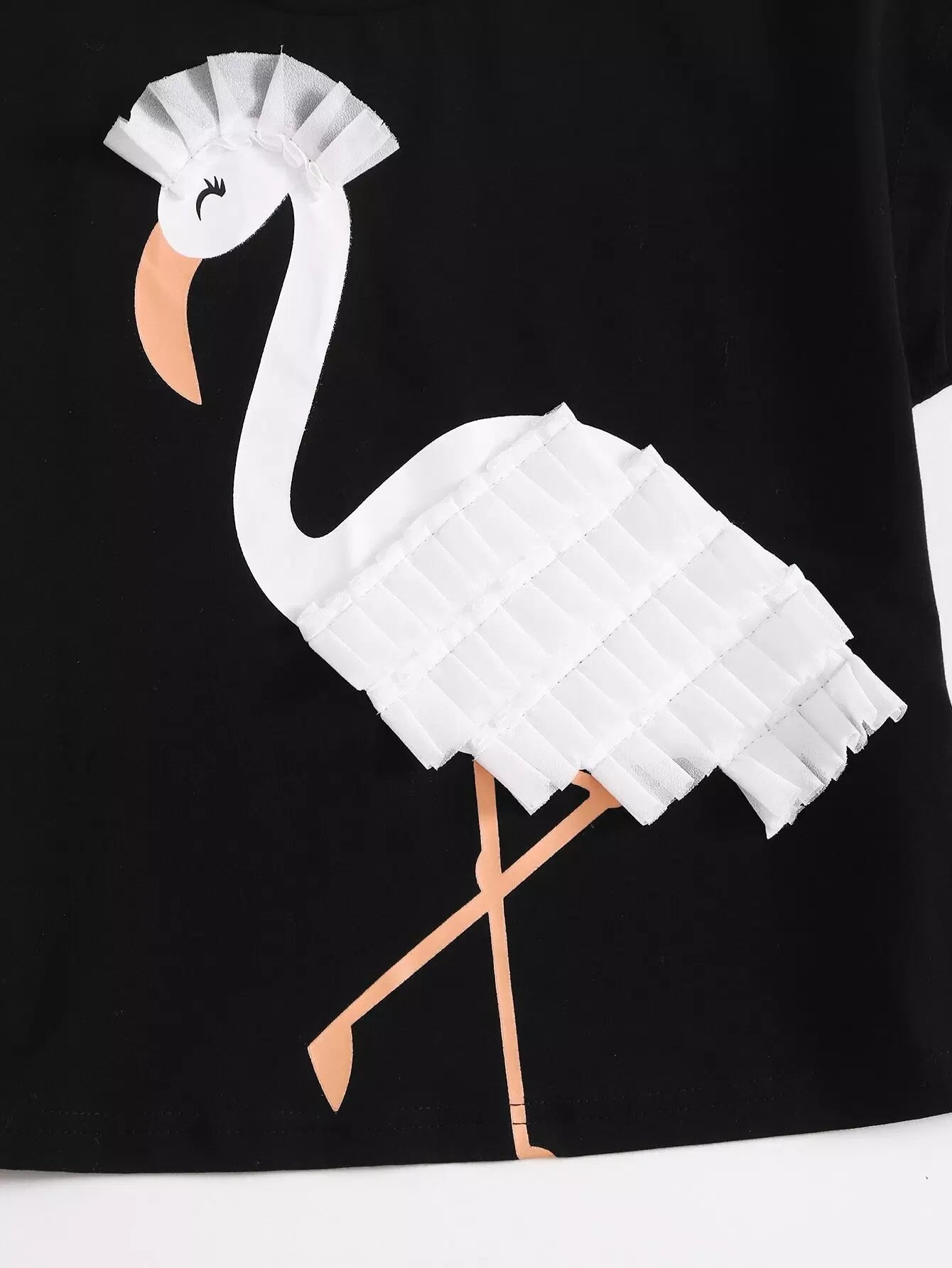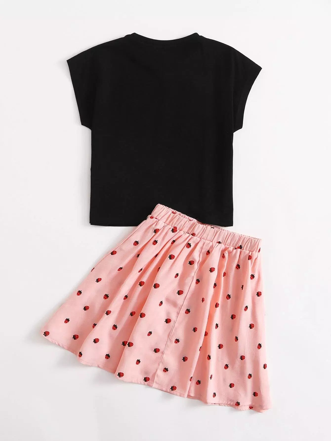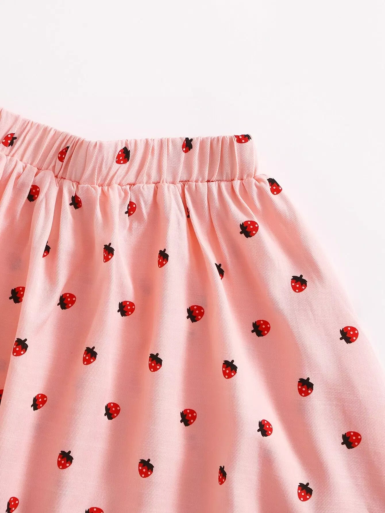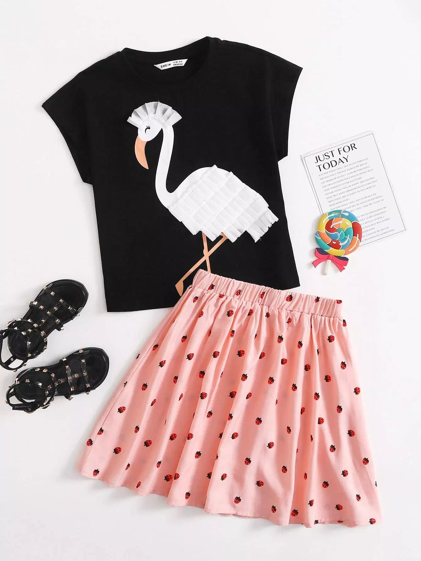 Girls Pleated Appliques Flamingo Print Top & Strawberry Print Skirt Set