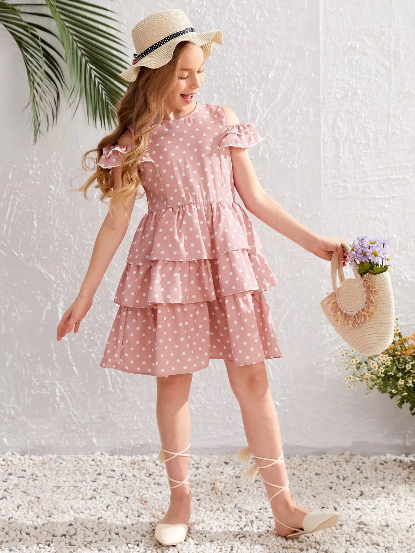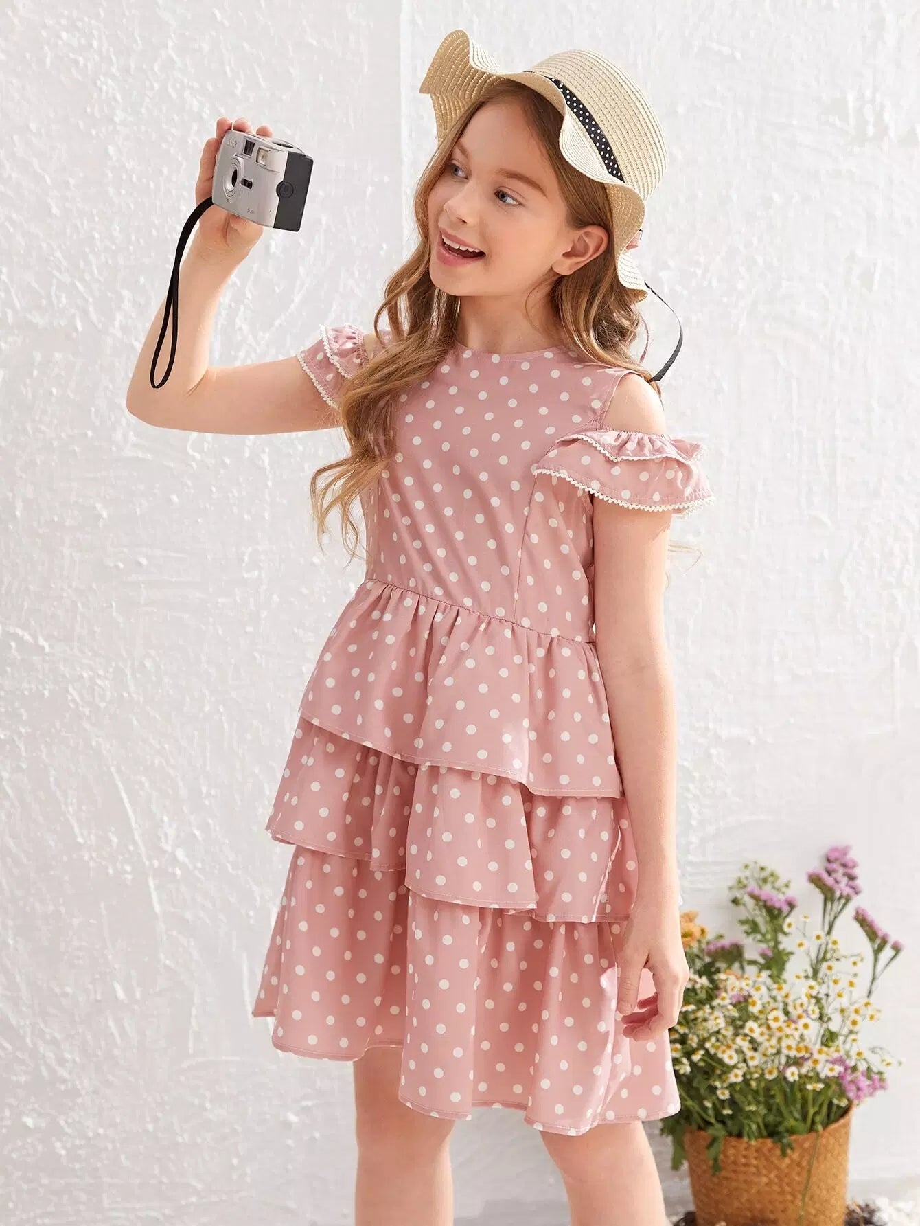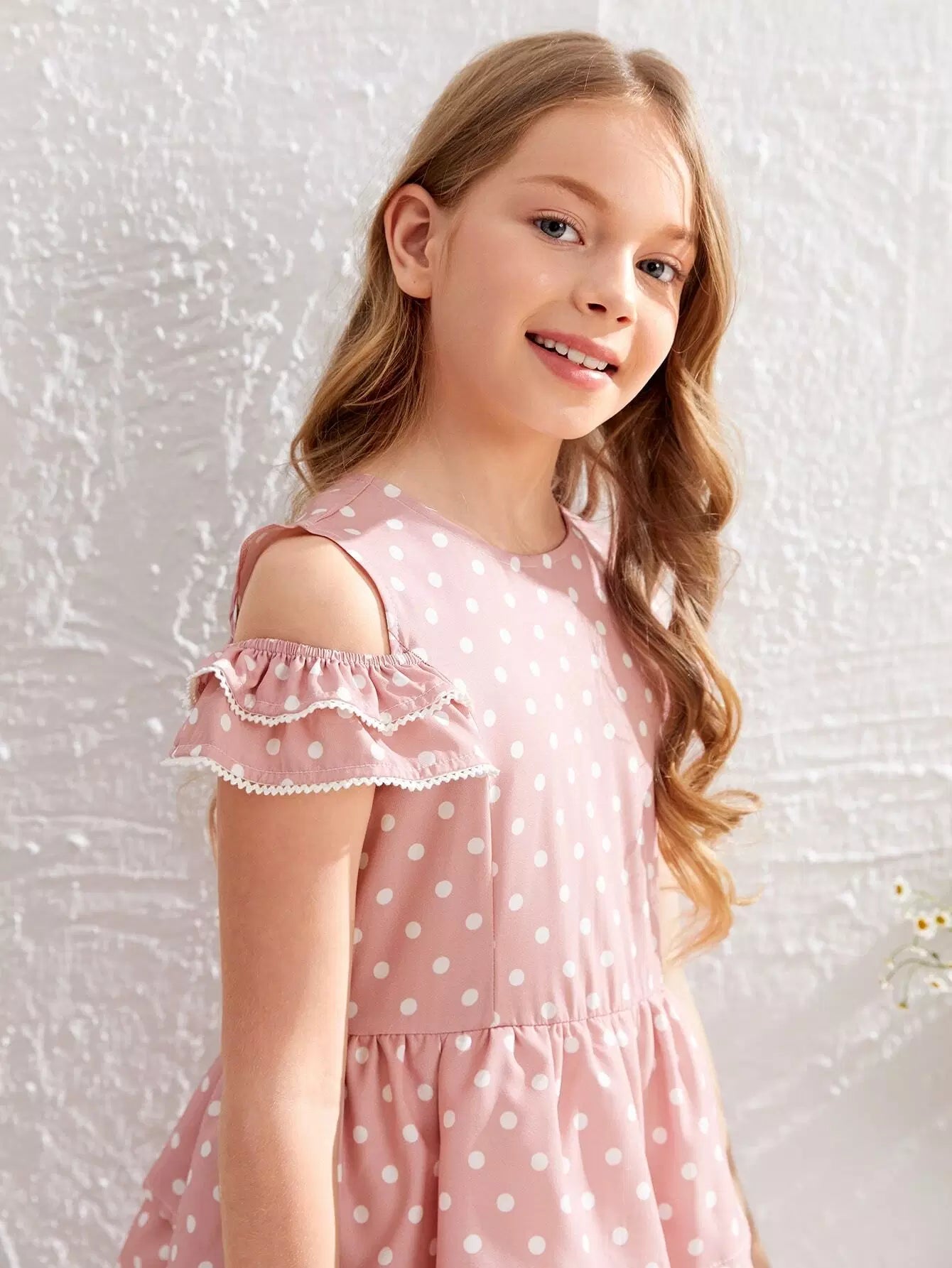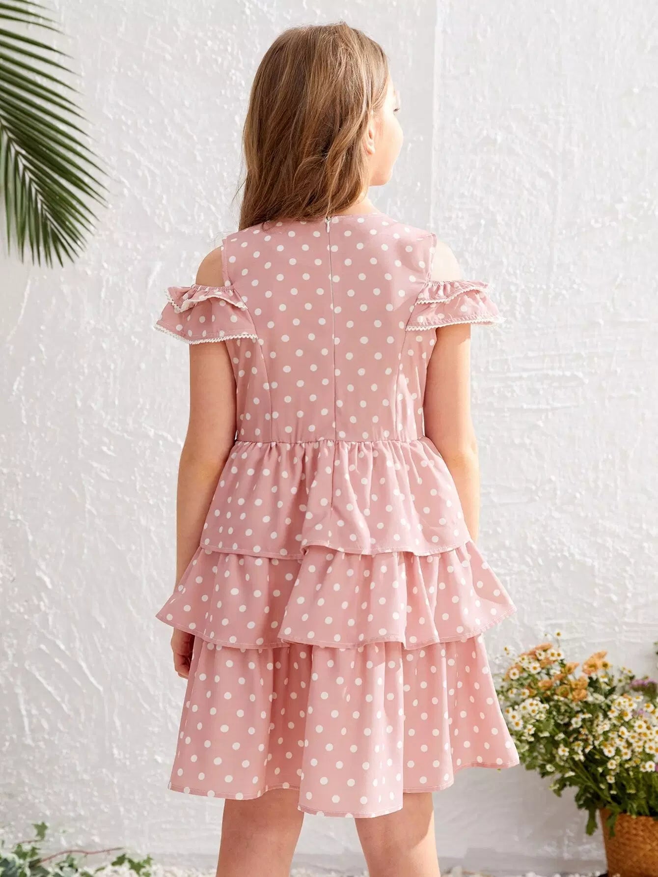 Girls Polka Dot Cold Shoulder Layered Ruffle Hem Dress