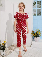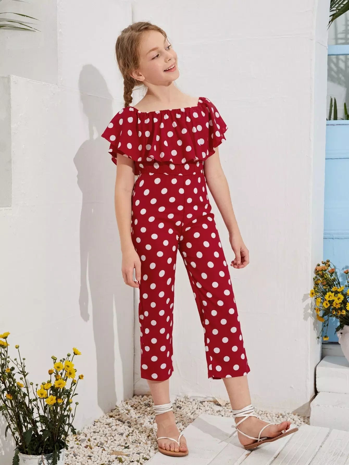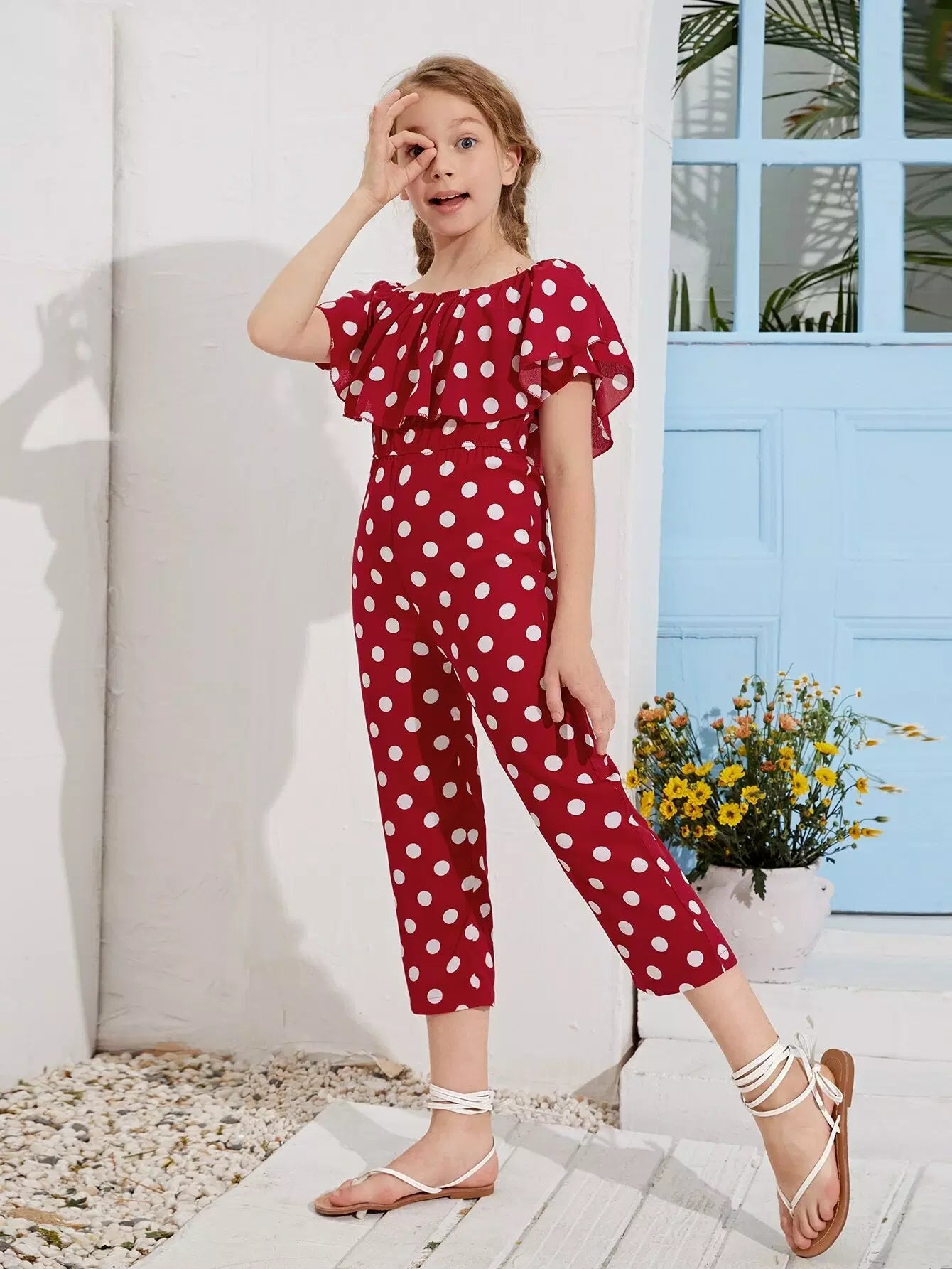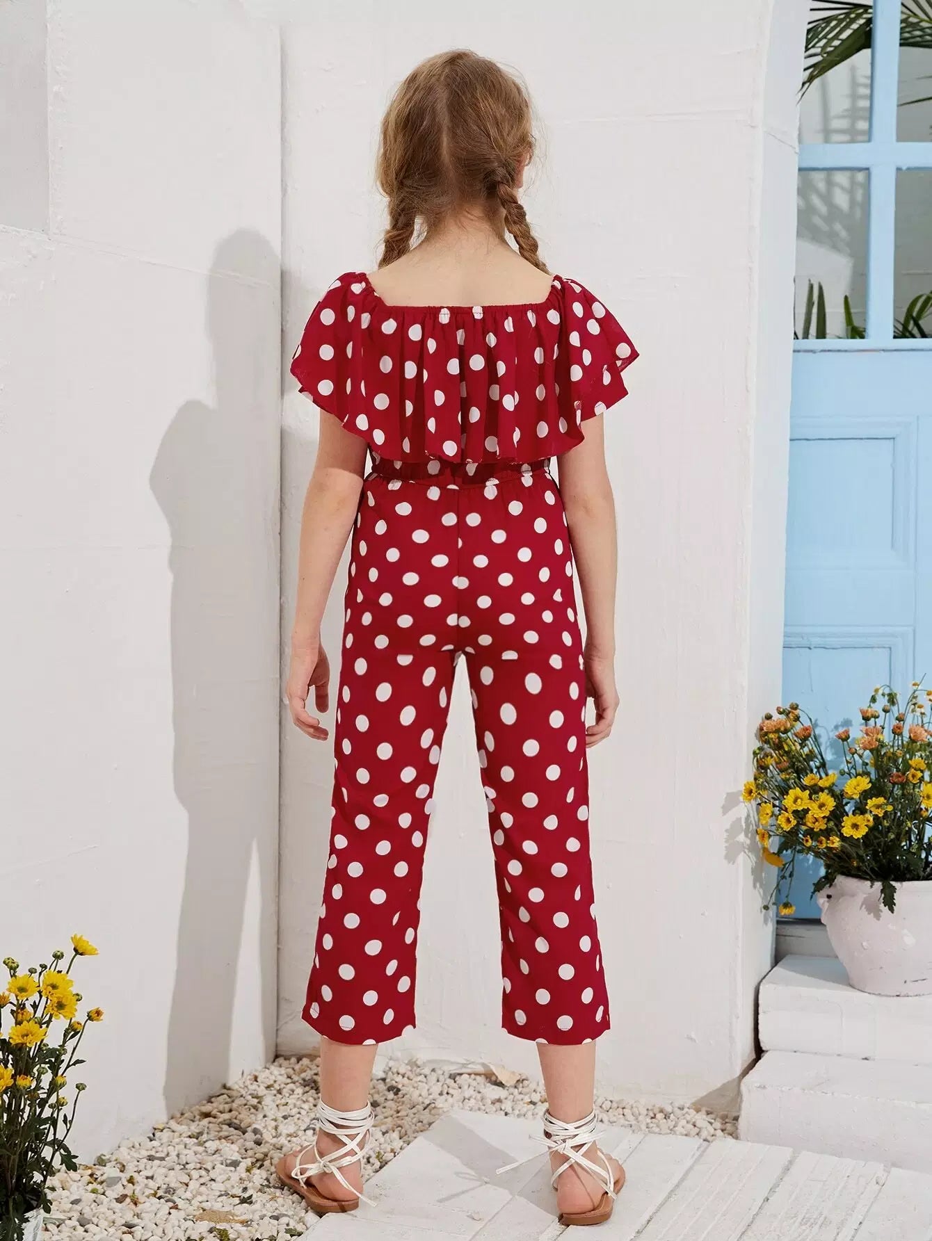 Girls Polka Dot Off Shoulder Ruffle Jumpsuit
