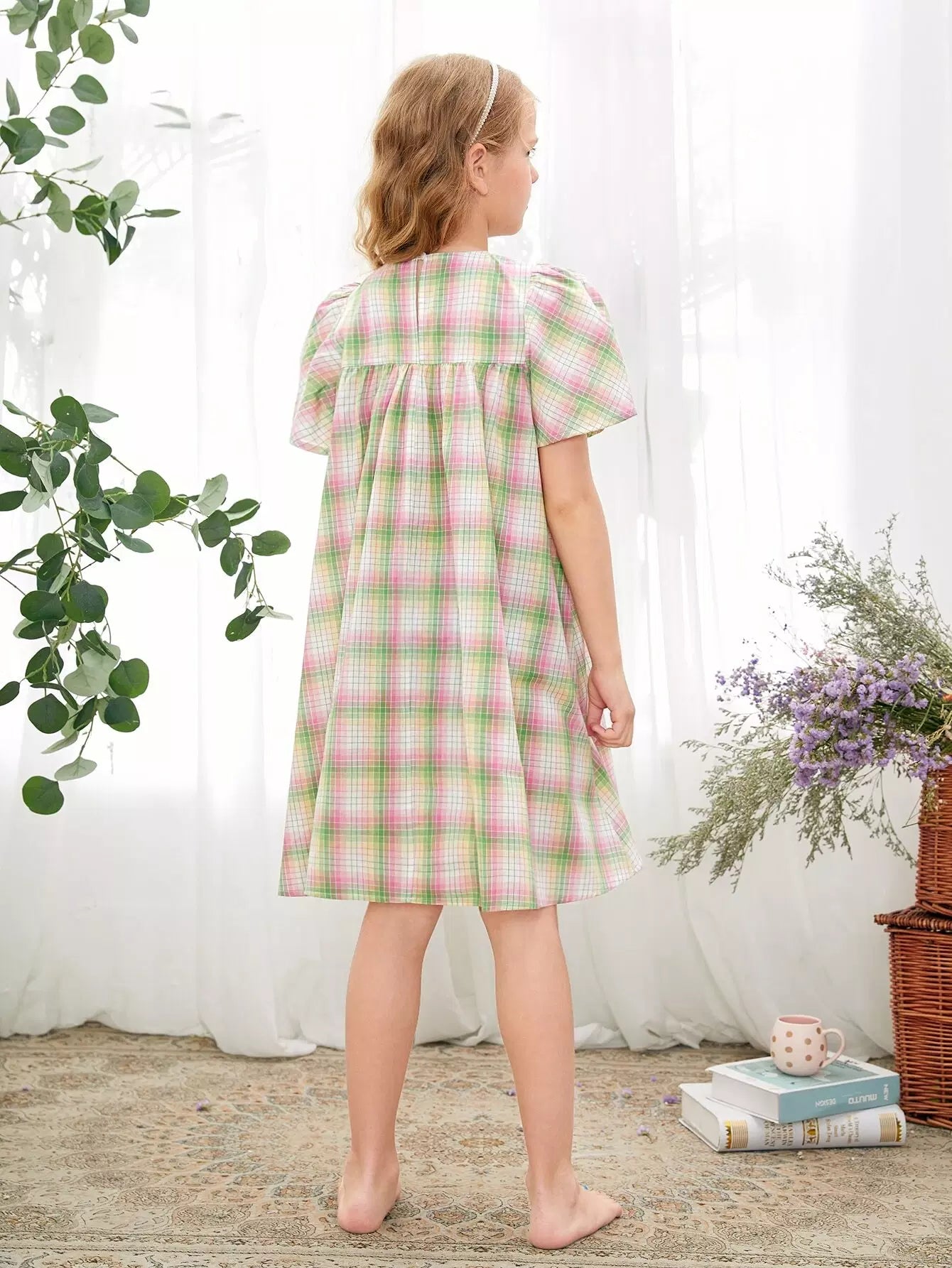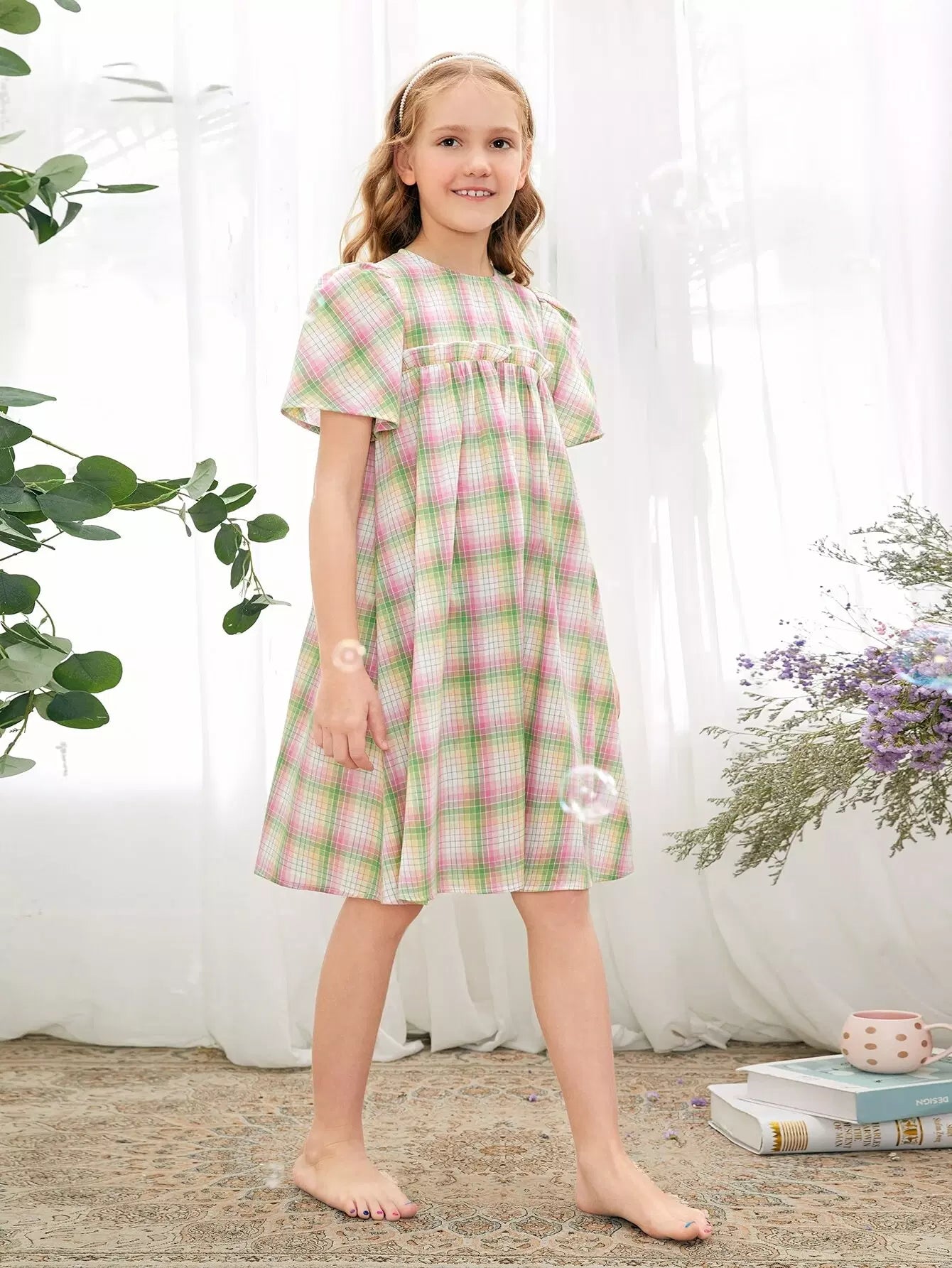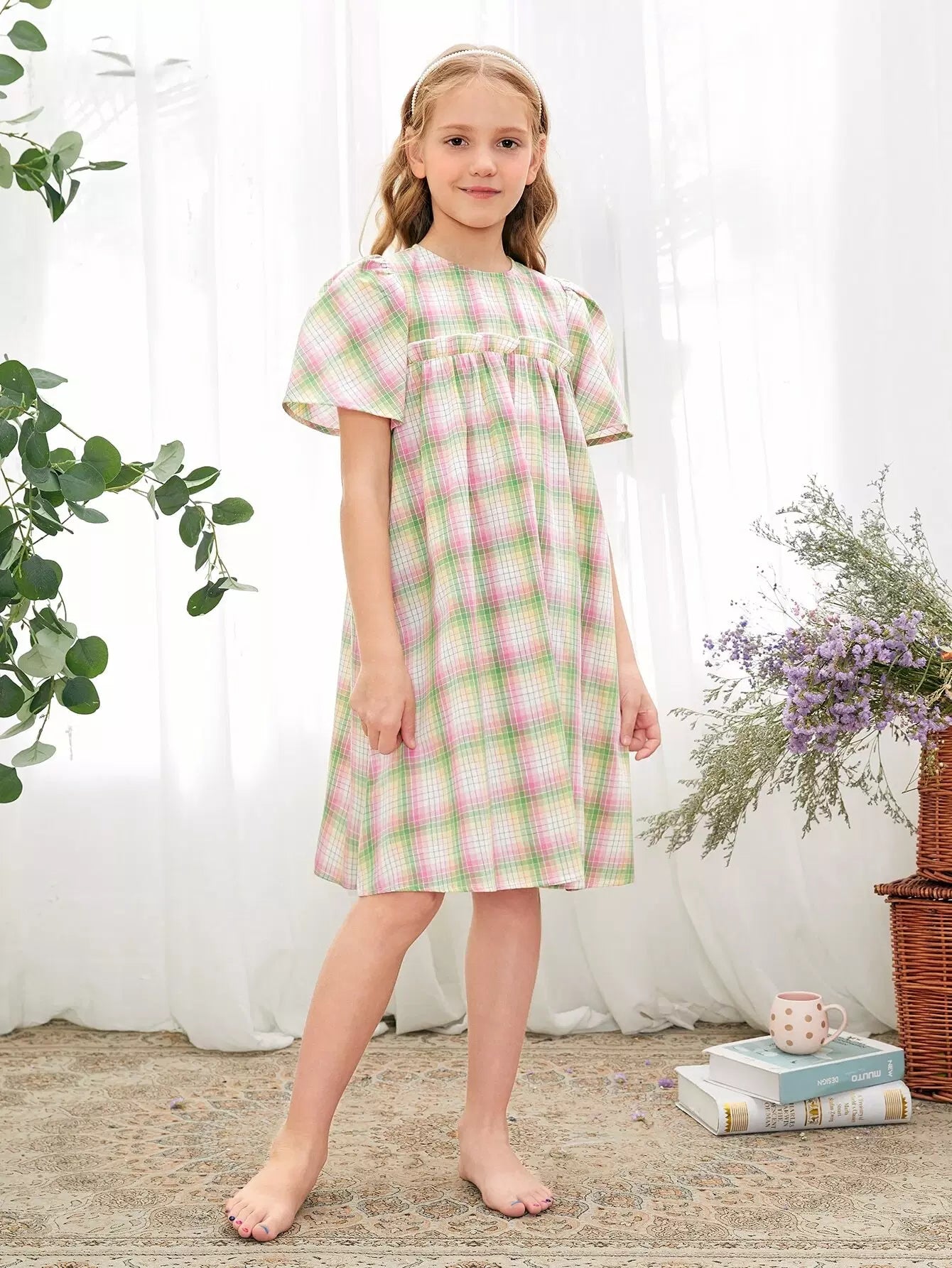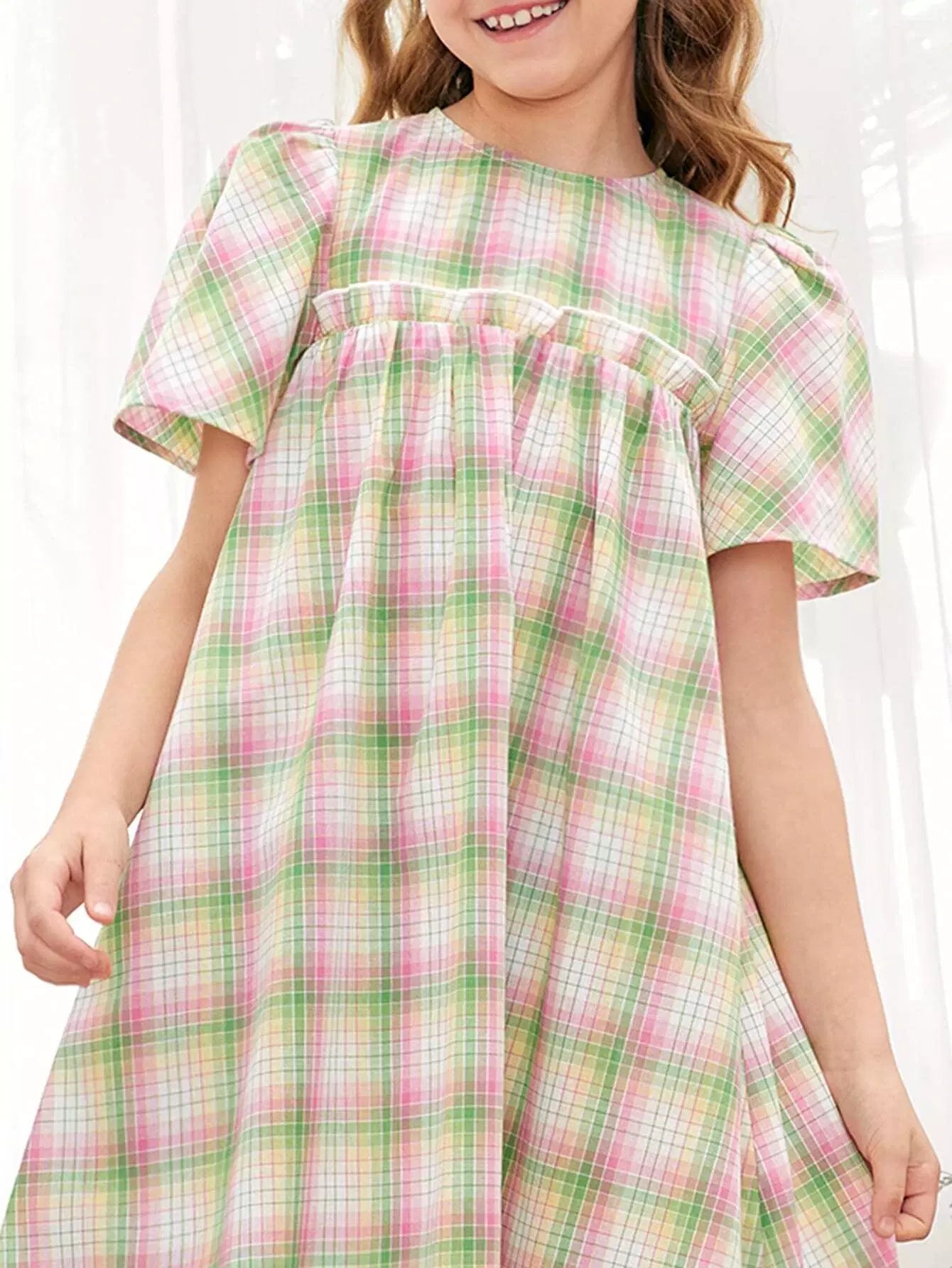 Girls Puff Sleeve Ruffle Detail Plaid Nightdress