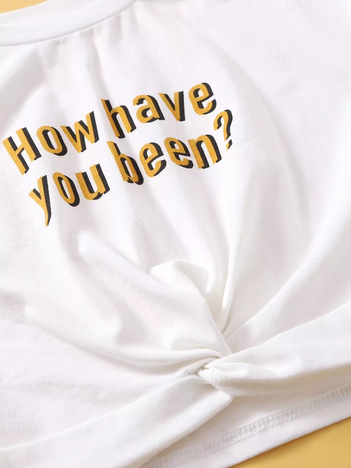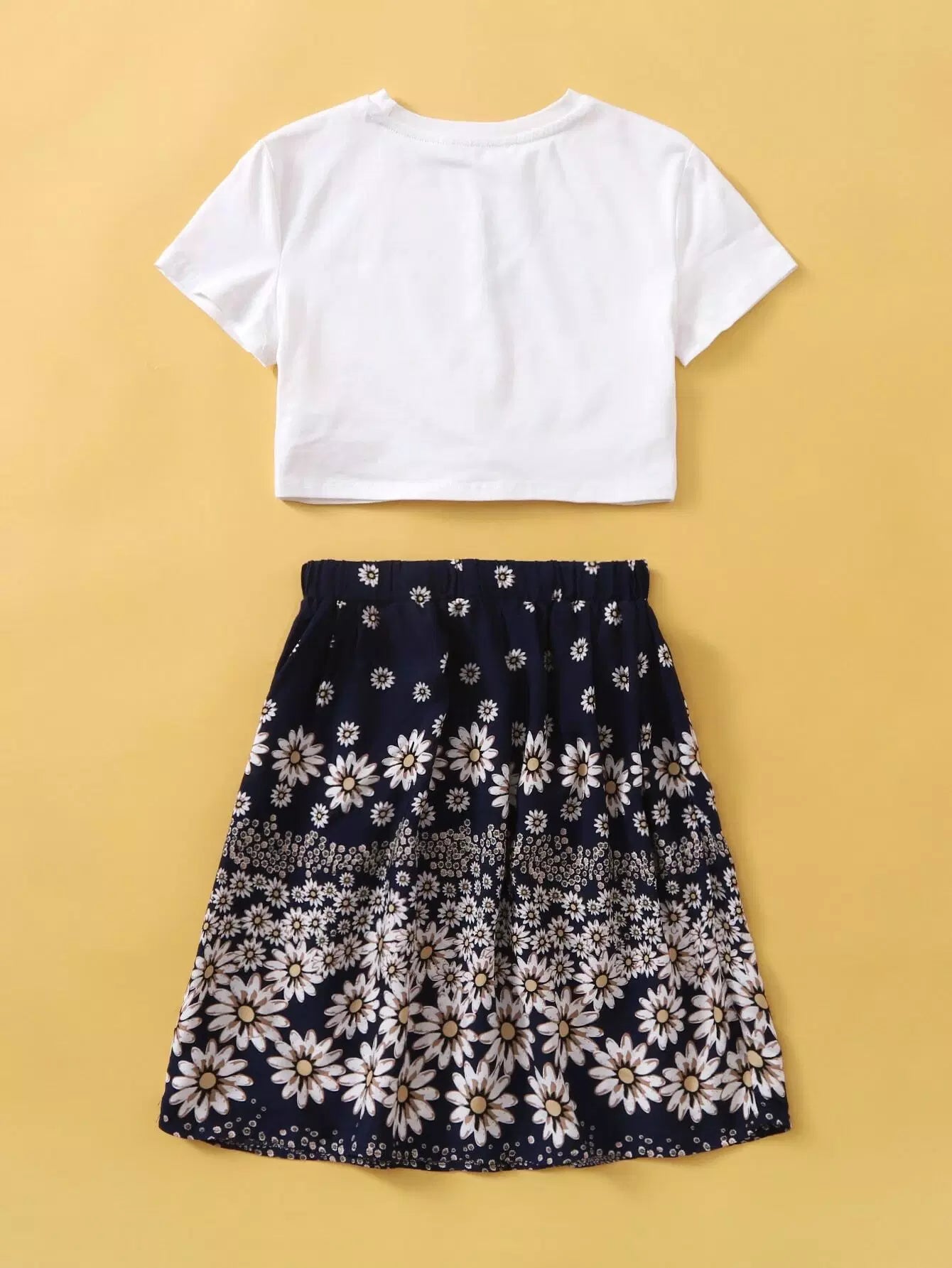 Girls Slogan Graphic Twist Hem Top & Floral Skirt Set