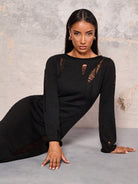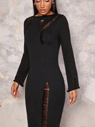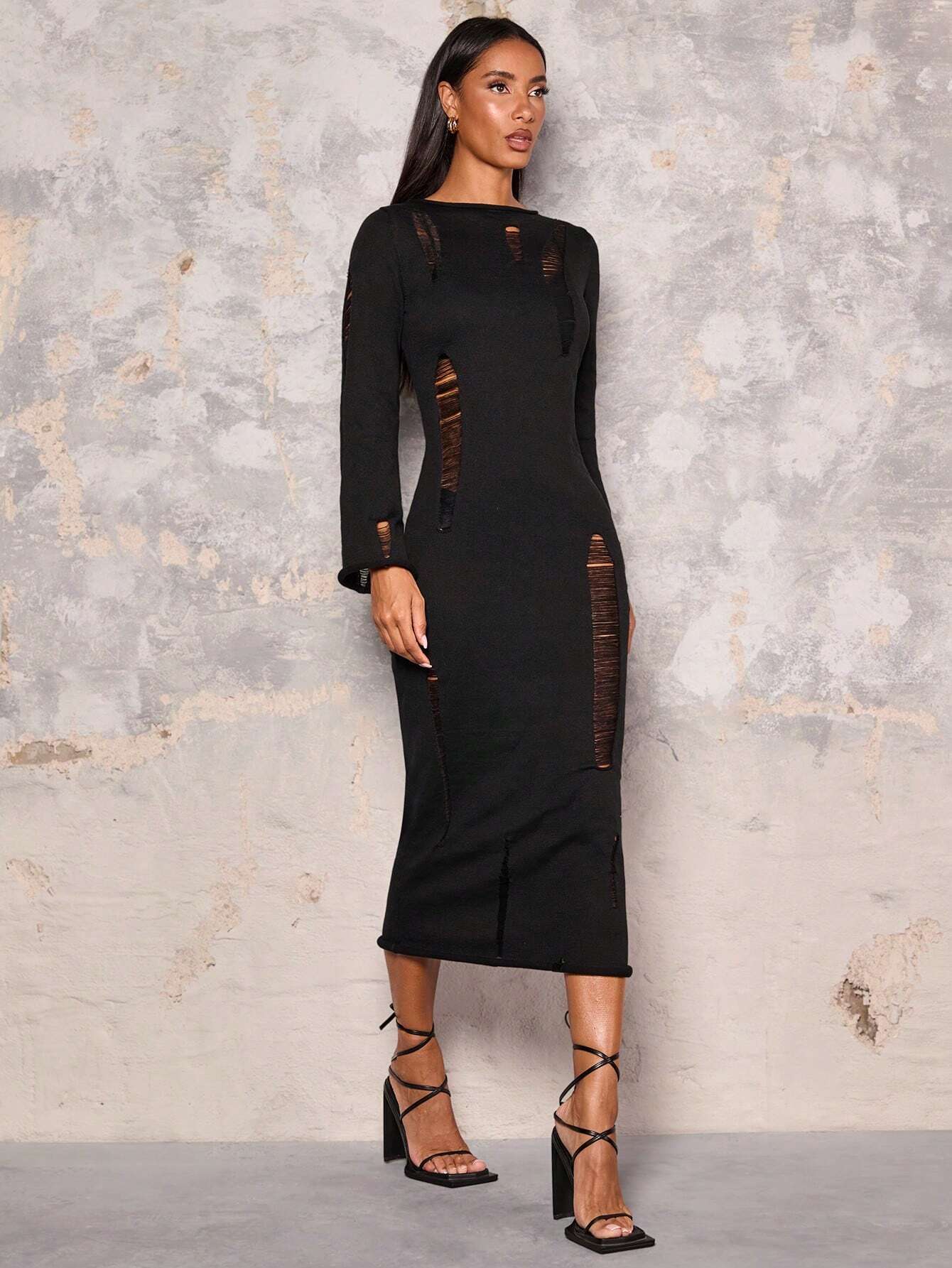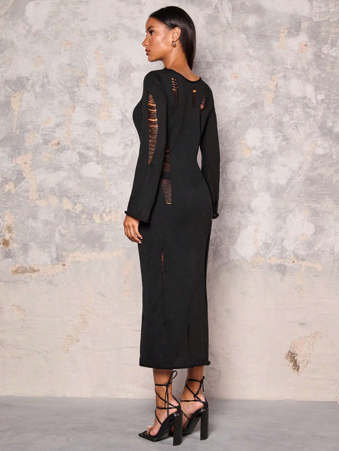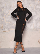 Glamine Mid-Length Solid Color Hollow Long Sleeve Sweater Dress For Women