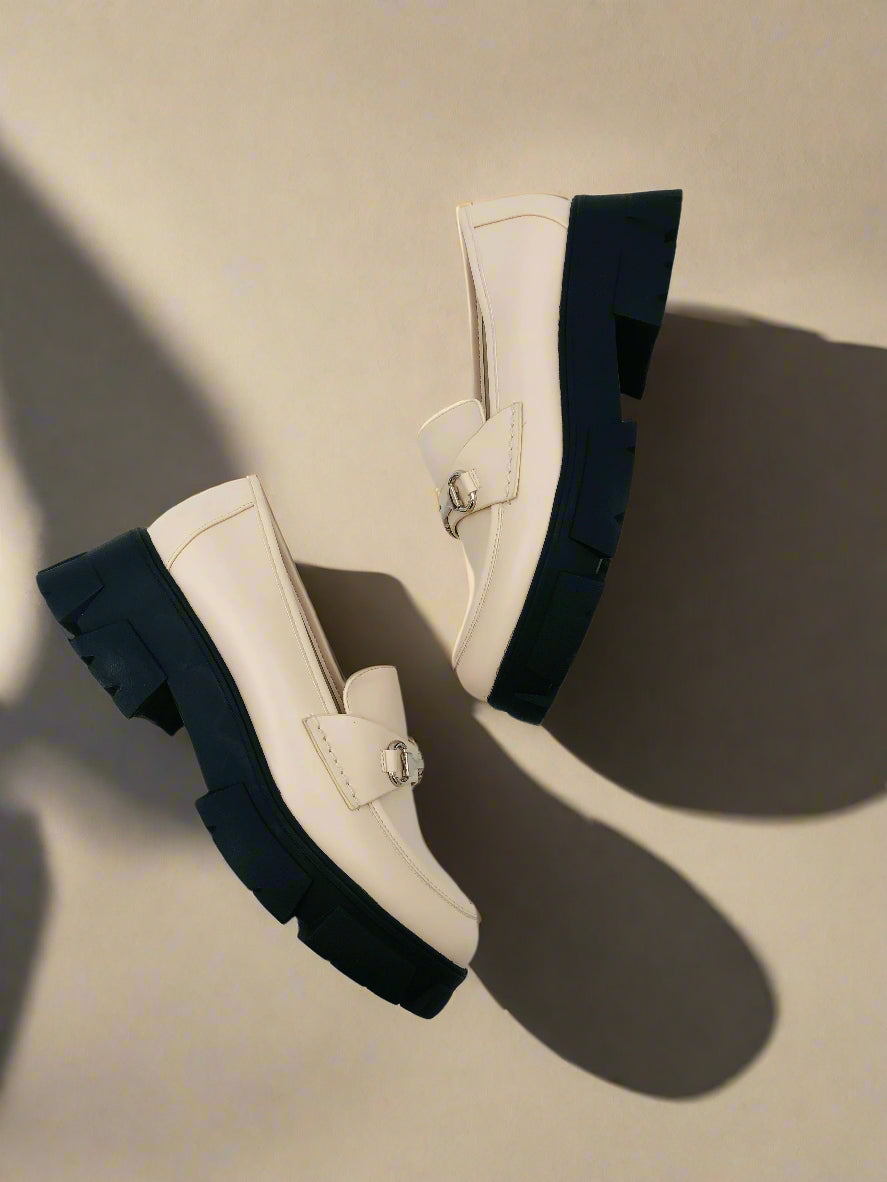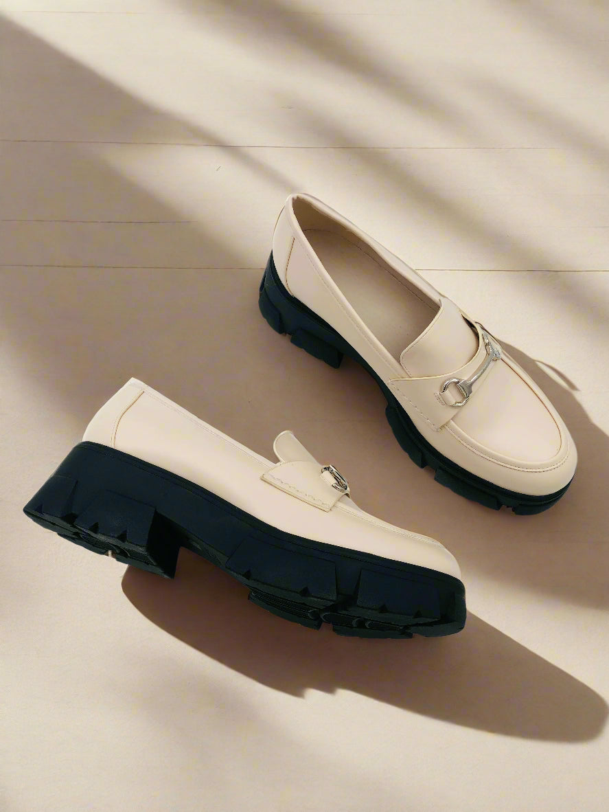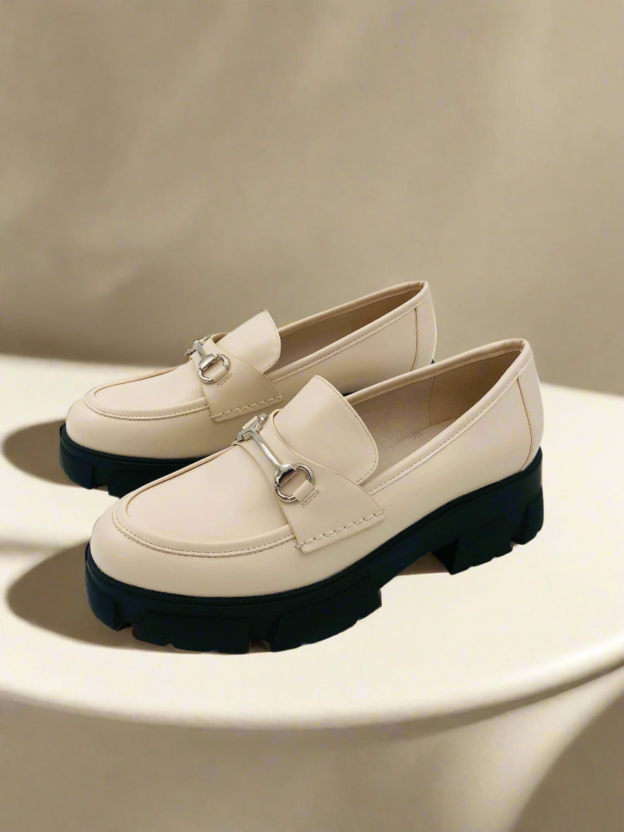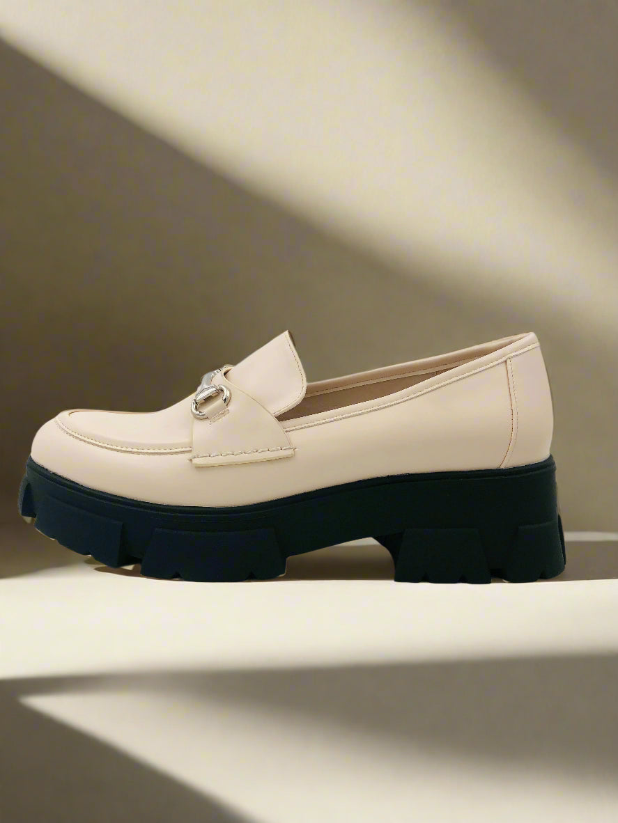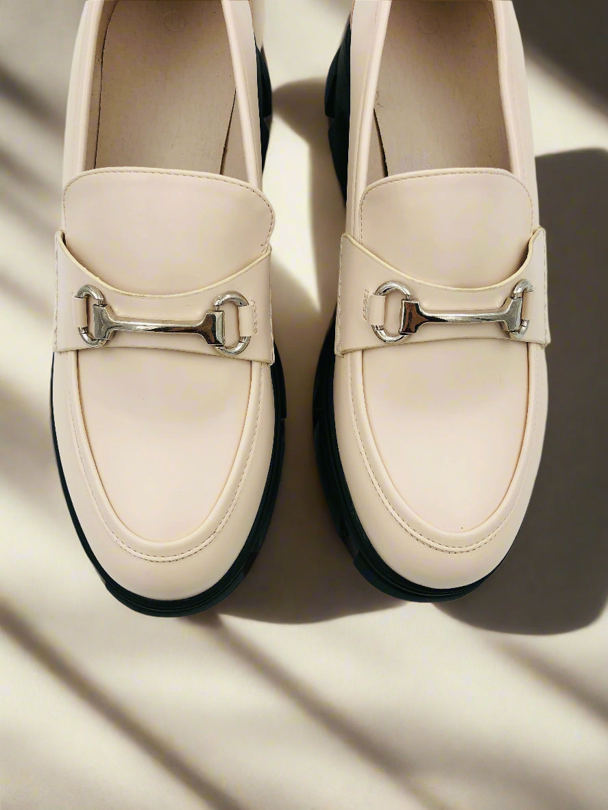 Classic and trendy beige loafers for women, featuring a padded footbed for comfort, a gold chain detail, and a black sole. Perfect for complementing various looks.
