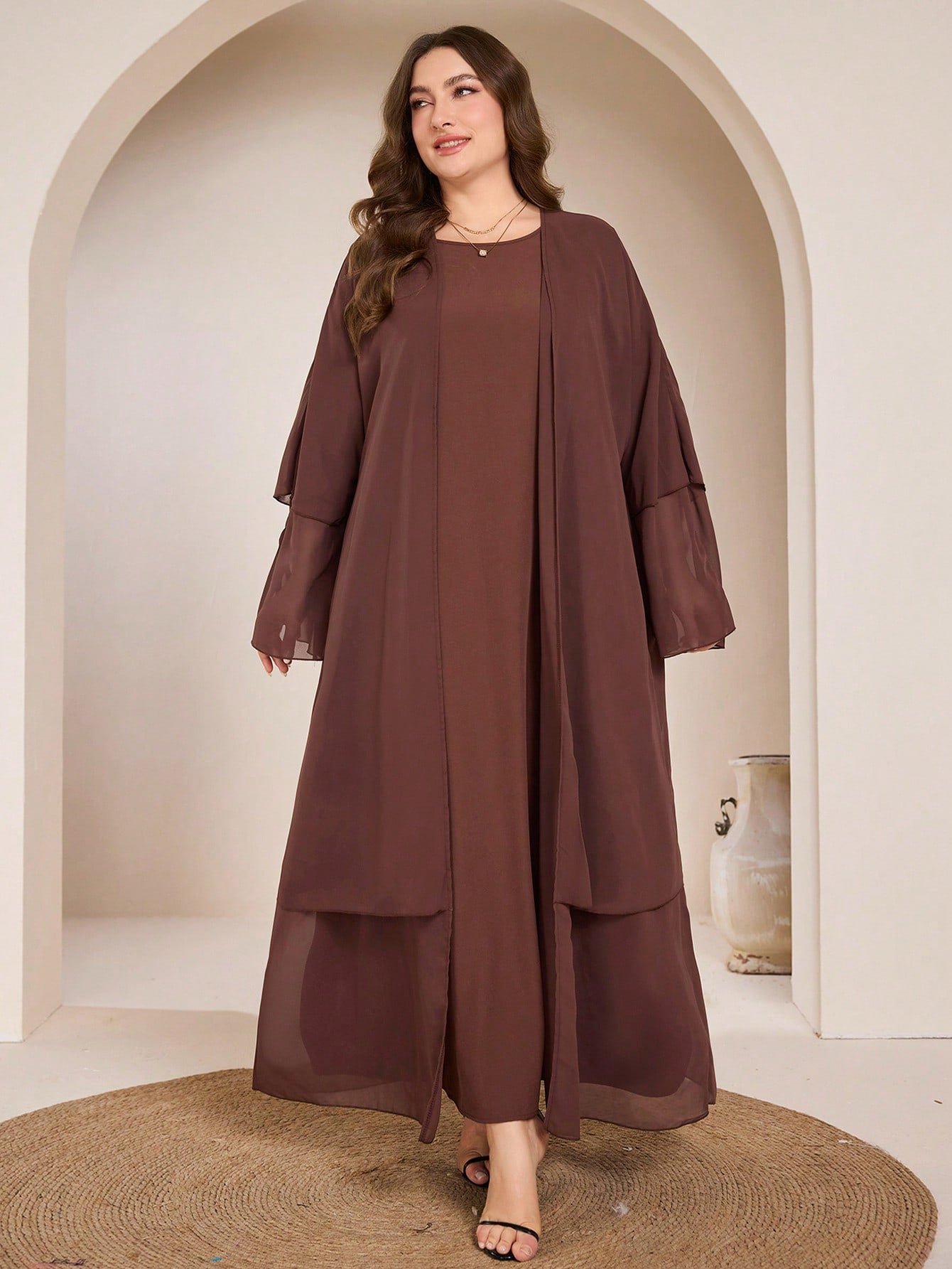 Graceveil Plus Size Women 2pcs Set Solid Color Long Sleeve Jacket & Chiffon Dress, Elegant & Conservative