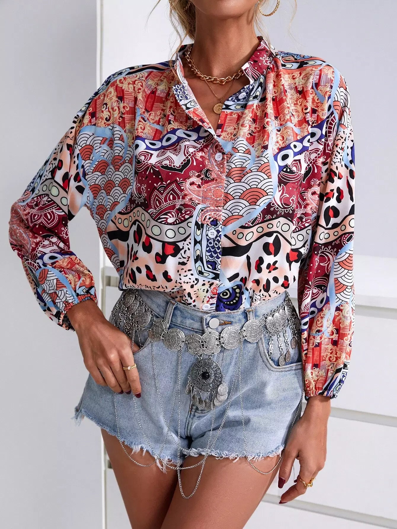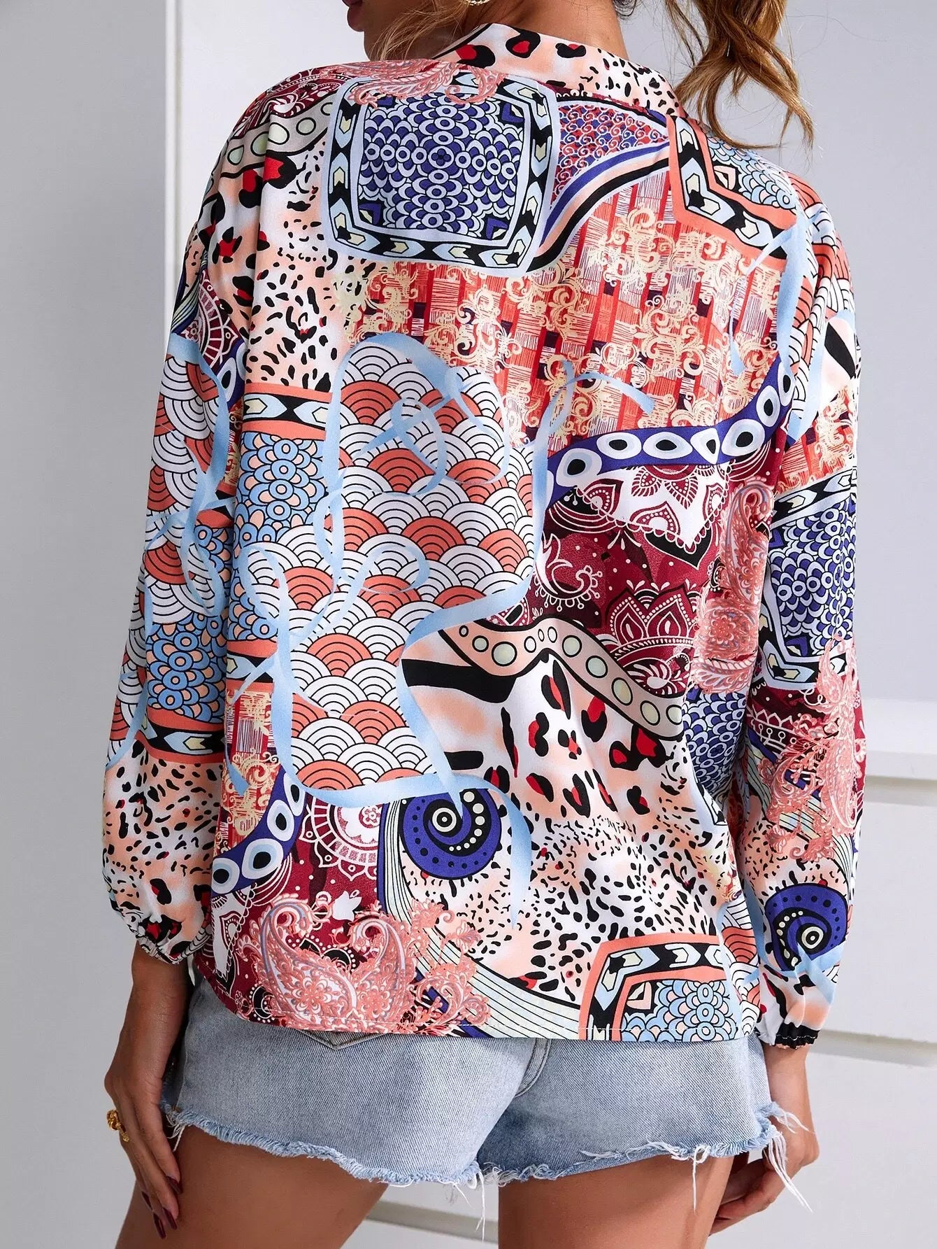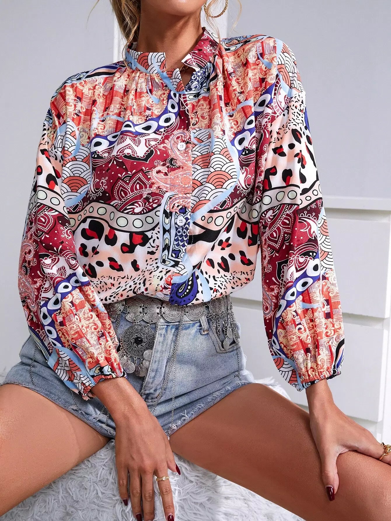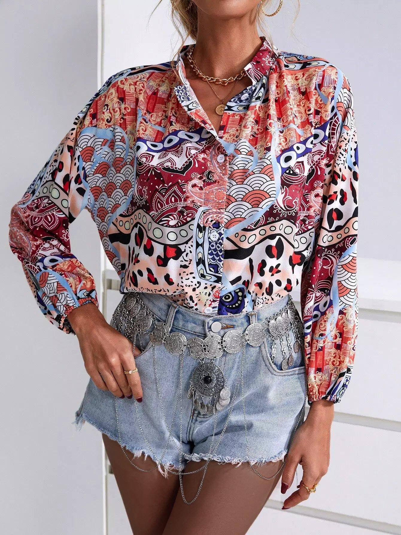 Graphic Print Mock Neck Button Up Blouse