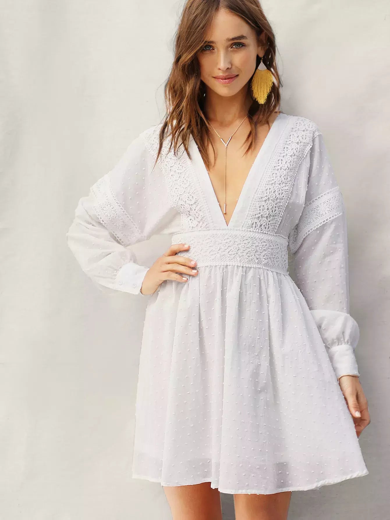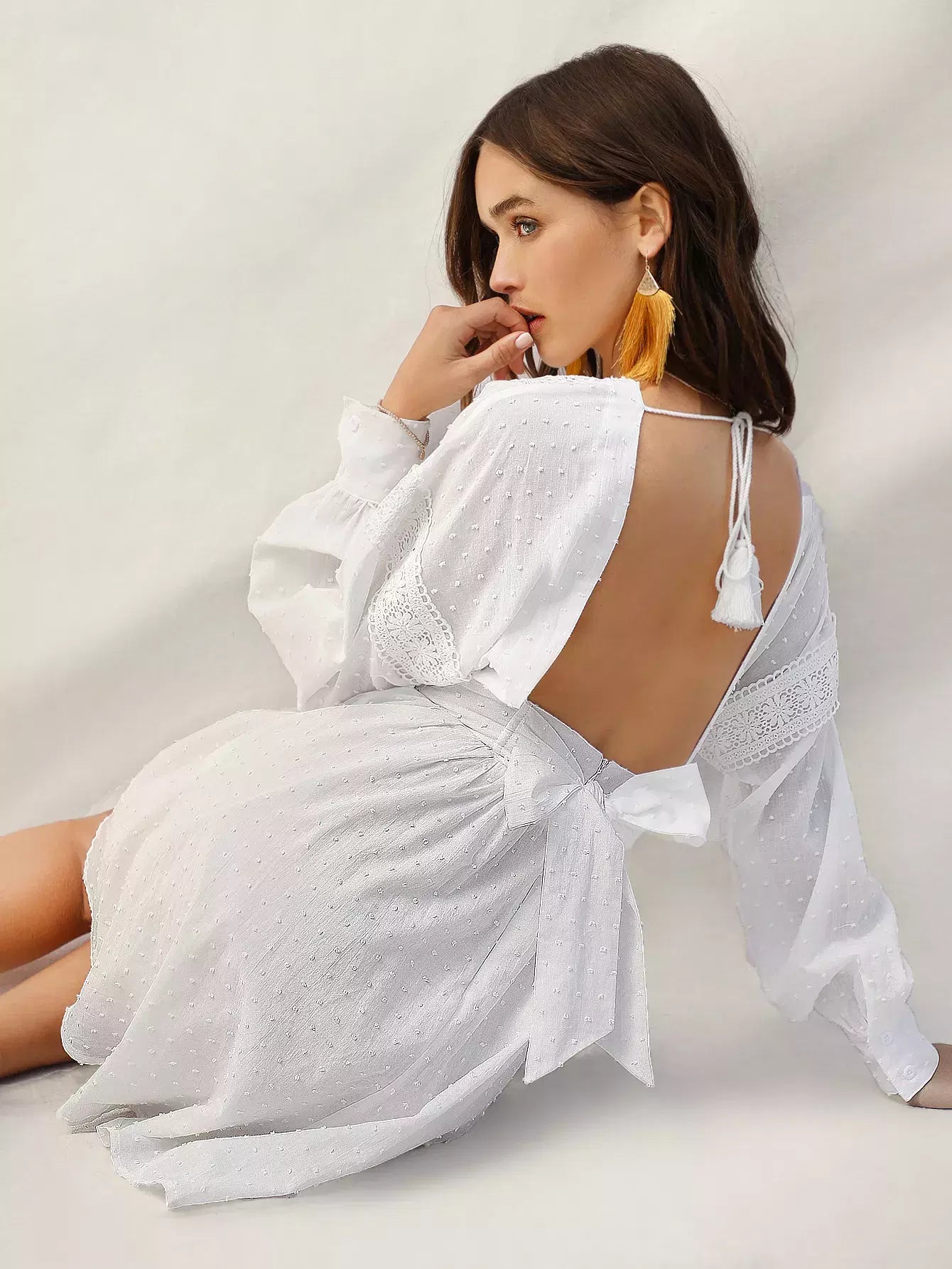 Guipure Lace Panel Swiss Dot Tied Back Plunge Dress