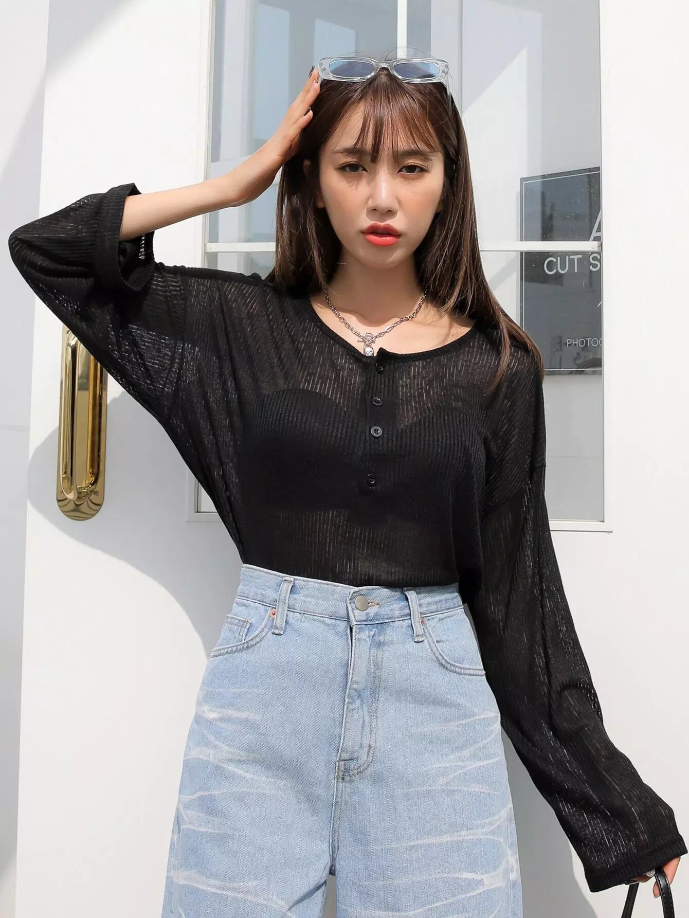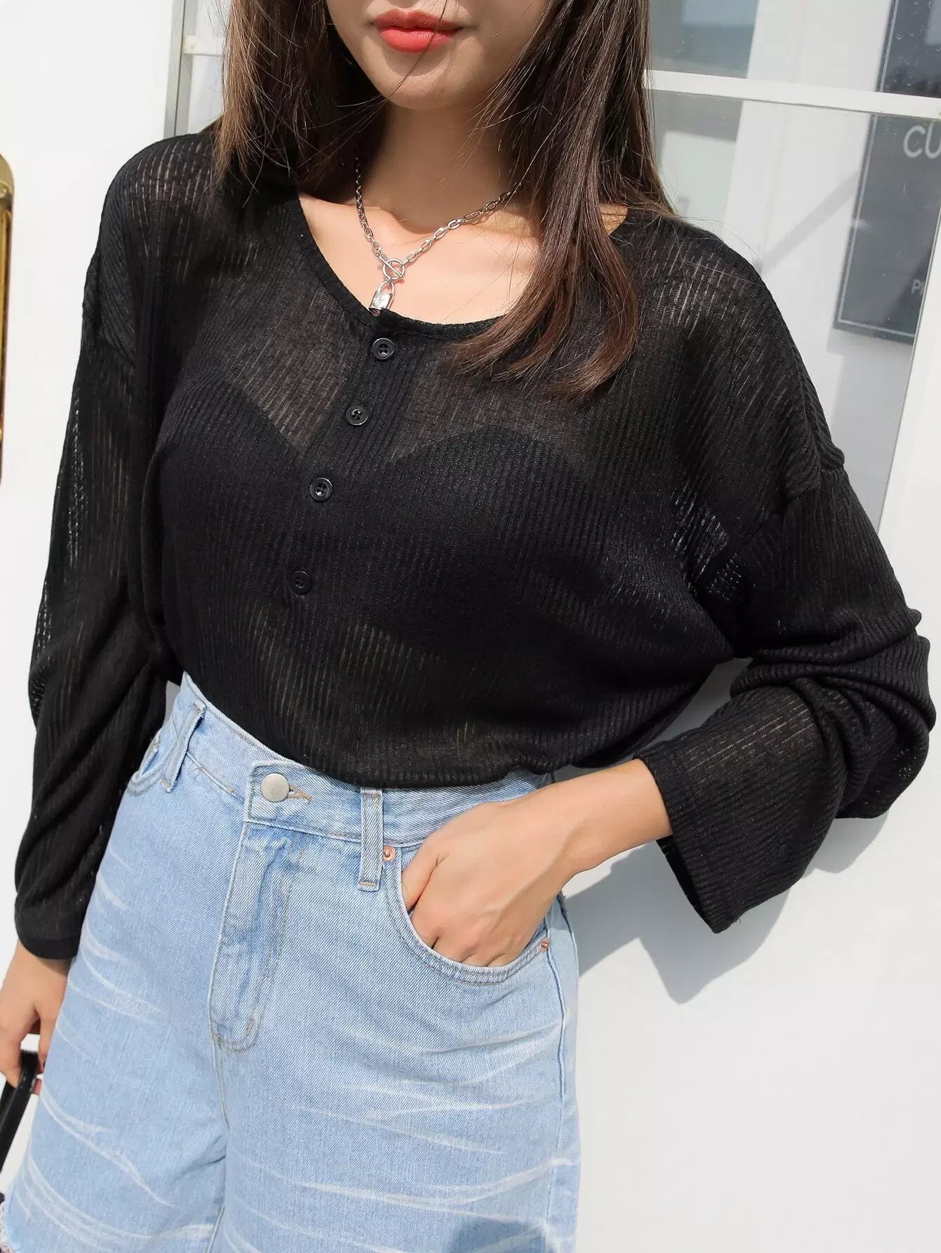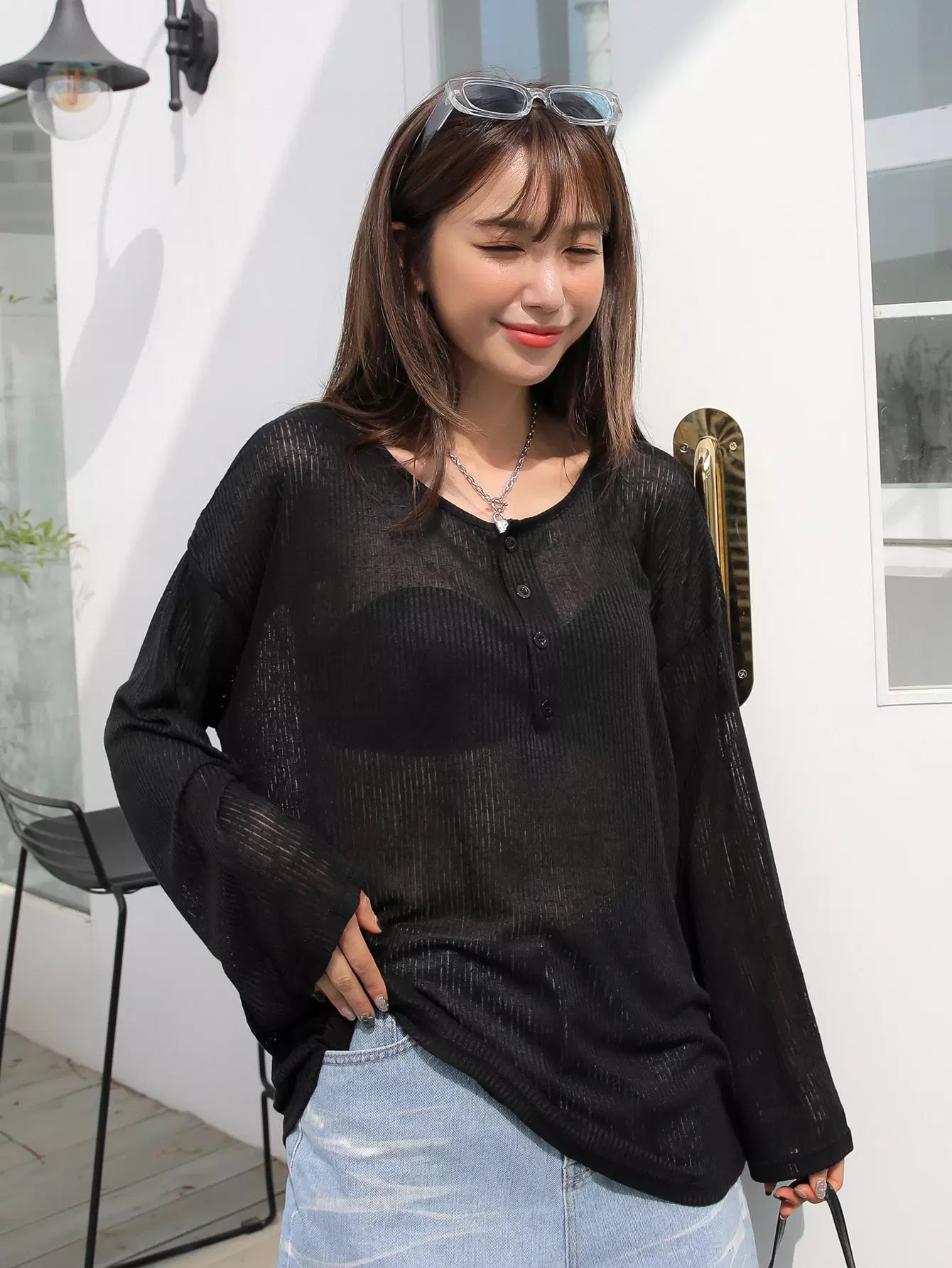 Half Button Drop Shoulder Top