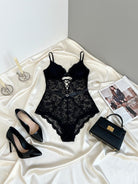 Heart Buckle Satin Waist Backless Lace Sheer Lingerie Jumpsuit Without Belt
