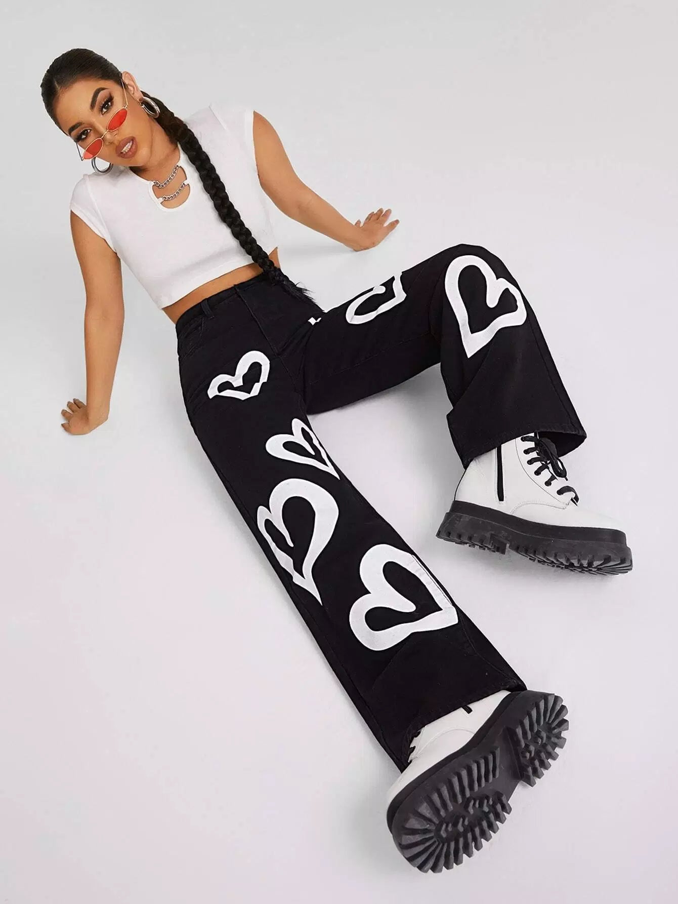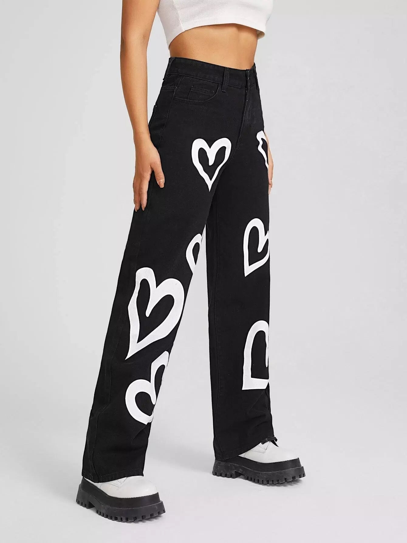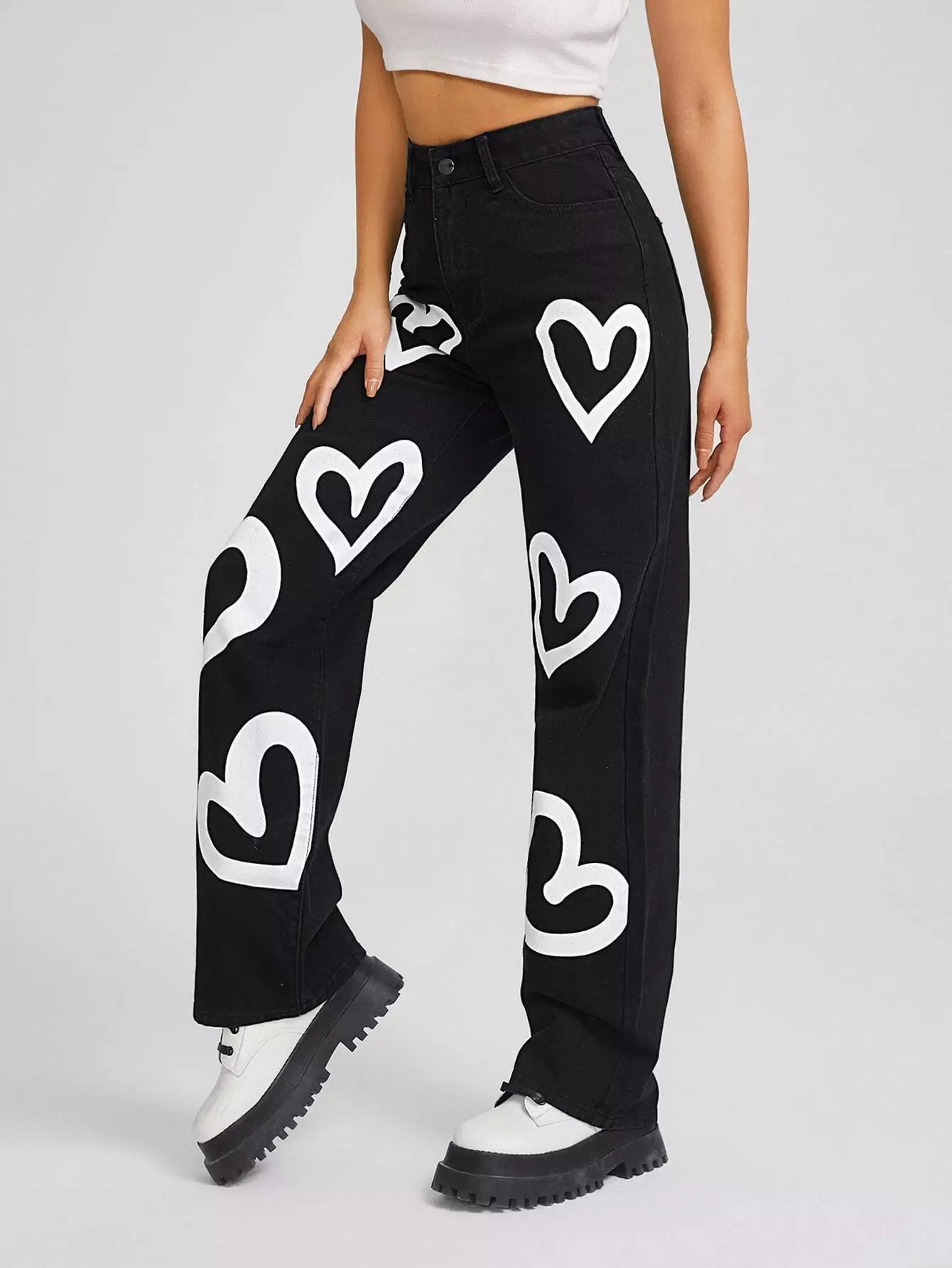 High Waist Heart Print Boyfriend Jeans