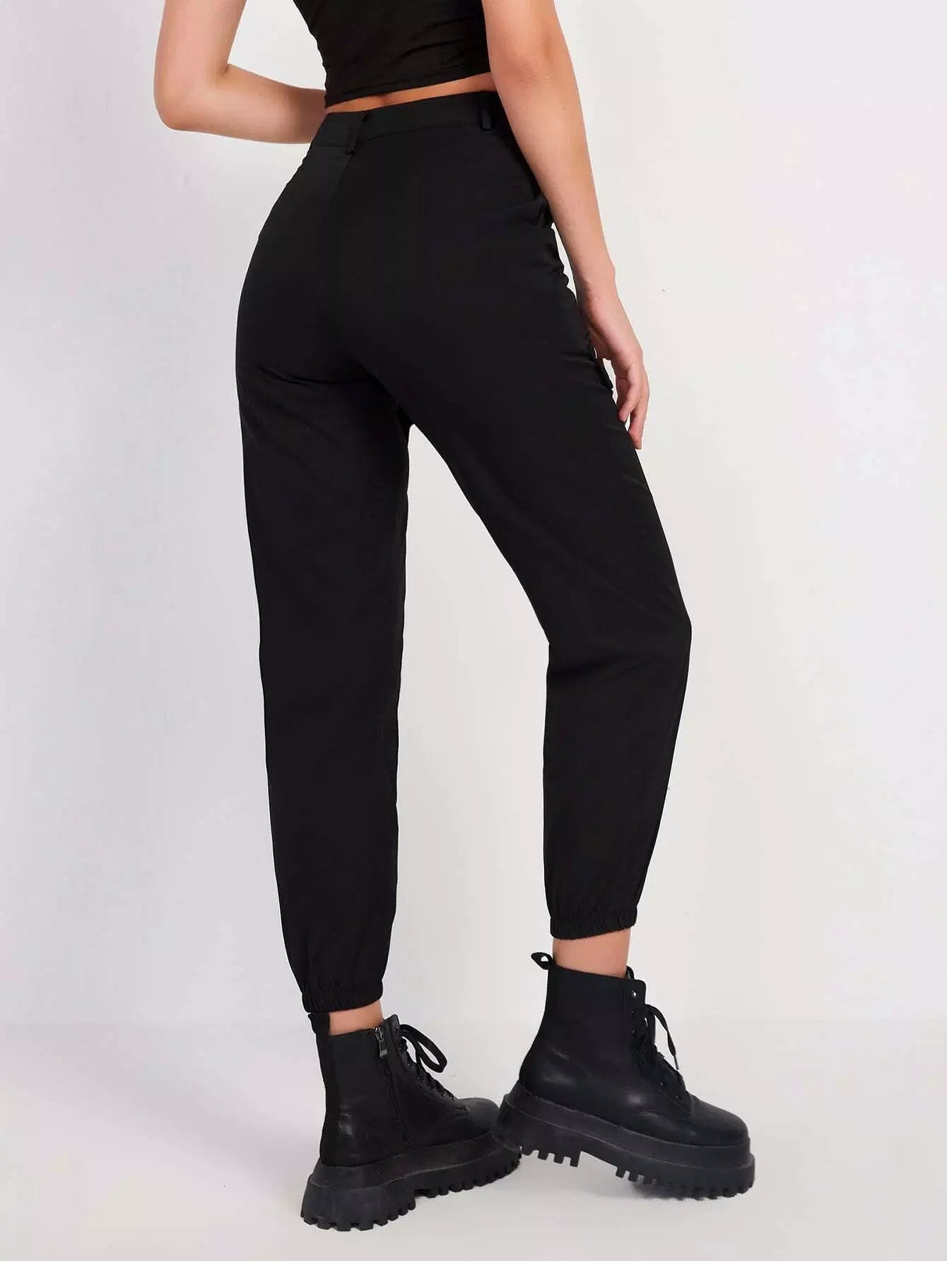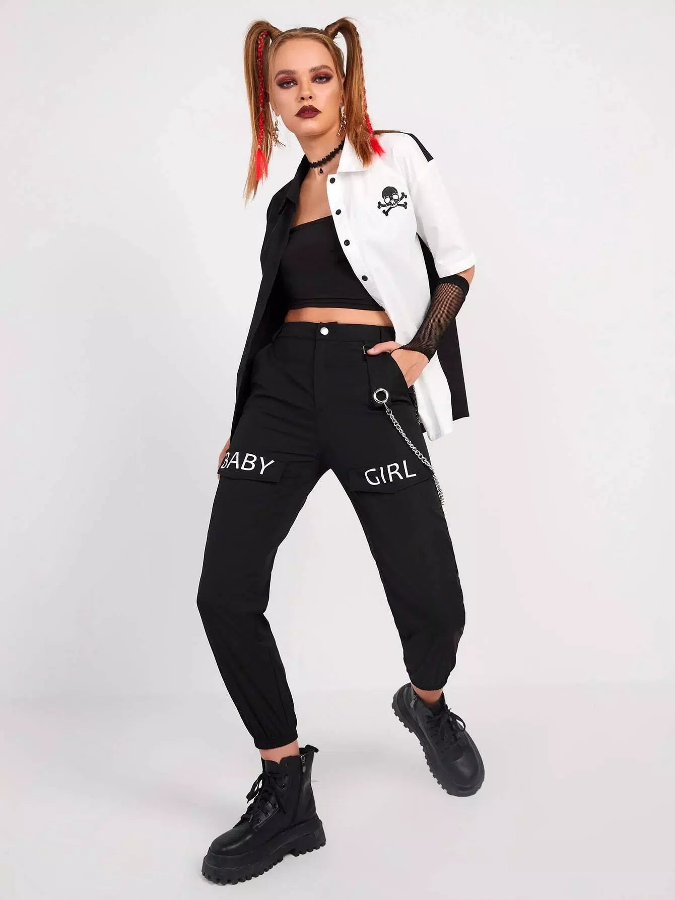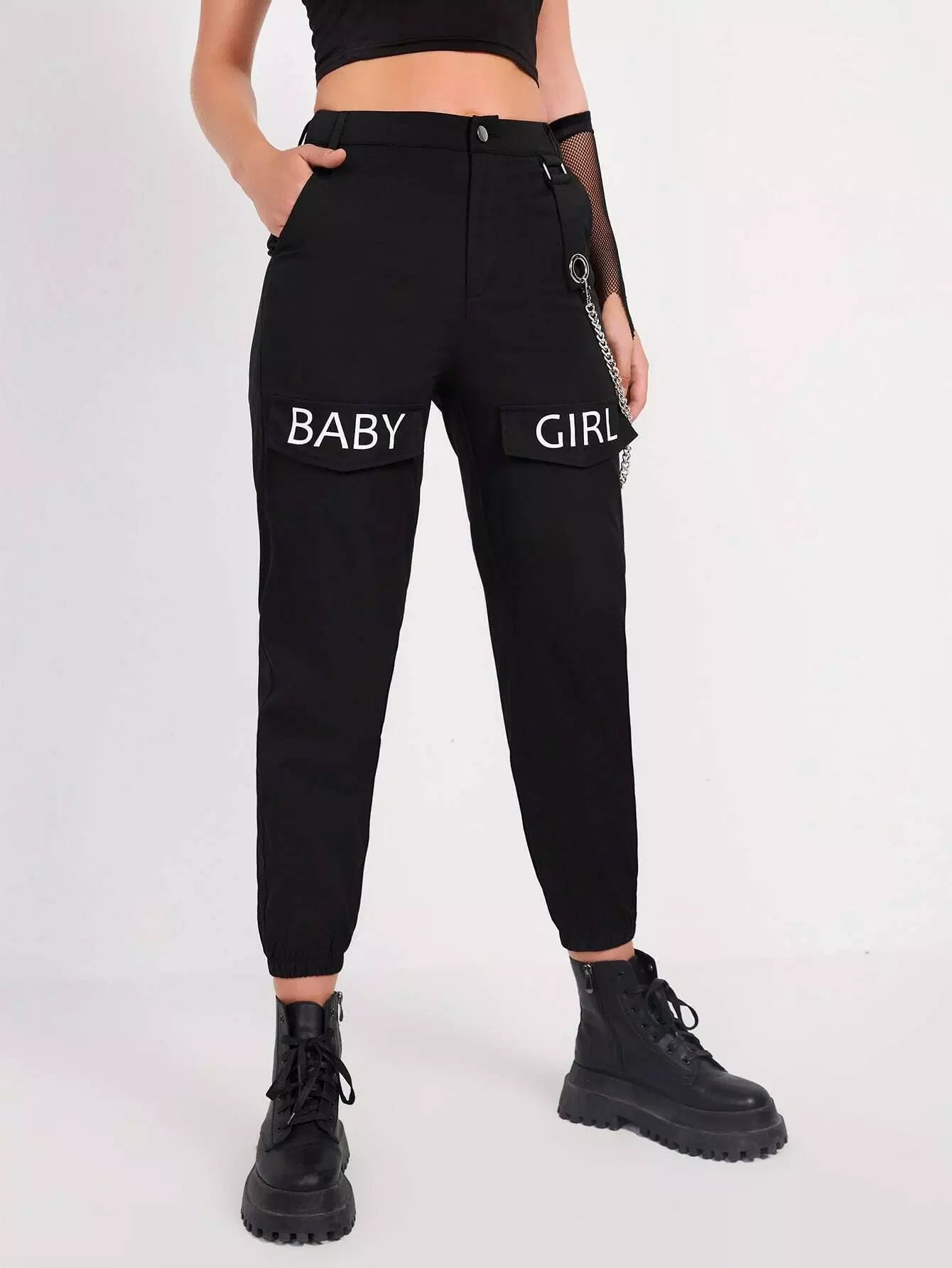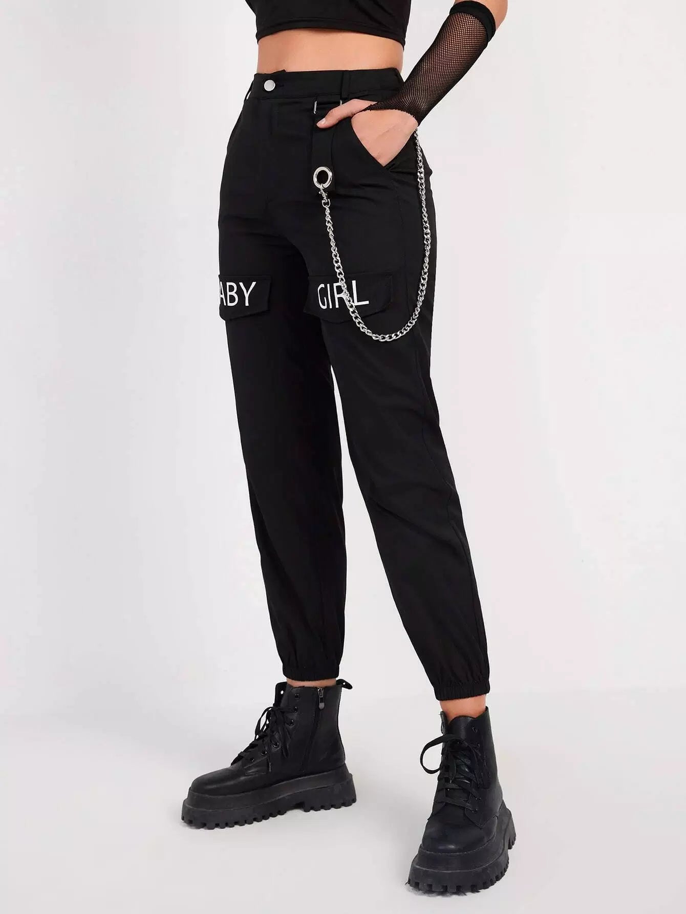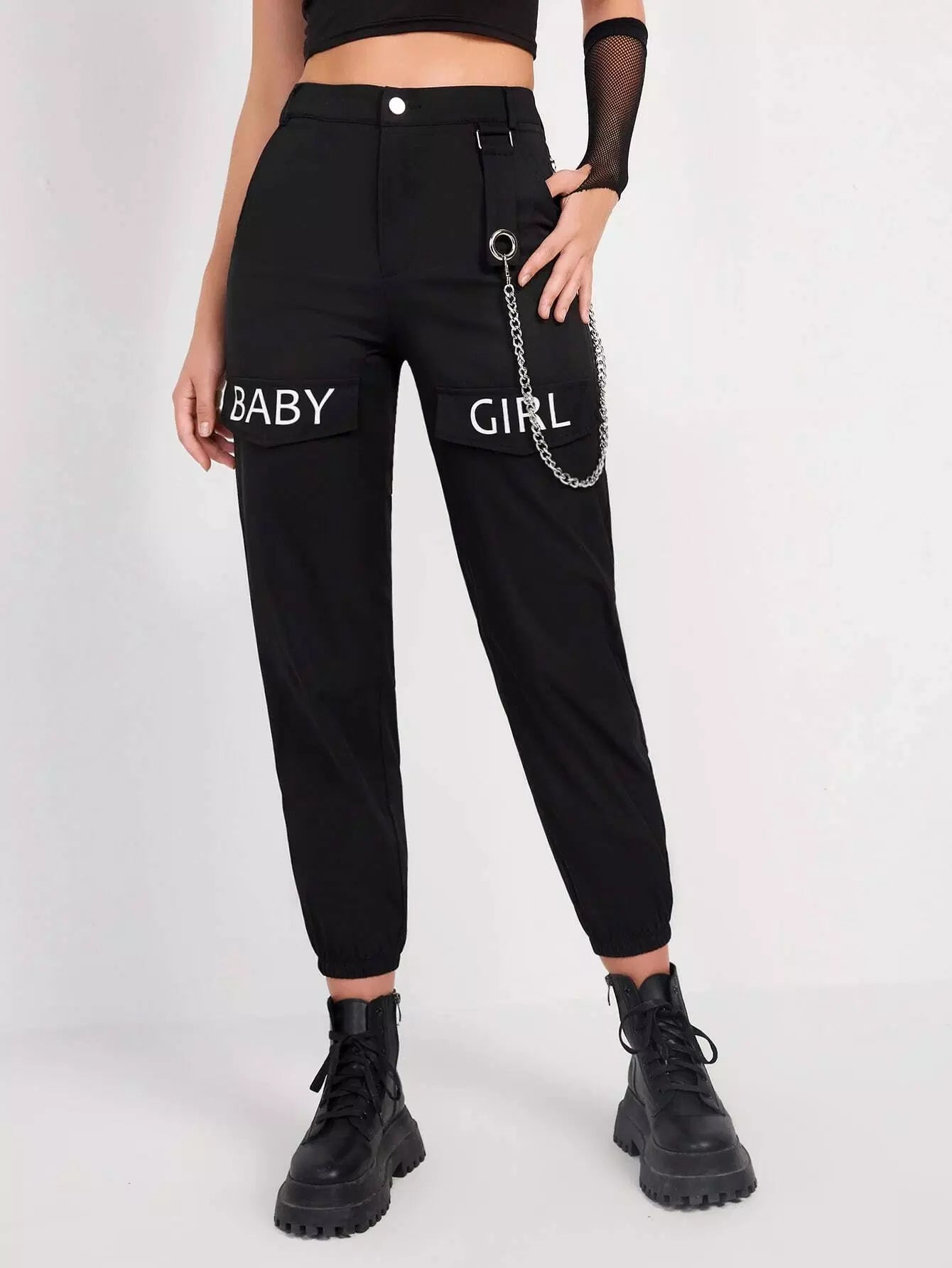High Waist Letter Graphic Flap Detail Joggers With Chain