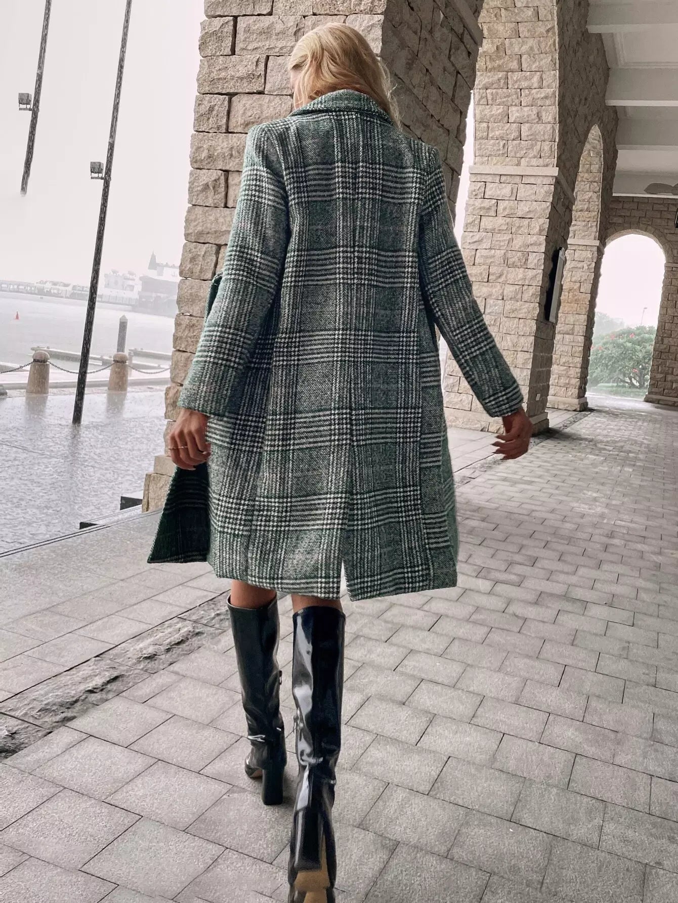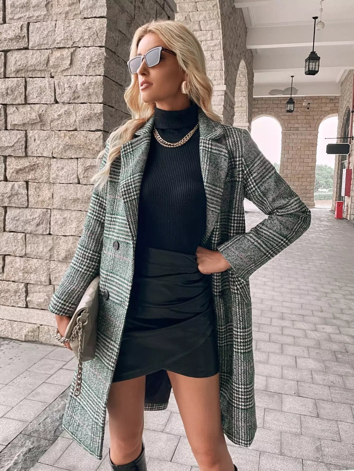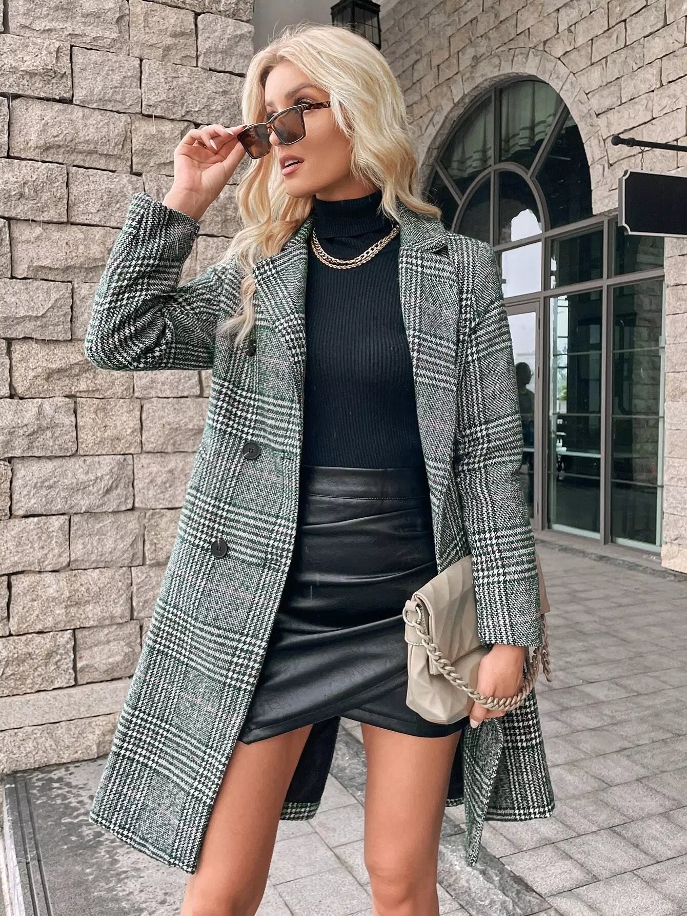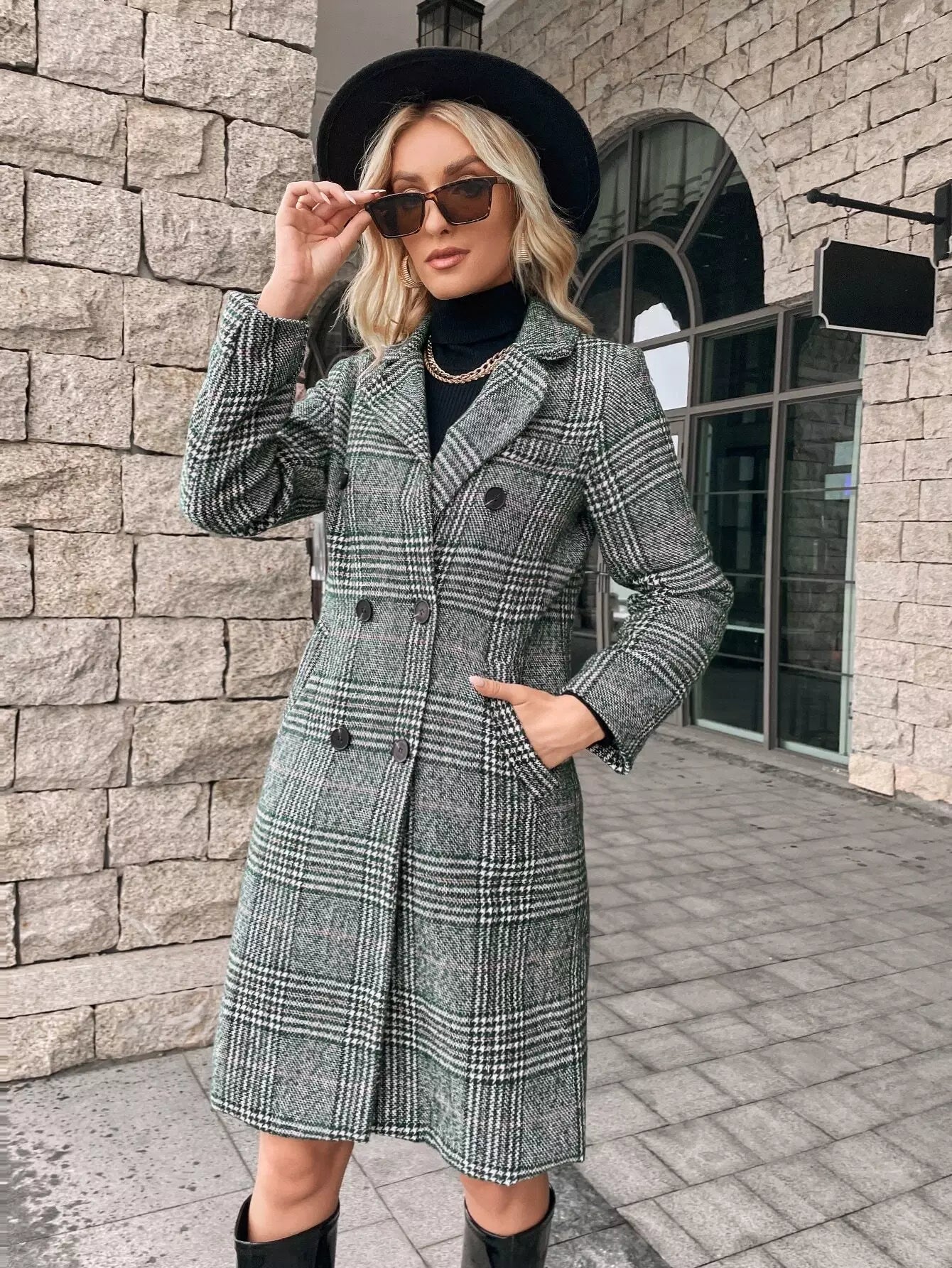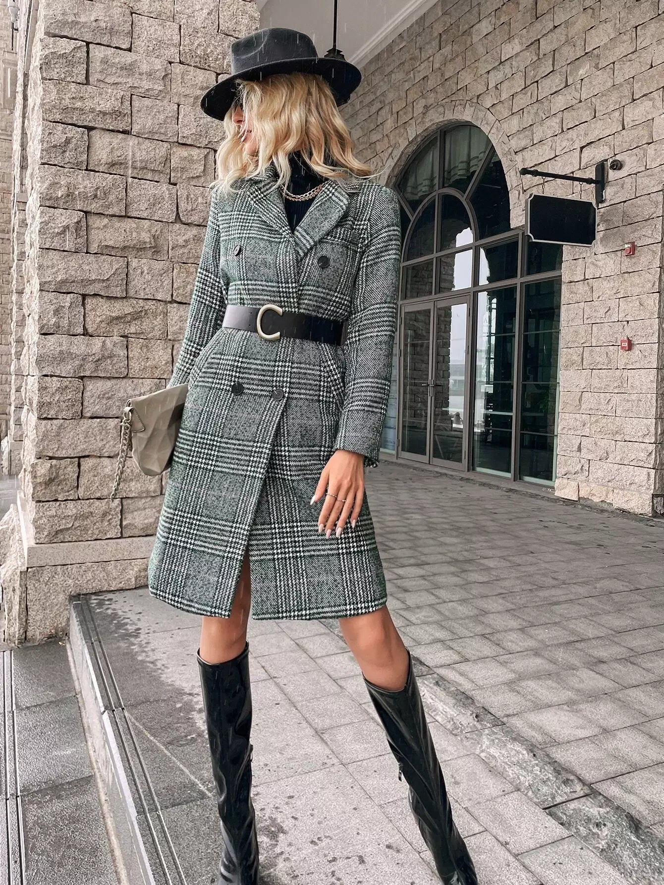 Houndstooth Print Double Breasted Overcoat Without Belt