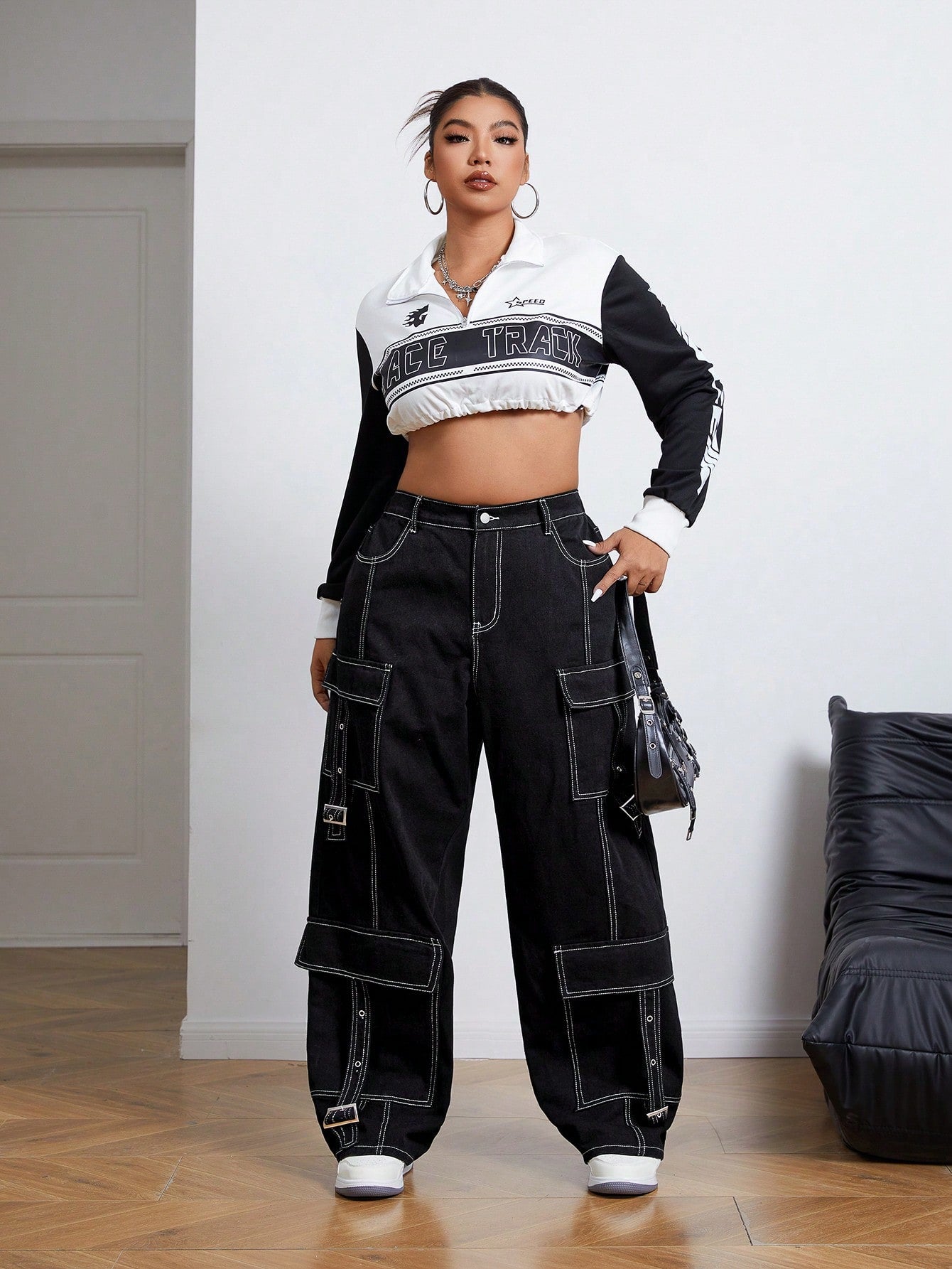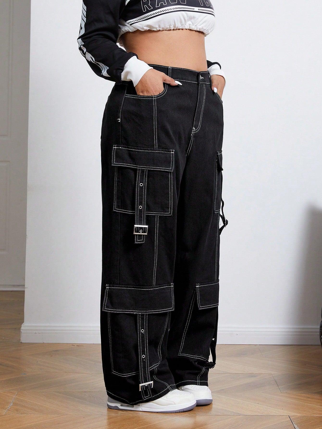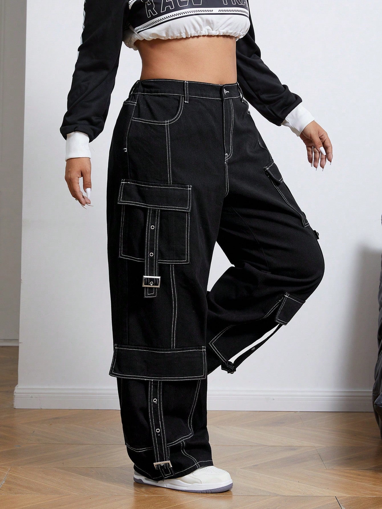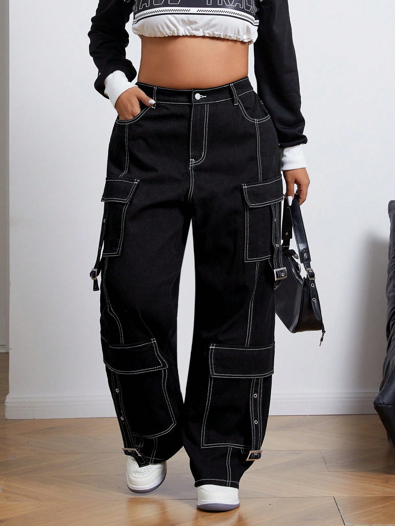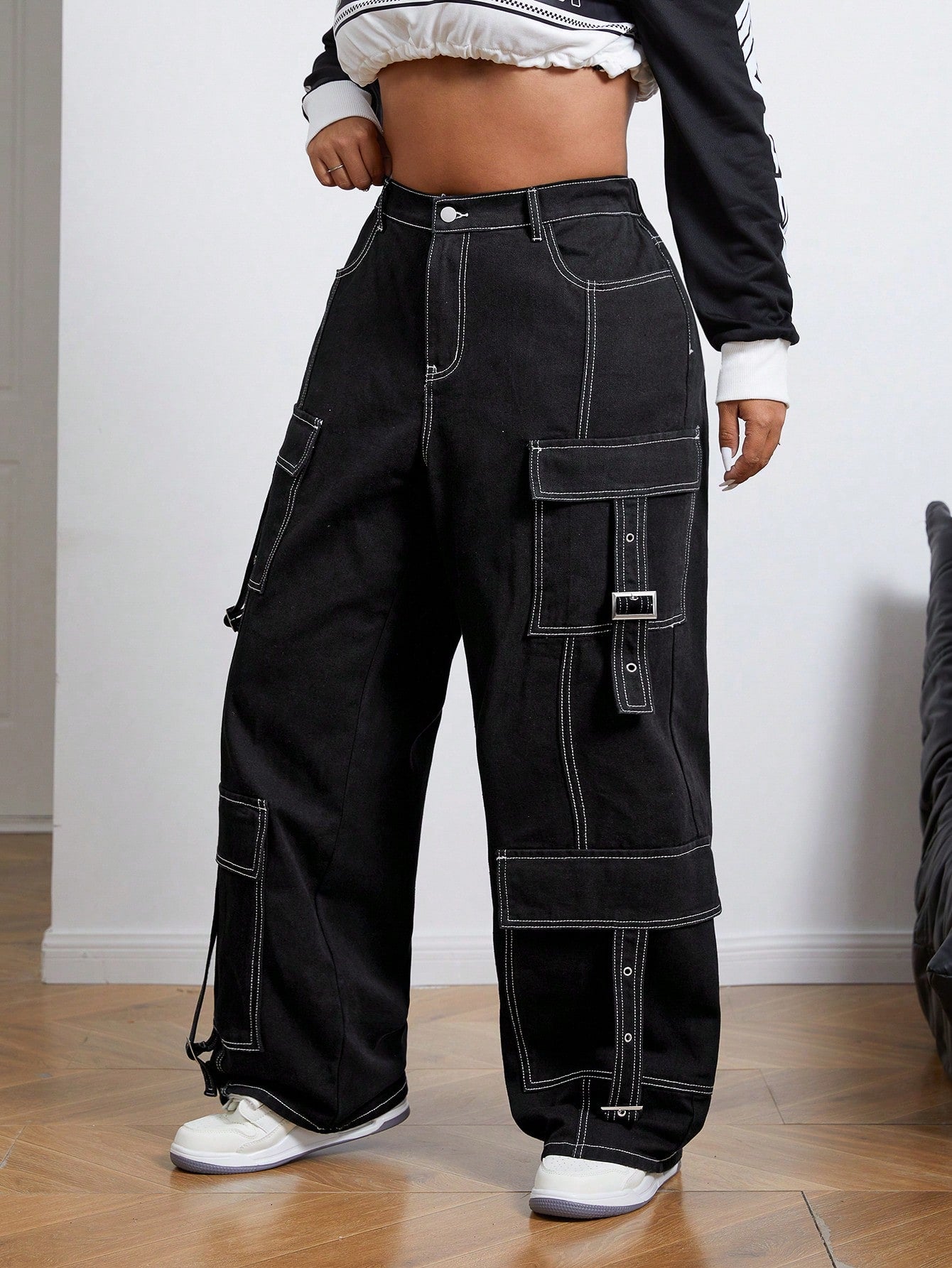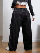 ICON Plus Size Women Cargo Pocket Wide Leg Loose Denim Casual Pants