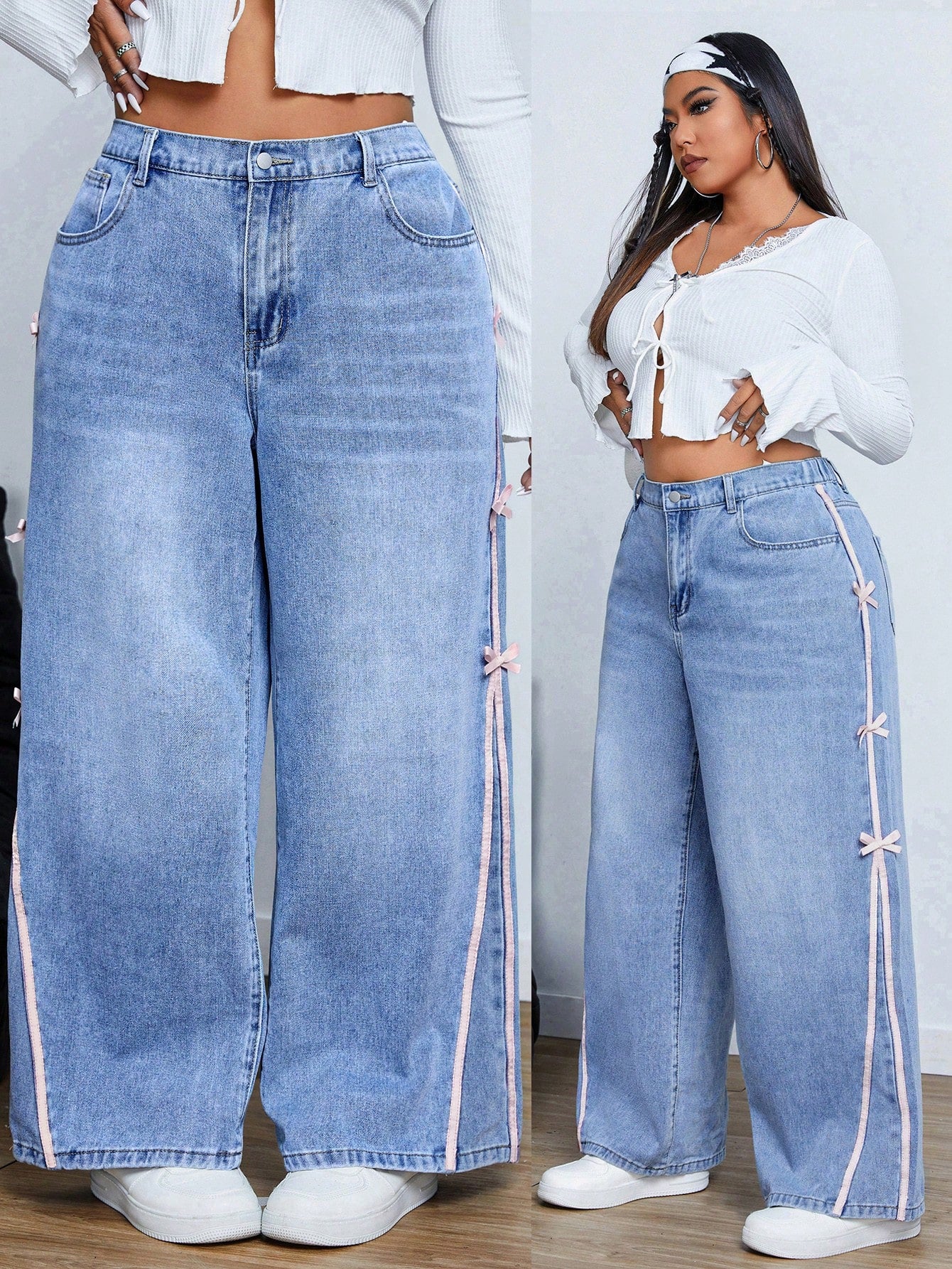ICON Plus Size Women Casual Loose Butterfly Decor Sidestripe Print Insert Pockets Jeans