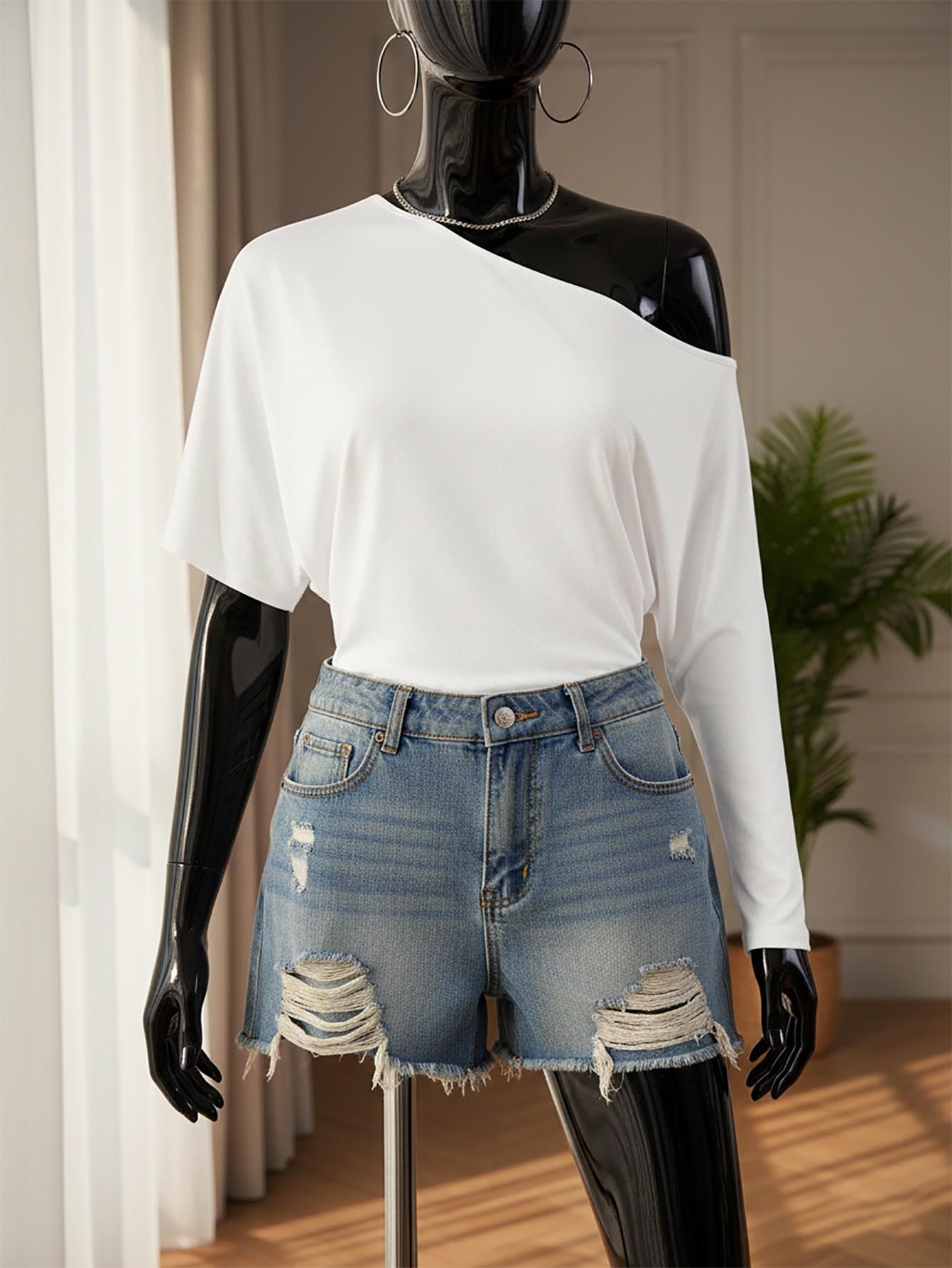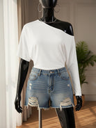 ICON White Casual Knitted T-Shirt With Asymmetrical Neck And Batwing Short Sleeves One Shoulder