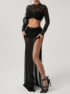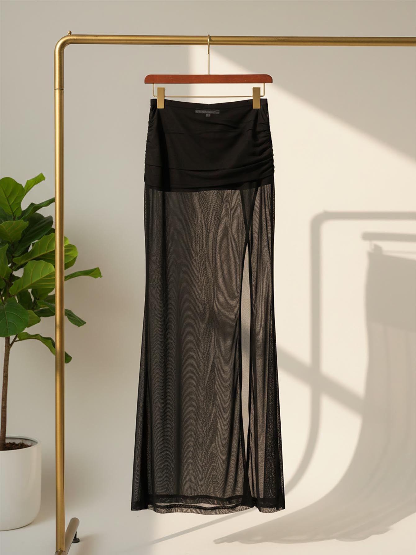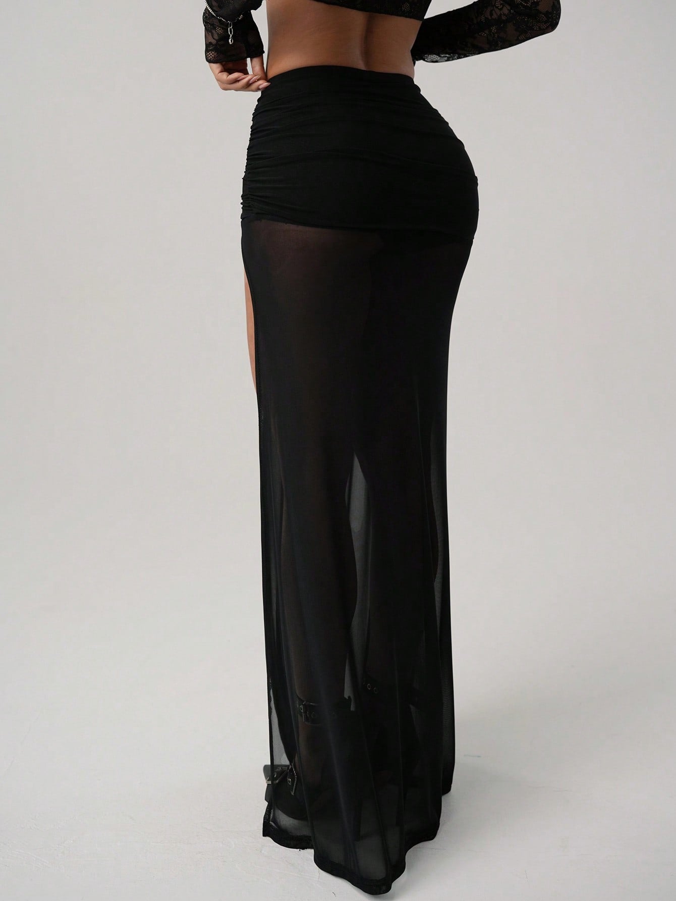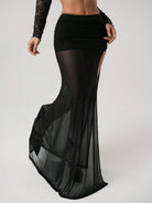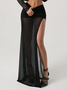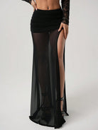 ICON Women's High Slit Black Mesh Ruched Waist Sexy Vacation Metal Decor Skirt