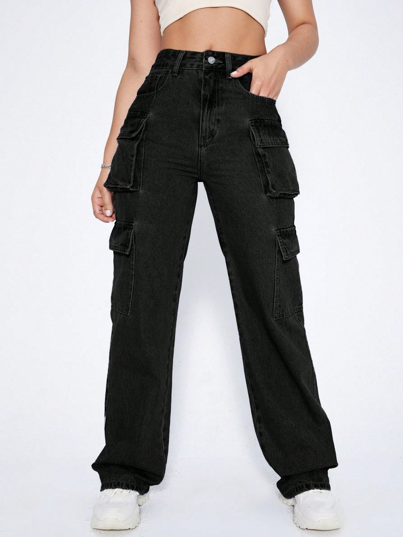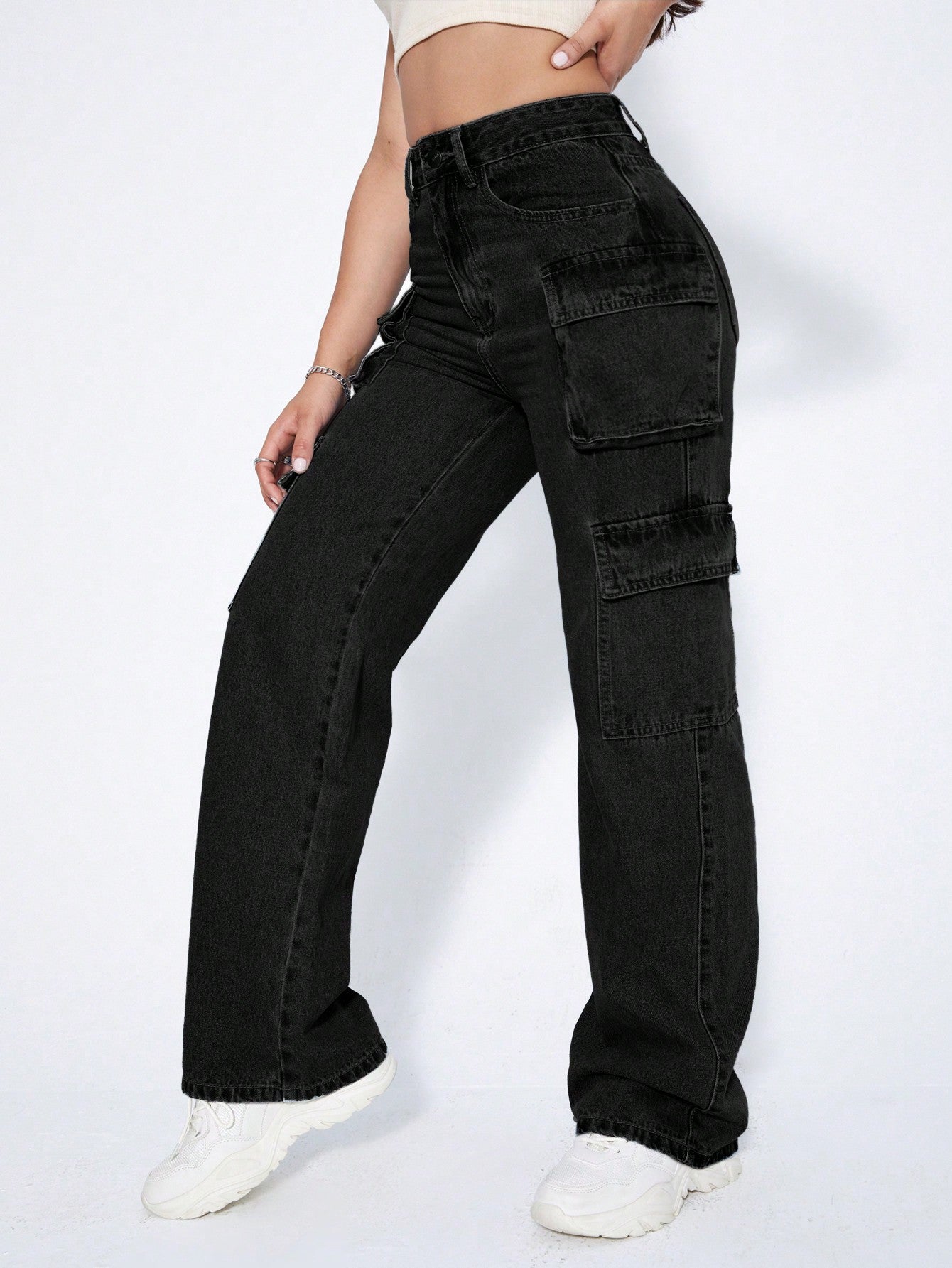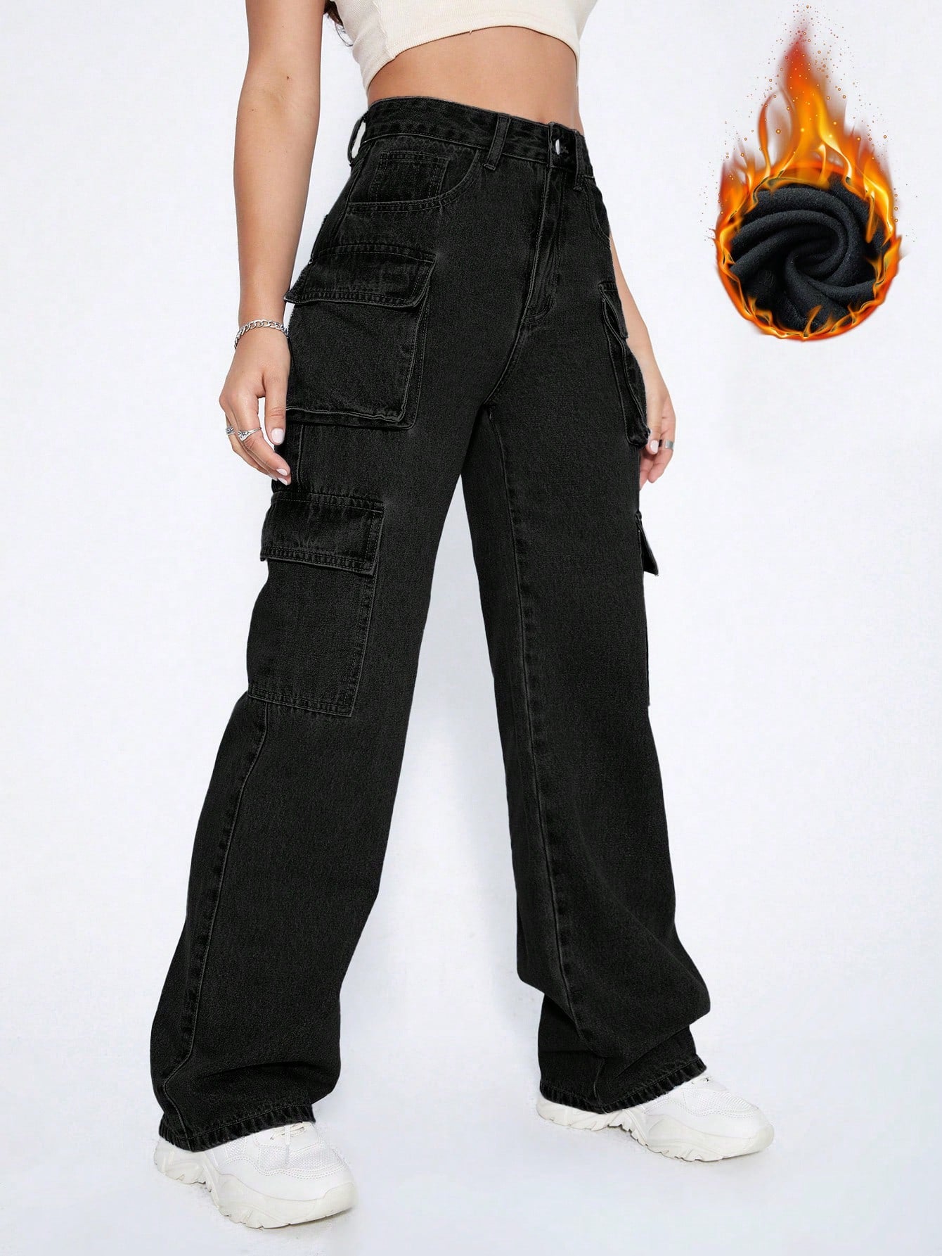 ICON Y2k Black High Waist Flap Pocket Cargo Brushed Fabric Warm Jeans Thickened Denim