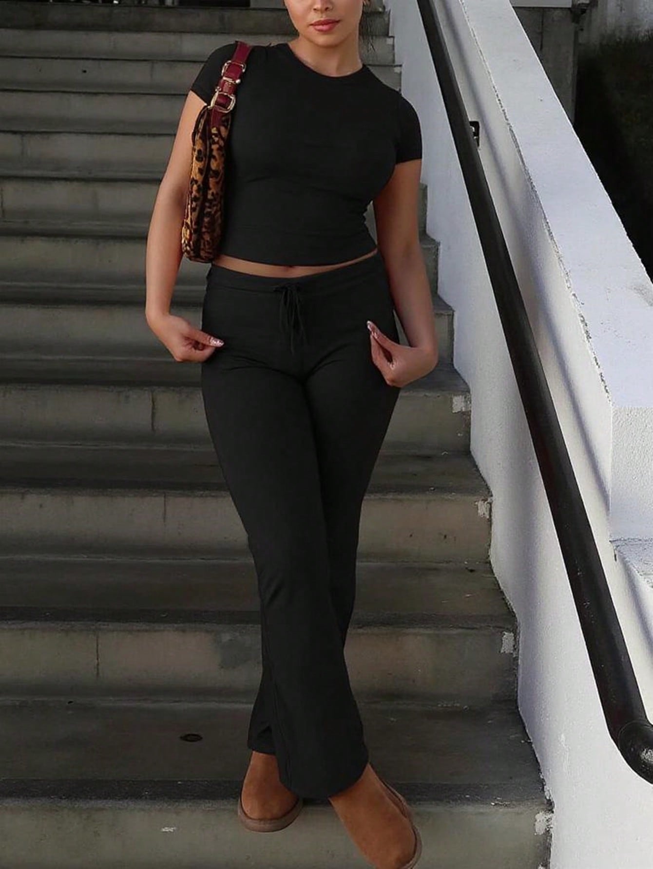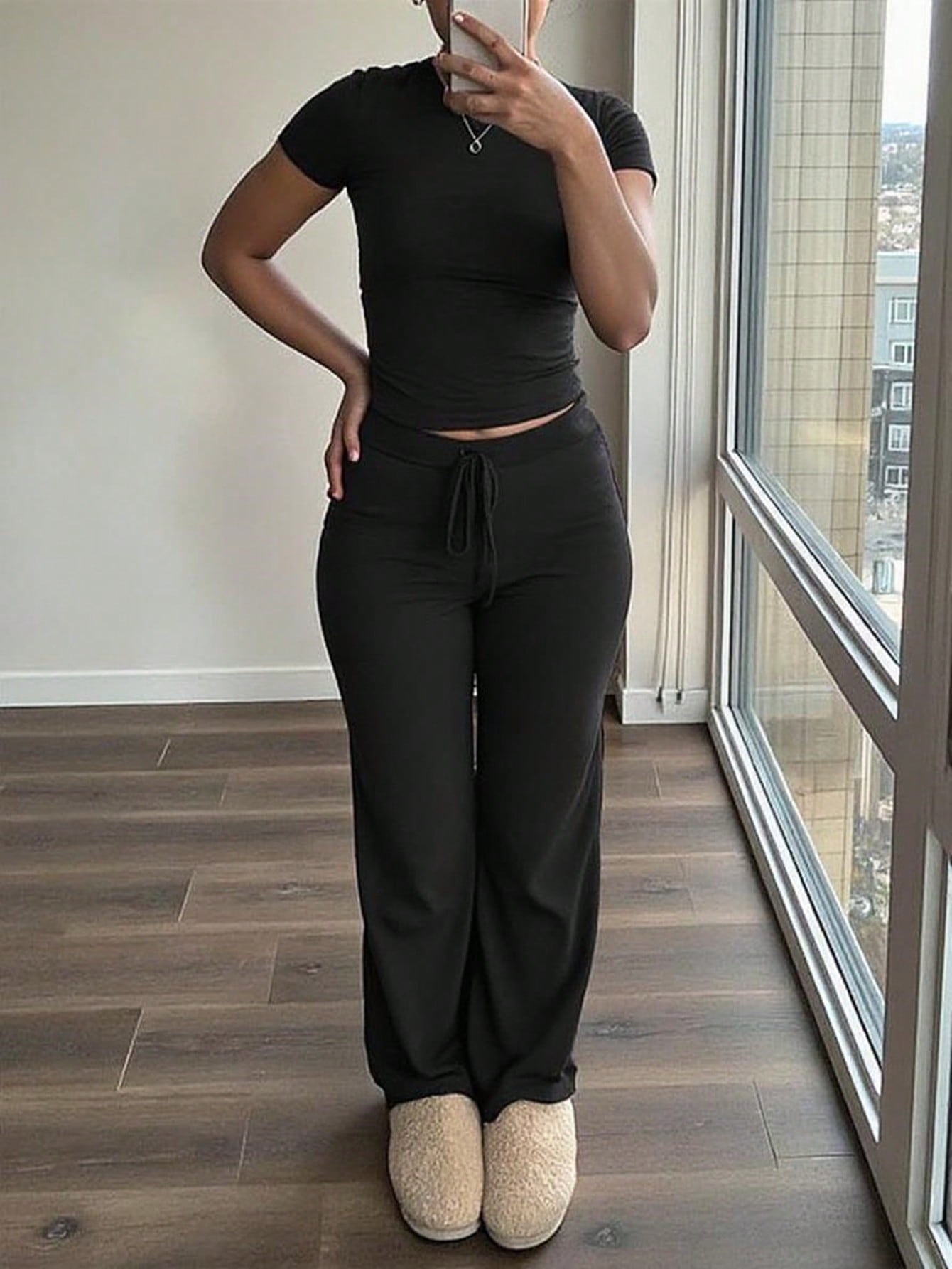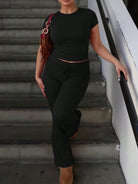 INAWLY Women's Solid Color Crew Neck Short Sleeve T-Shirt And Pants 2-Piece Casual Set