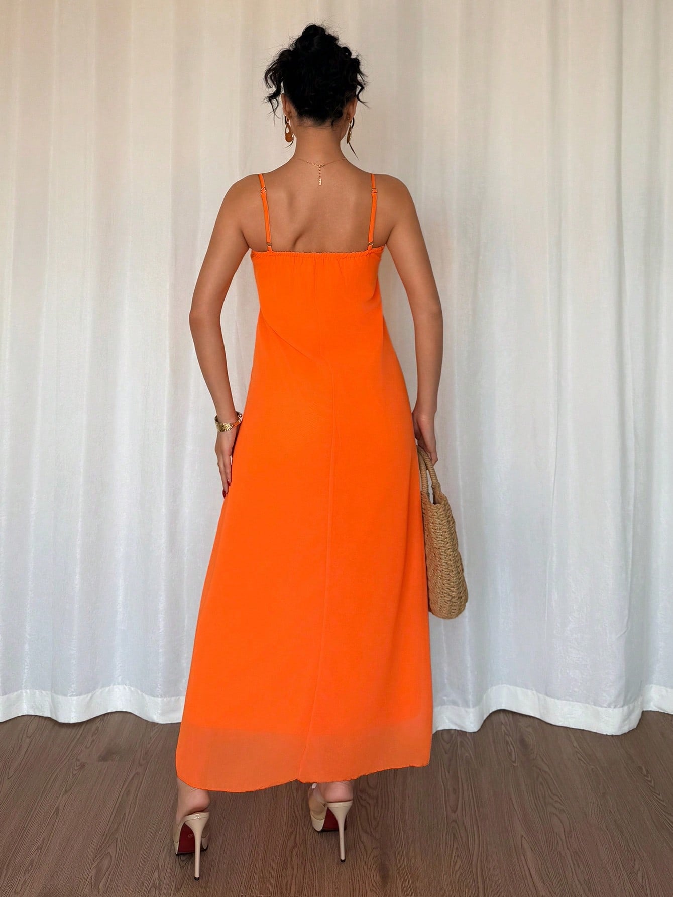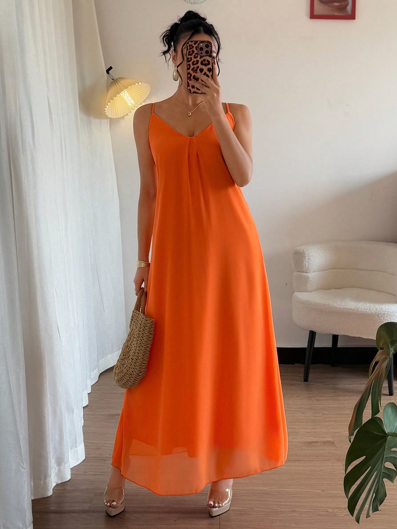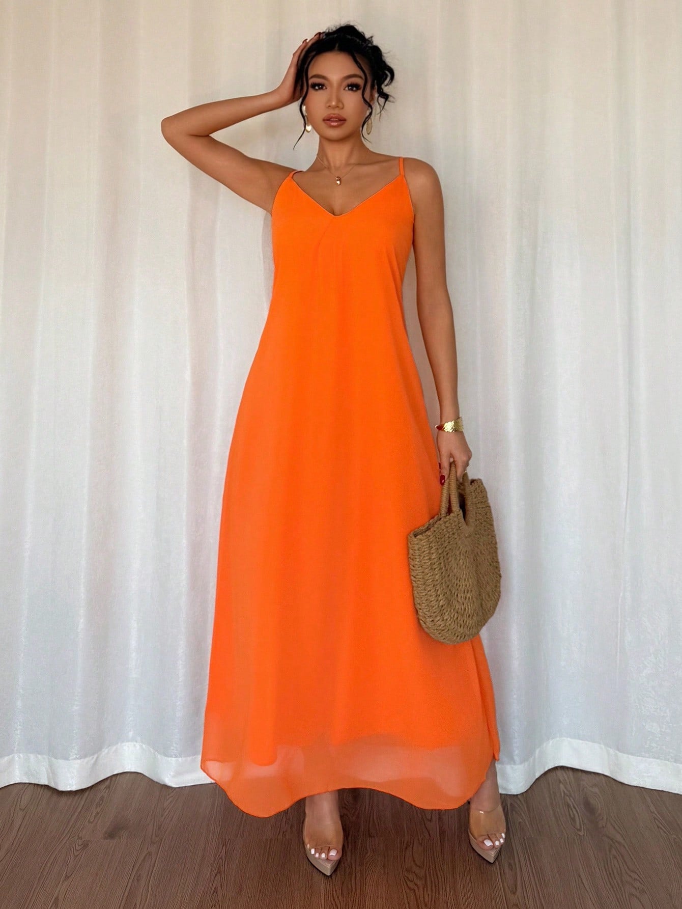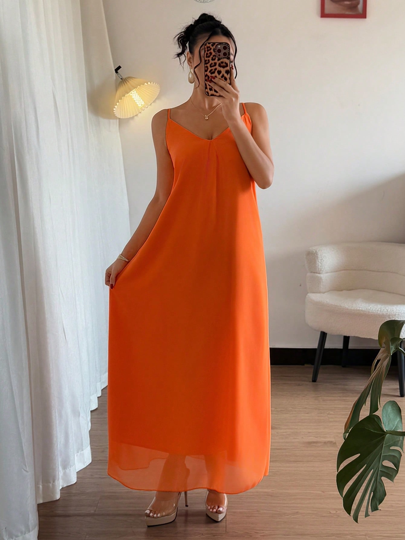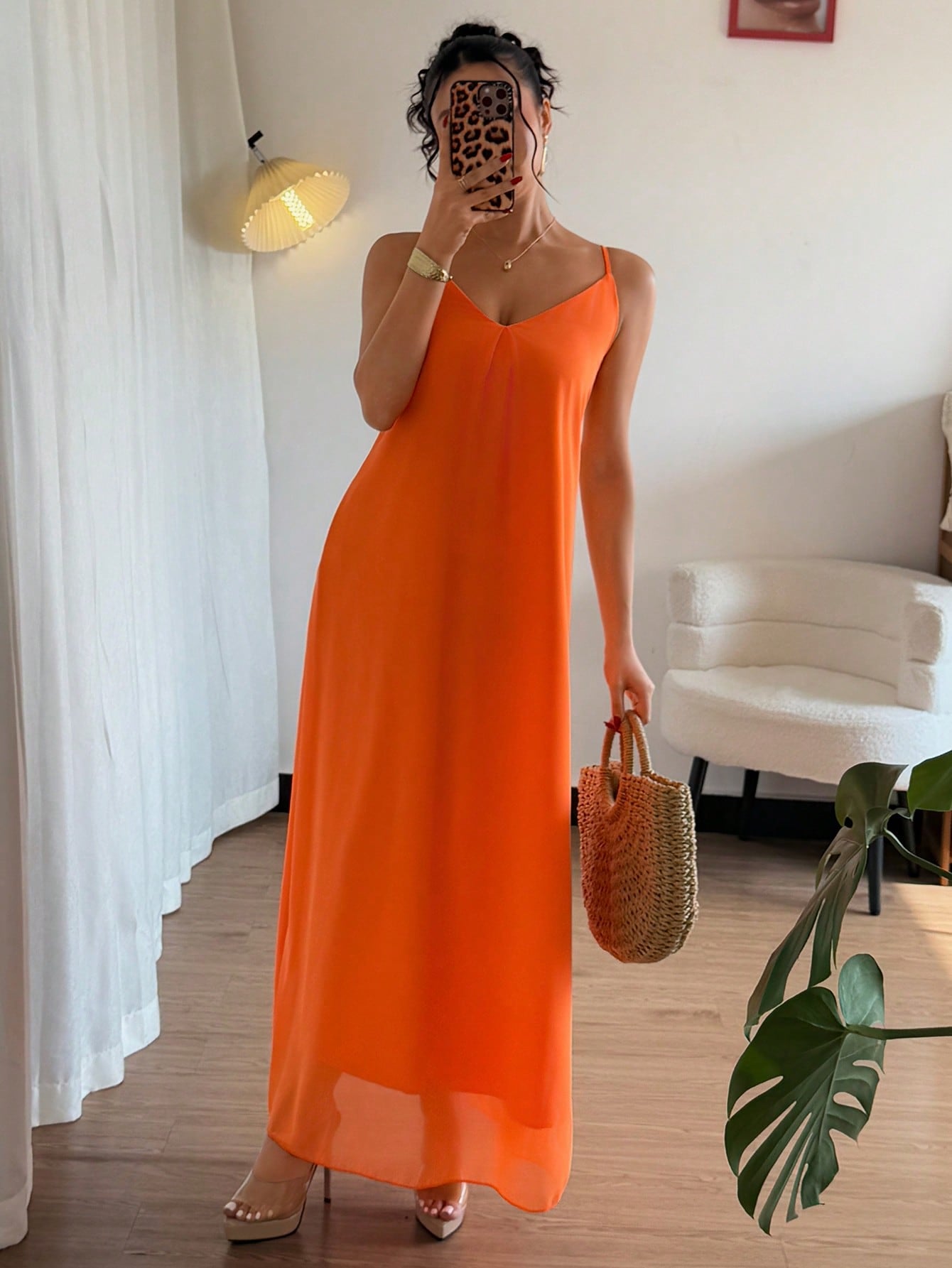 Islaluna Orange Casual Oversized Dress, Sleeveless Loose Long Chiffon Dress