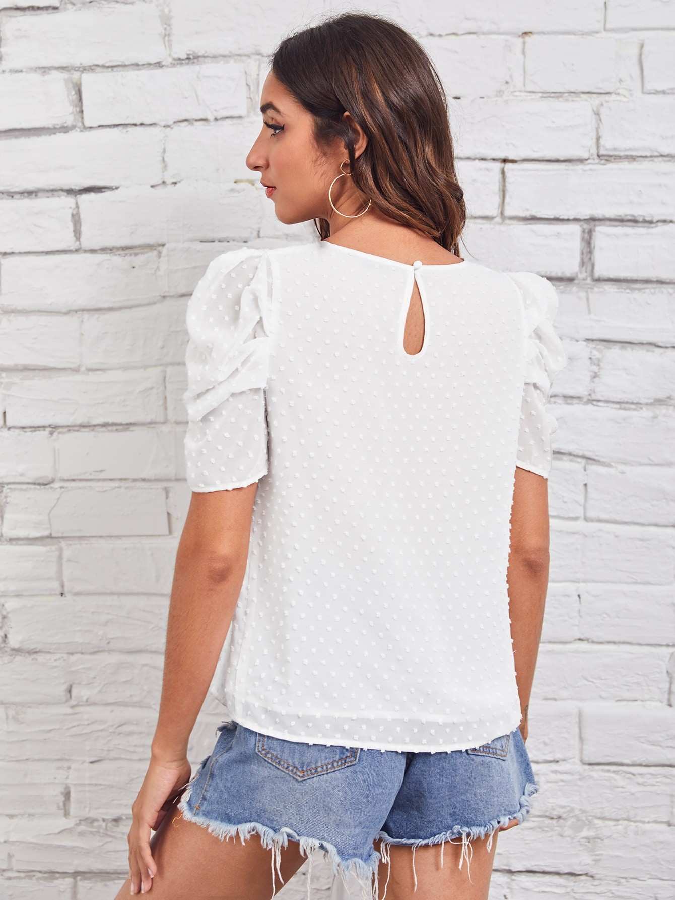 Keyhole Back Puff Sleeve Swiss Dot Chiffon Top