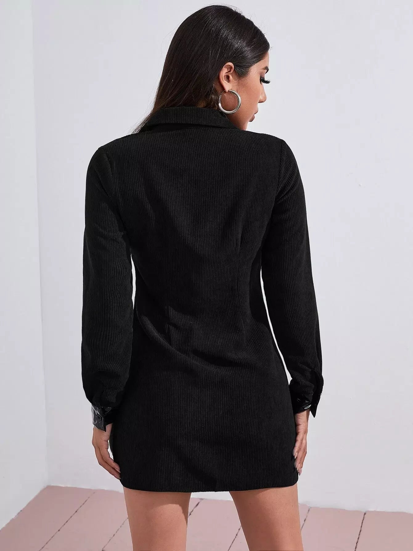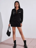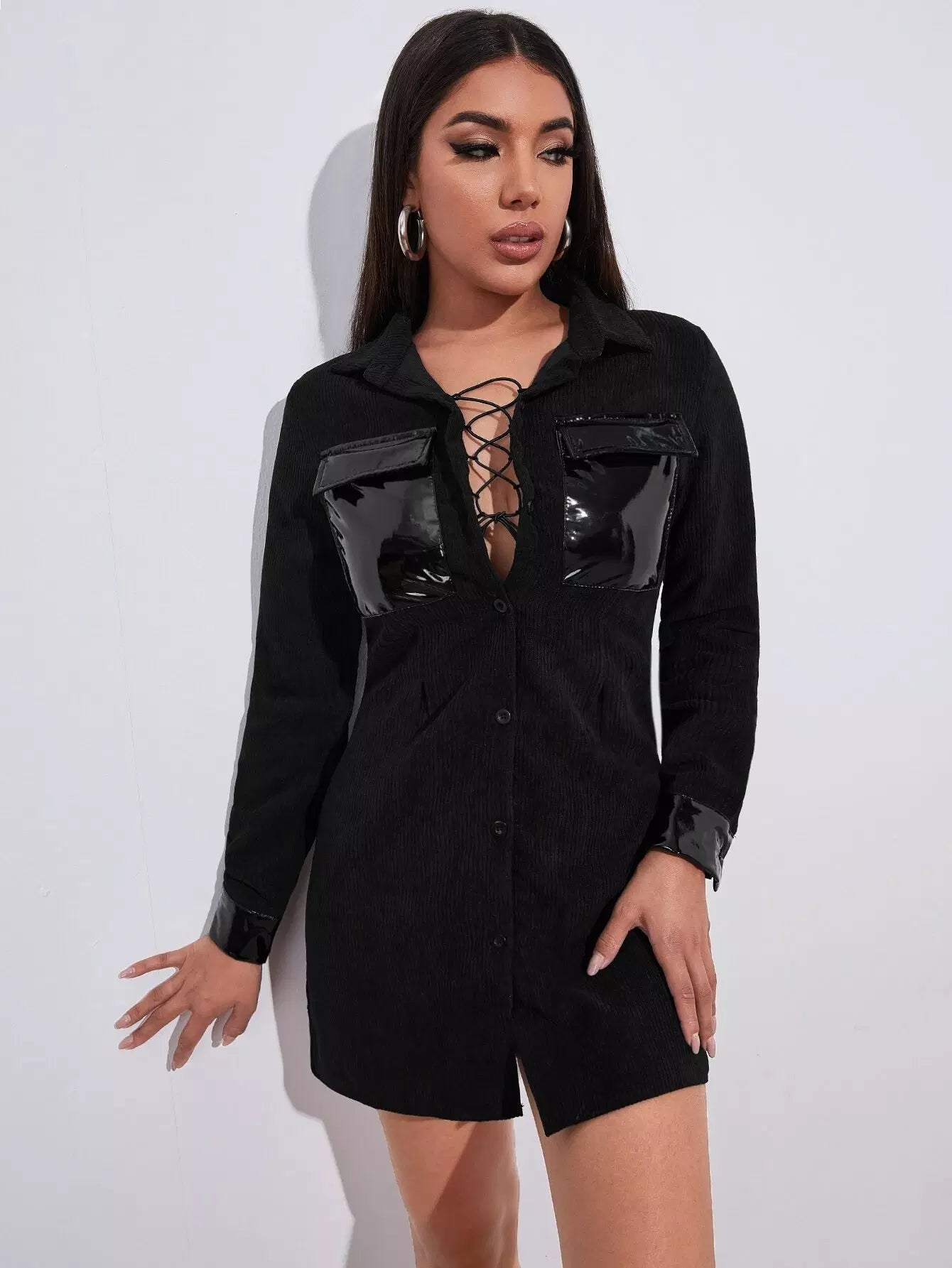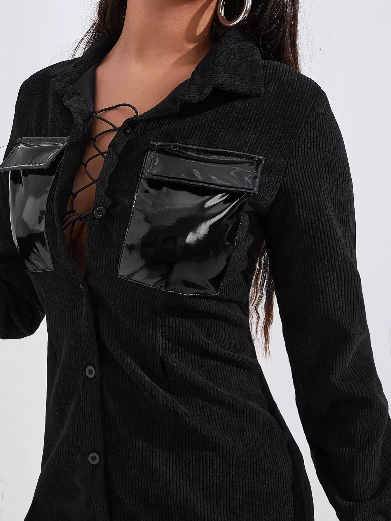 Lace Up Knot Leather Look Flap Pocket Cord Dress