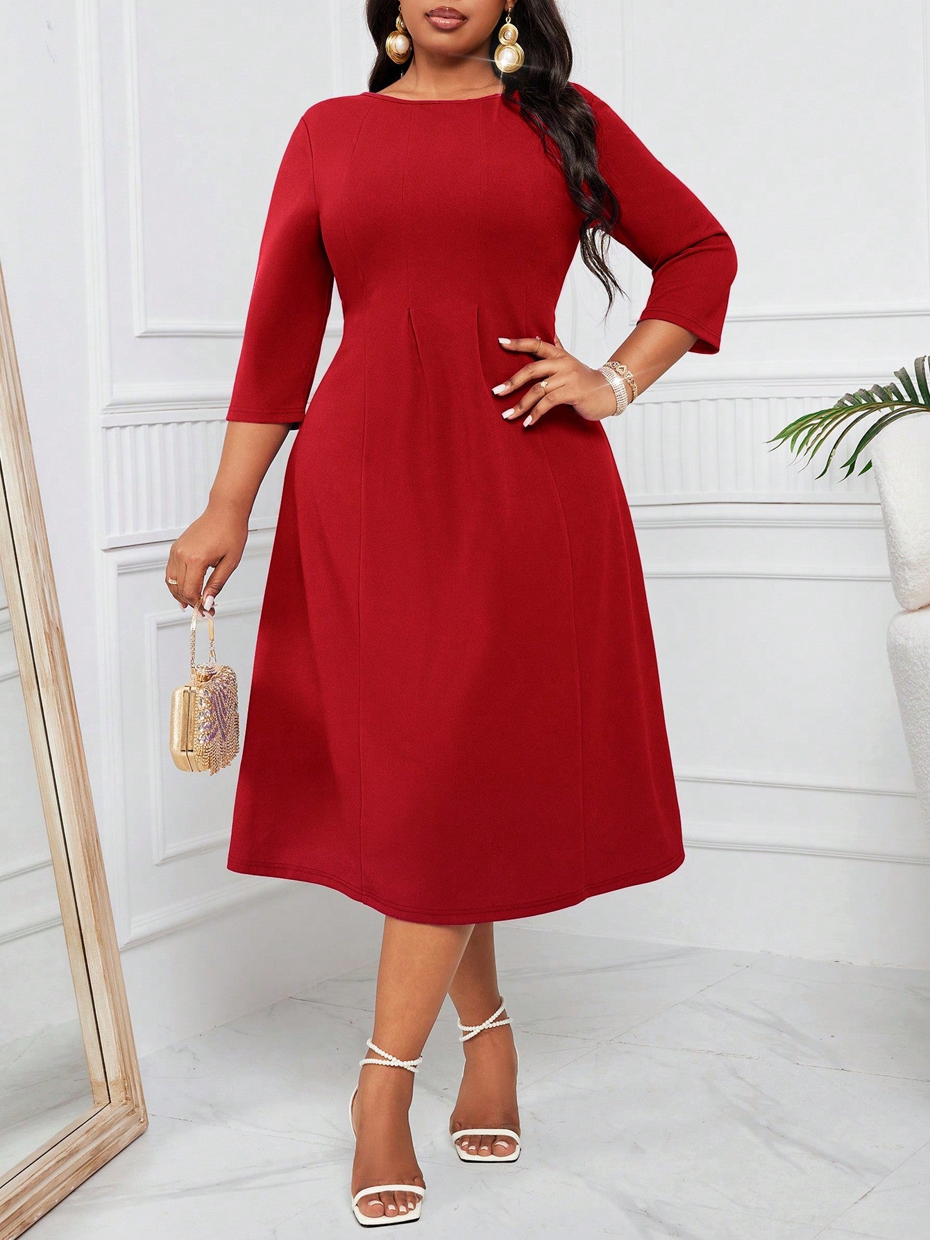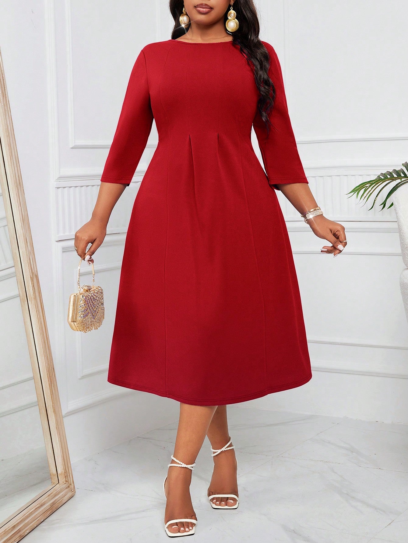 Lady Plus Size Women's Elegant Commuting Purple Pleated A-Line Midi Dress With Waistband And Mid-Length