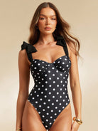 L'Amorae Black And White Polka Dot Printed Retro Vintage Chiffon Shoulder Bow Tie Beach Outfit One Piece